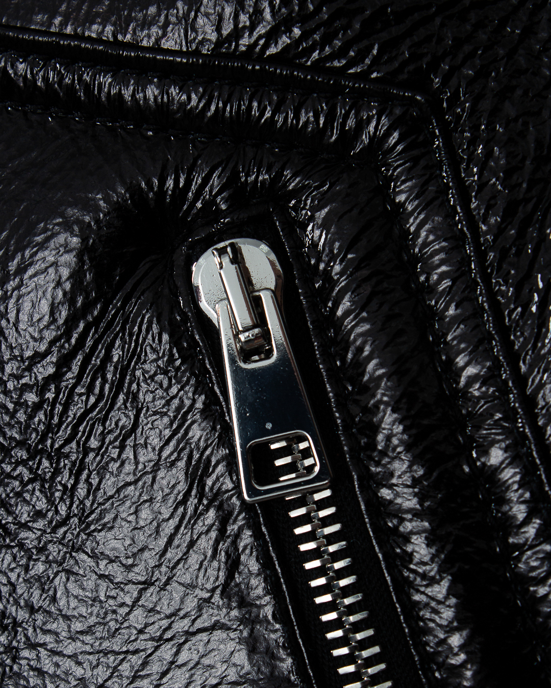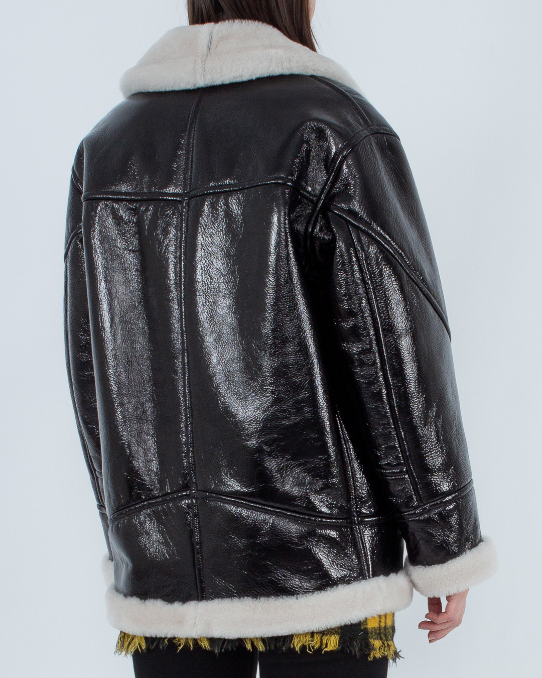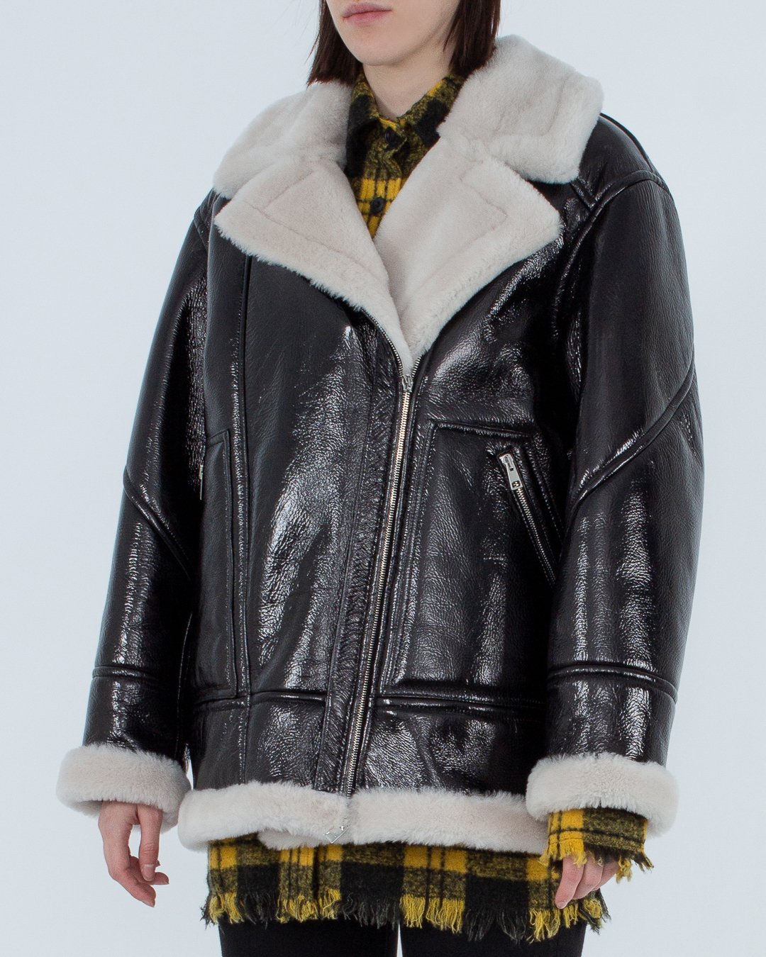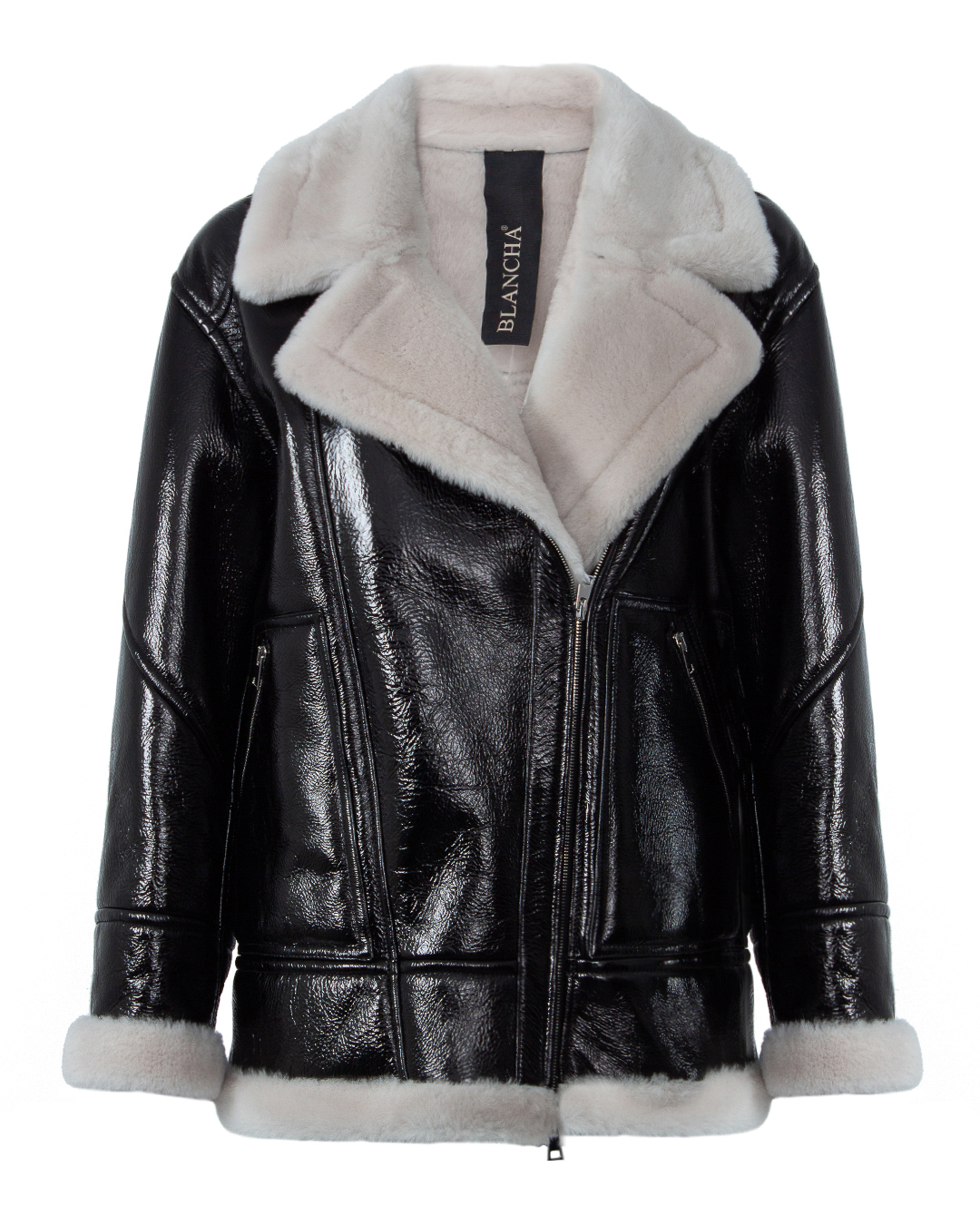 Дубленка BLANCHA выполнена из эффектной лаковой кожи в черном цвете с мягким внутренним мехом из овчины. Прямой слегка объемный силуэт со смещенной застежкой на молнию дополнен отложным воротником и двумя карманами по бокам.