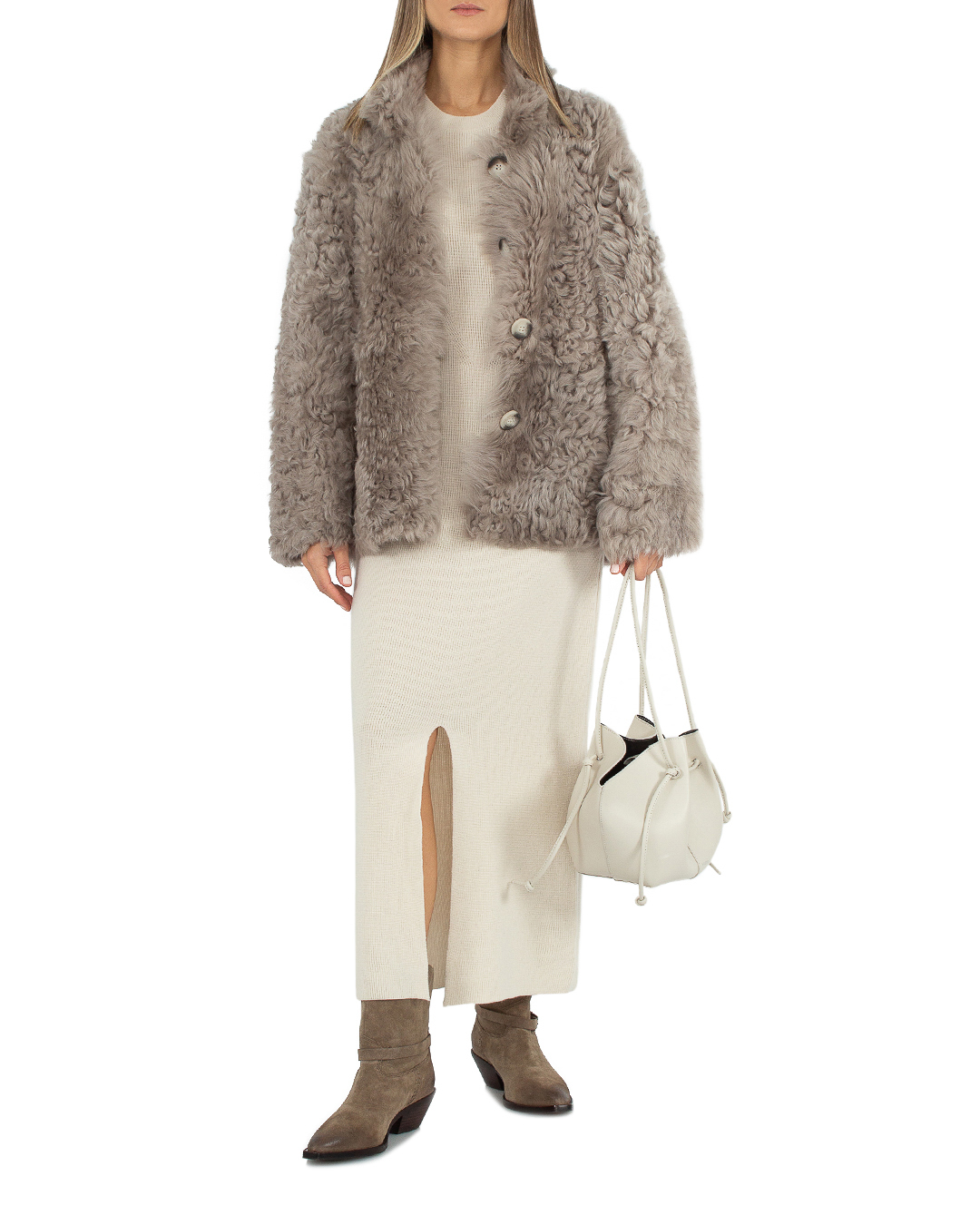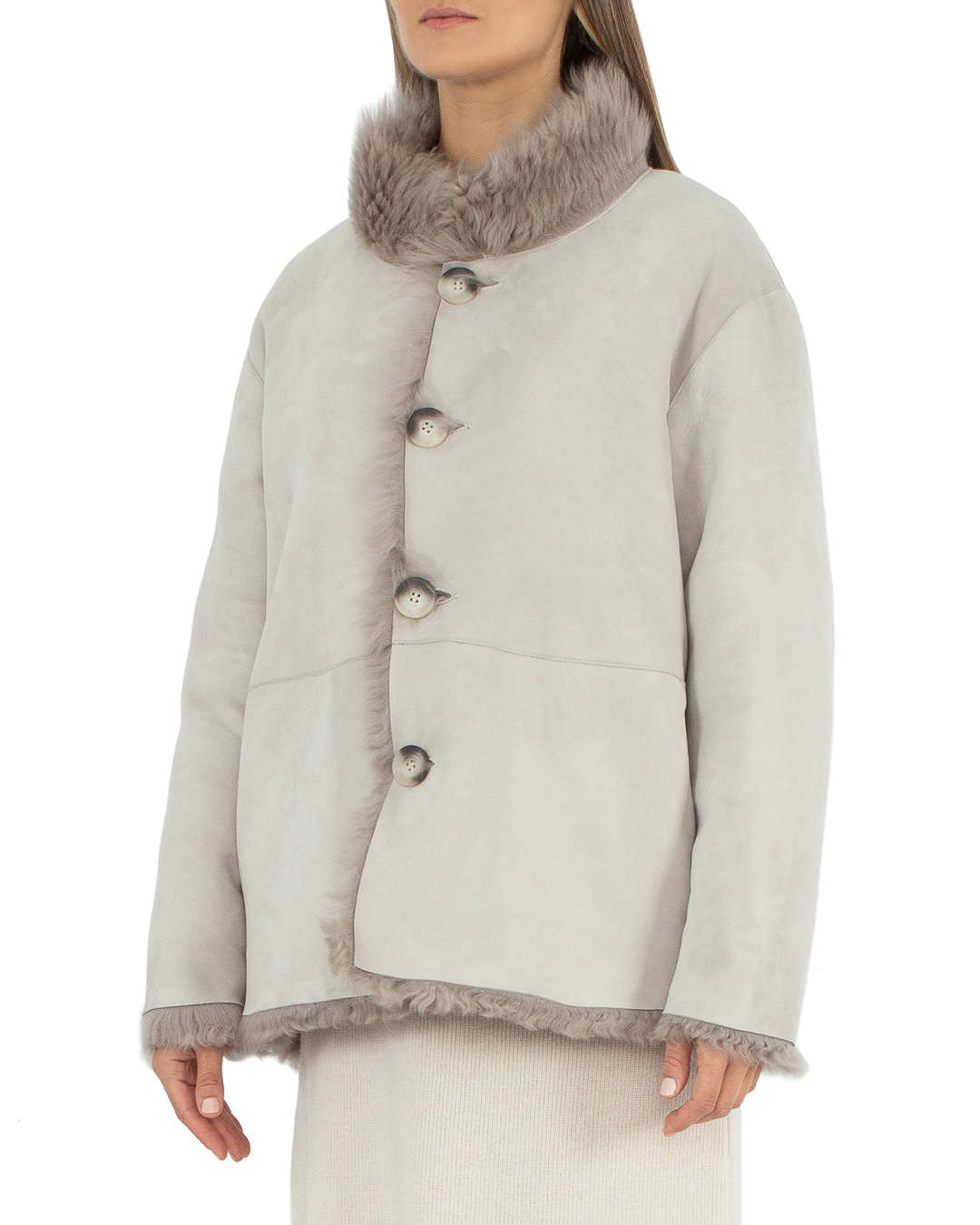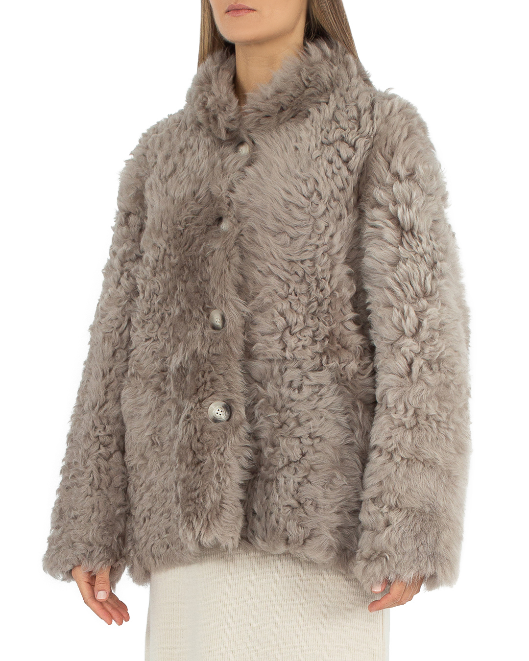 Эта дублёнка — воплощение элегантности и изысканности, подчёркивающее врождённое чувство стиля своей обладательницы. Изделие выполнено в изумительном бежевом оттенке, который придаёт ему глубокую текстуру и совершает его обладательницу центром внимания. Основной материал обладает нежной, но массивной фактурой благодаря естественным завиткам овчины, что создаёт интересный визуальный эффект и способствует отличной теплоизоляции. Элегантный прямой силуэт дублёнки делает её универсальной и уместной в любой обстановке, от городской прогулки до вечернего выхода. Воротник-стойка добавляет ноту изысканности и защищает от холодного ветра, создавая эффект завершённого образа. Прорезные карманы на карманах предусмотрительно интегрированы в крой дублёнки, предлагая функциональность, не нарушая эстетическую гармонию дизайна. Застёжка на крупных пуговицах удачно подчёркивает структурность модели, добавляя к ней дополнительный акцент, который привлекает внимание и придаёт текстурную сложность этой изысканной верхней одежде.