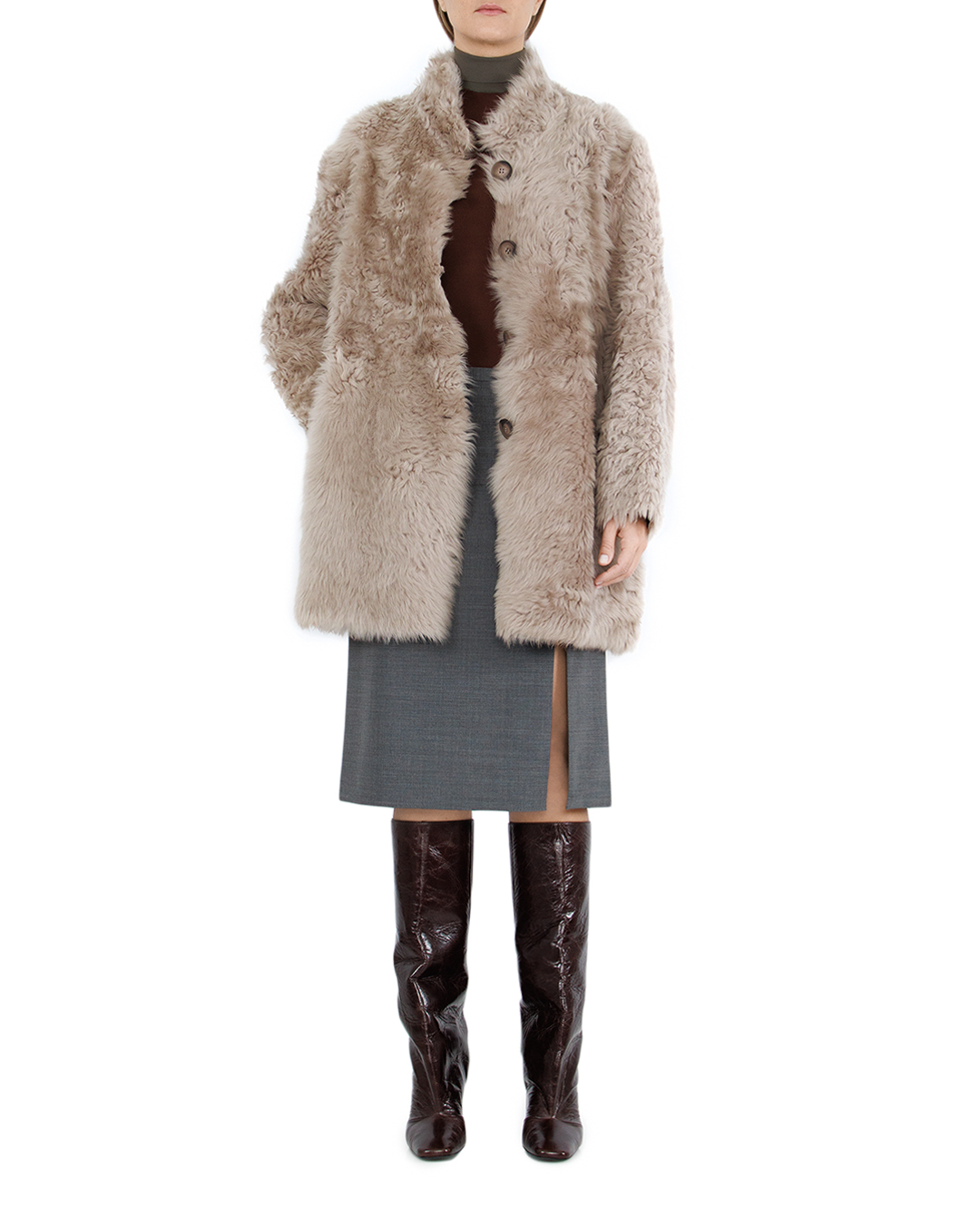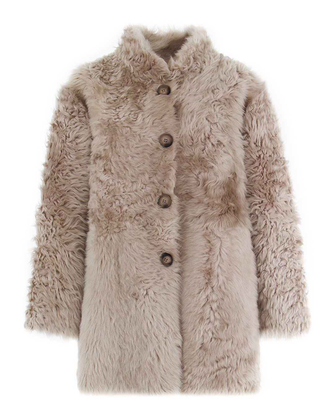 Дубленка с воротником стойкой из натуральной овчины. Двусторонняя модель с застежкой на пуговицы дополнена двумя вертикальными карманами. Изделие прекрасно сочетается с свитером из шерсти с высоким воротником.