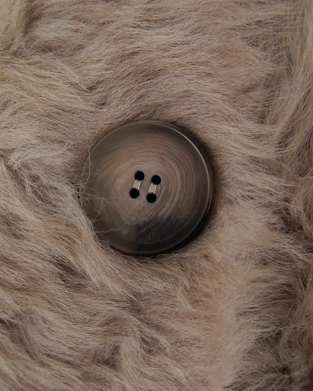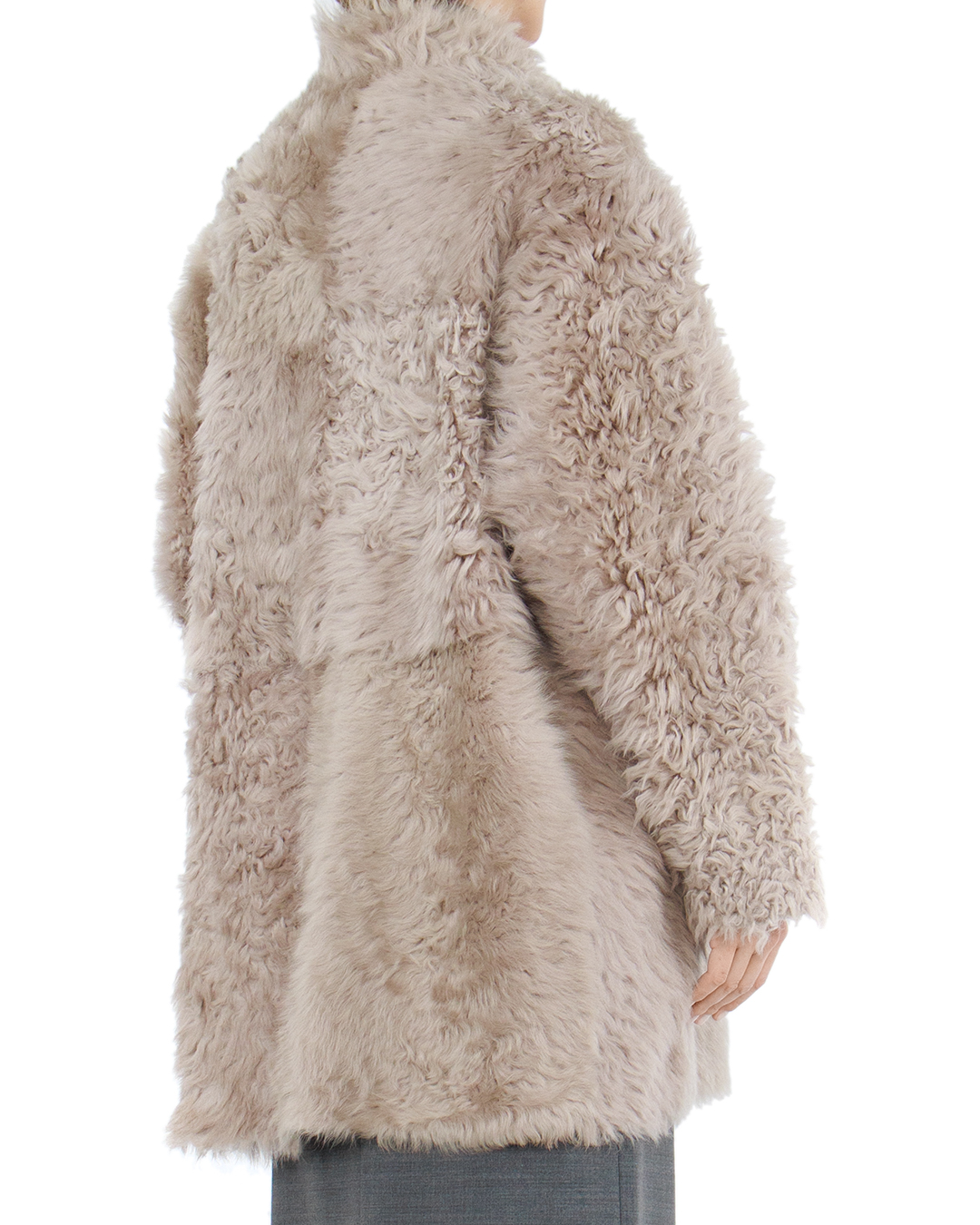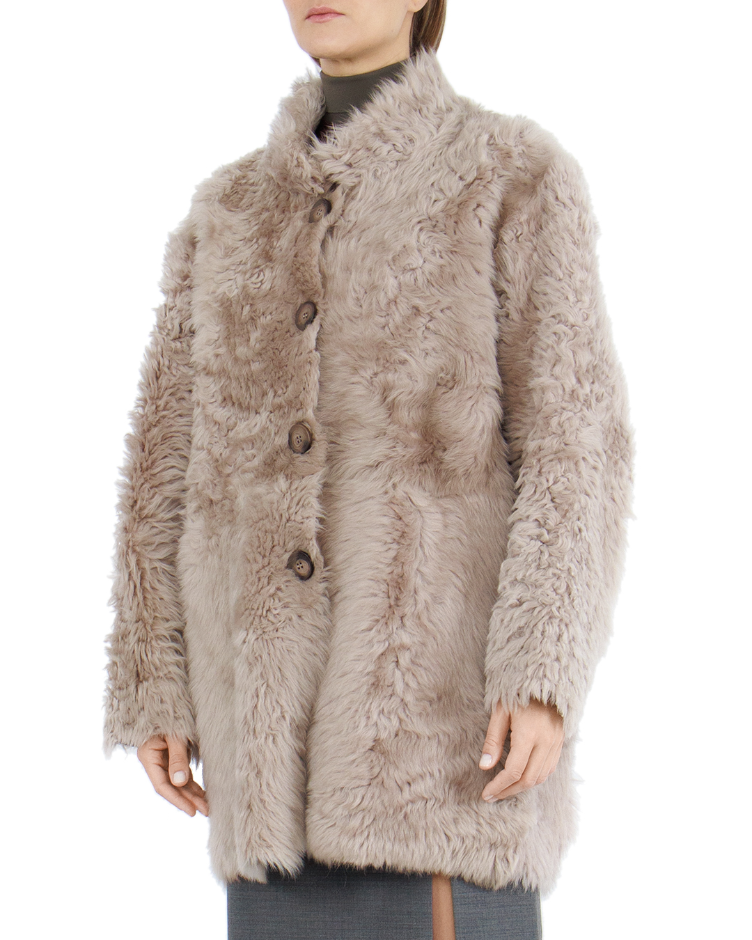 Эта дублёнка олицетворяет собой истинное искусство дизайна, сочетающее роскошь и функциональность. Её изысканный светло-бежевый оттенок придаёт модели утончённый и универсальный вид, который органично впишется в любой гардероб. Материал из нежнейшей овчины создаёт объемную, тактильно приятную текстуру, обеспечивая идеальное сочетание теплоты и стиля. Эффектные натуральные завитки подчёркивают объём и делают её визуально динамичной, добавляя элемент игривости в элегантное исполнение. Воротник-стойка обеспечивает не только тепло, но и изысканную форму изделия, подчёркивая линии шеи и дополняя общий образ современностью. Прорезные боковые карманы увеличивают функциональность модели, оставаясь одновременно практически незаметными и не отвлекая внимание от общего силуэта. Крупные пуговицы стройно выстраивают центральную линию изделия, добавляя акцент на вертикали и создавая элегантный контраст с мягким мехом. Этот изысканный акцент на застёжке позволяет создавать как более формальные, так и расслабленные образы, адаптируя дублёнку под различные стили и случаи.