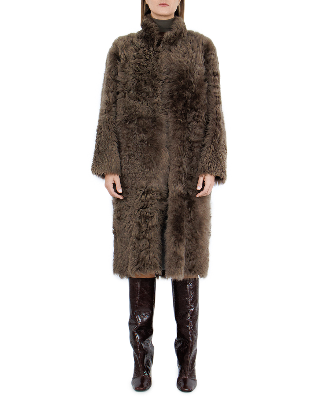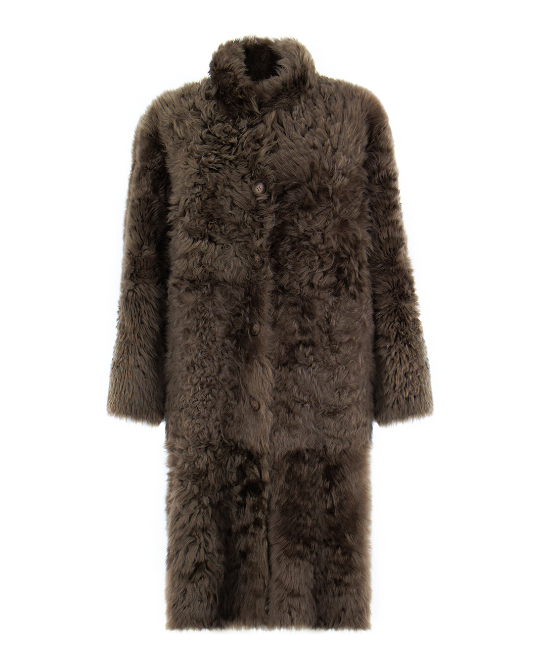 Эта элегантная дублёнка создаёт впечатление настоящей роскоши и утончённого вкуса. Её глубокий коричневый оттенок излучает тепло и уют, идеально вписываясь в палитру зимнего гардероба современного модника. Модель обладает удлинённым силуэтом, что придаёт владельцу особую грацию и подчёркивает стройность фигуры. Прямой крой обеспечивает идеальную посадку на любых типах фигуры, деликатно обрамляя силуэт. Материал из высококачественной овчины отшлифован до мягкости бархата, что не только обеспечивает неповторимую тепловую защиту, но и создаёт привлекательный визуальный эффект. Изящные завитки меха добавляют текстурный контраст и динамичность, создавая интересный визуальный ритм по всей длине изделия. Воротник-стойка служит не только функциональной защитой от ветра, но и стильным акцентом, который гармонично завершает общий образ. Благодаря скрытой функциональности карманов и пуговиц, дублёнка остаётся минималистичной и подчёркнуто стильной.