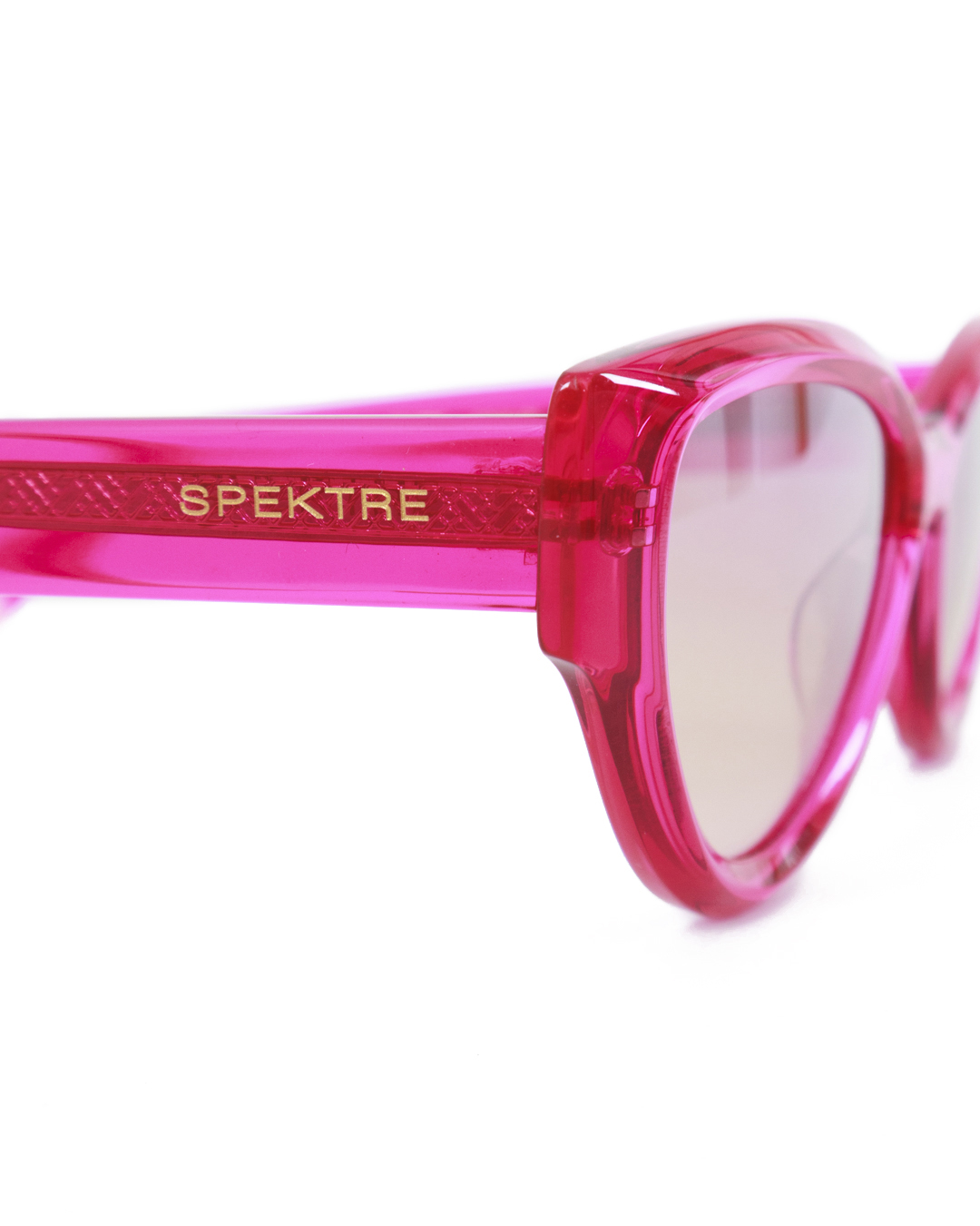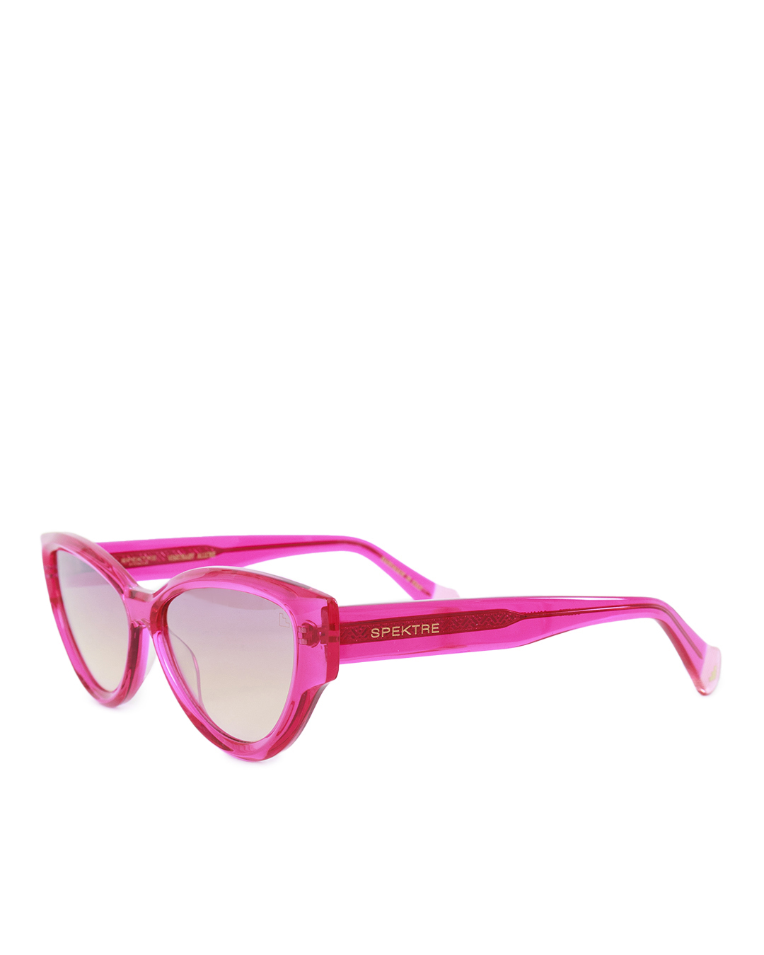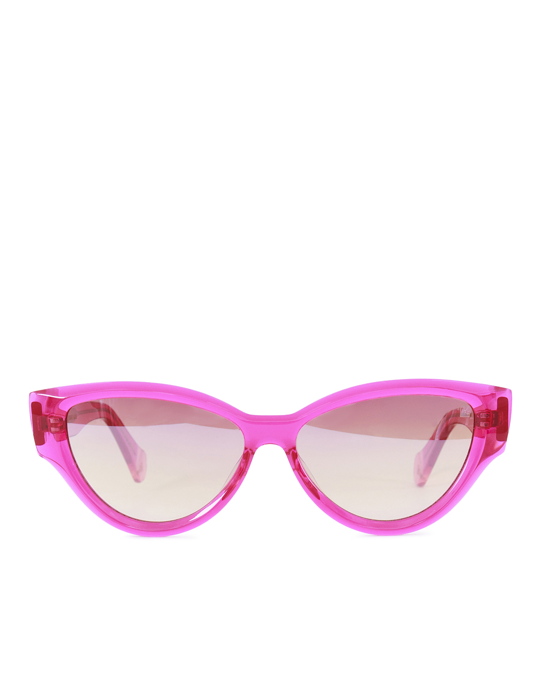 Розовые солнцезащитные очки с градиентными линзами блокируют 100% ультрафиолетовых лучей, не снижают контрастность изображения и не утомляют глаза. Оправа аксессуара изготовлена вручную из полупрозрачного гипоаллергенного ацетата. Узкие дужки украшены миниатюрными золотистыми сердцами.