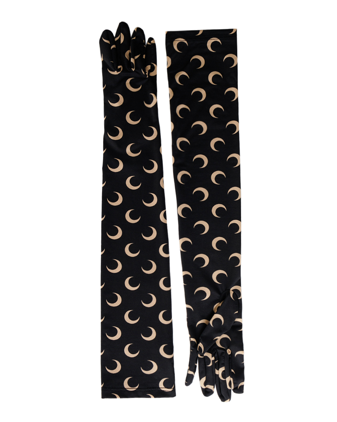 Эти перчатки — настоящая находка для ценителей утонченного стиля и элегантности. Они выполнены из гладкой эластичной ткани, которая обтекает руку, создавая идеальный силуэт. Принт с изящными полумесяцами на черном фоне добавляет динамику и глубину, создавая гипнотизирующий визуальный эффект. Этот рисунок подчеркивает индивидуальность и делает перчатки выразительным акцентом в образе. Удлиненный дизайн достигает середины предплечья, добавляя роскоши и элегантности. Перчатки легко сочетаются с вечерними и кэжуал комплектами, придавая образу нотку загадочности и изысканности. Эти стильные аксессуары не только защищают руки, но и служат завершением продуманного и эффектного образа, подчеркивая уверенность и утонченное чувство стиля владельца.