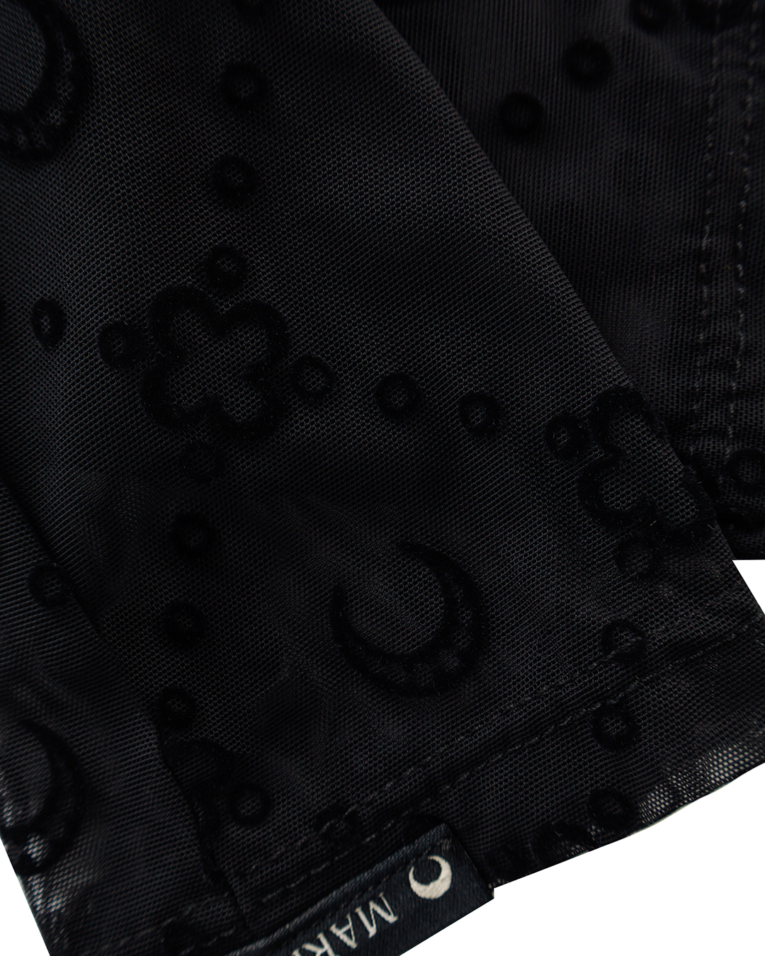 Эти перчатки — воплощение элегантности и изысканности. Выполненные из полупрозрачной ткани, они создают утонченный и загадочный образ, идеально подходящий для нестандартных и стильных комплектов. Богатая бархатная аппликация в виде изящных узоров добавляет тактильного изыска и визуального объема. Этот утонченный принт создает глубокий контраст с прозрачной основой, притягивая внимание к каждой детали. Длинный манжет перчаток обеспечивает элегантное удлинение линии руки, добавляя благородства и утонченности. Фирменный логотип, аккуратно размещенный на манжете, подчеркивает уникальность и изысканность изделия. Идеальные для вечерних выходов или особых случаев, эти перчатки станут стильным акцентом в вашем образе, добавляя нотку роскоши и утонченности.