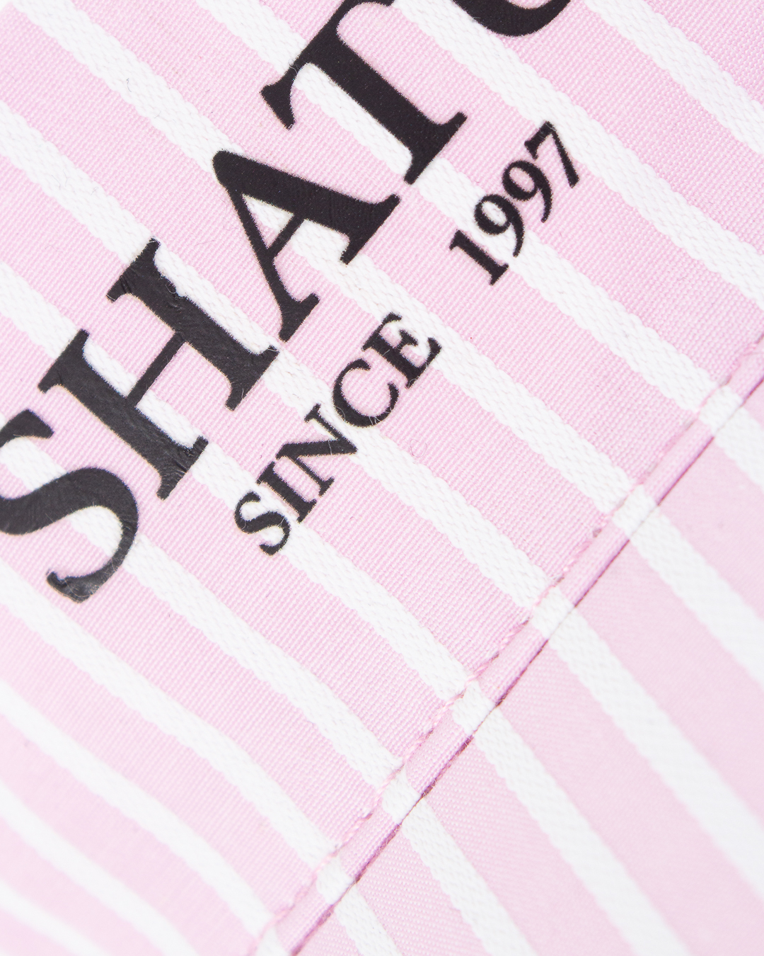 Пляжный козырек Shatu розового оттенка в полоску с принтом логотипа бренда. Аксессуар с эластичной основой и объемным бантом.