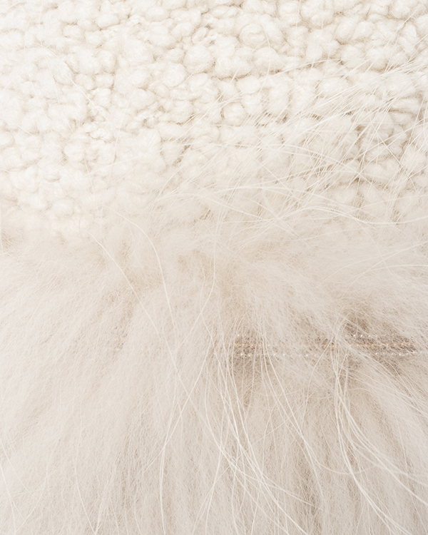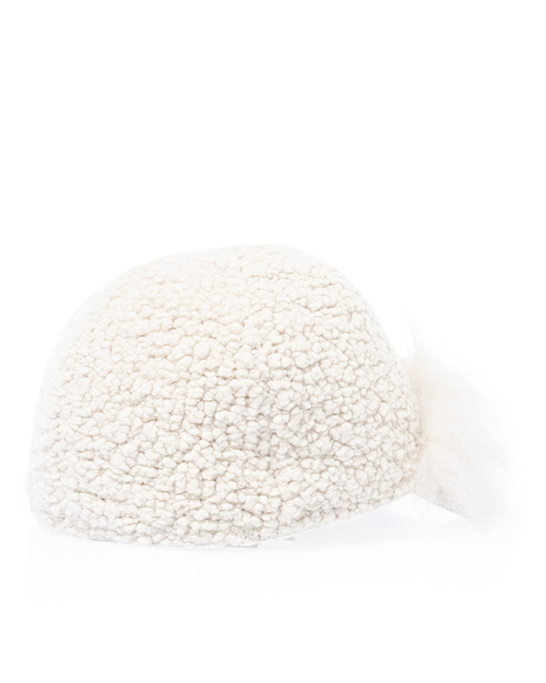 Кепка из валяной шерсти молочного оттенка с отделкой мехом. головной убор дополнен фирменной отделкой нитями монили.