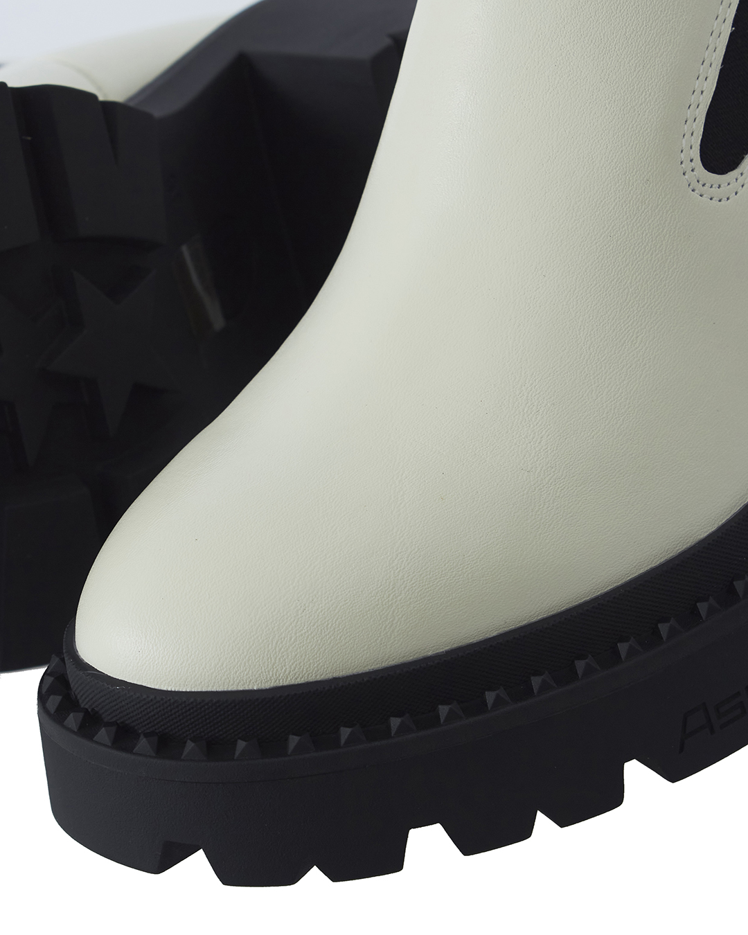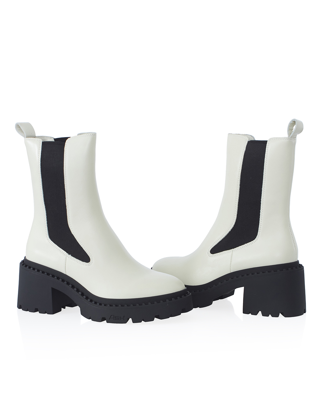 Ботинки NICO удачно сочетают в себе строгость и элегантность. Грубый силуэт челси уравновешивается изящным, но удобным каблуком, переходящим в устойчивую подошву с протектором. Модель выполнена из натуральной кожи молочного цвета с эластичными контрастными вставками в тон подошвы и оборудована петлей на задней части для упрощенного надевания.