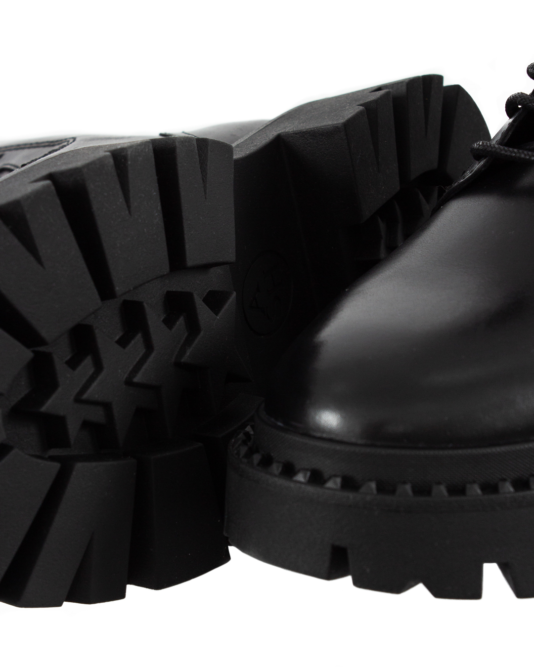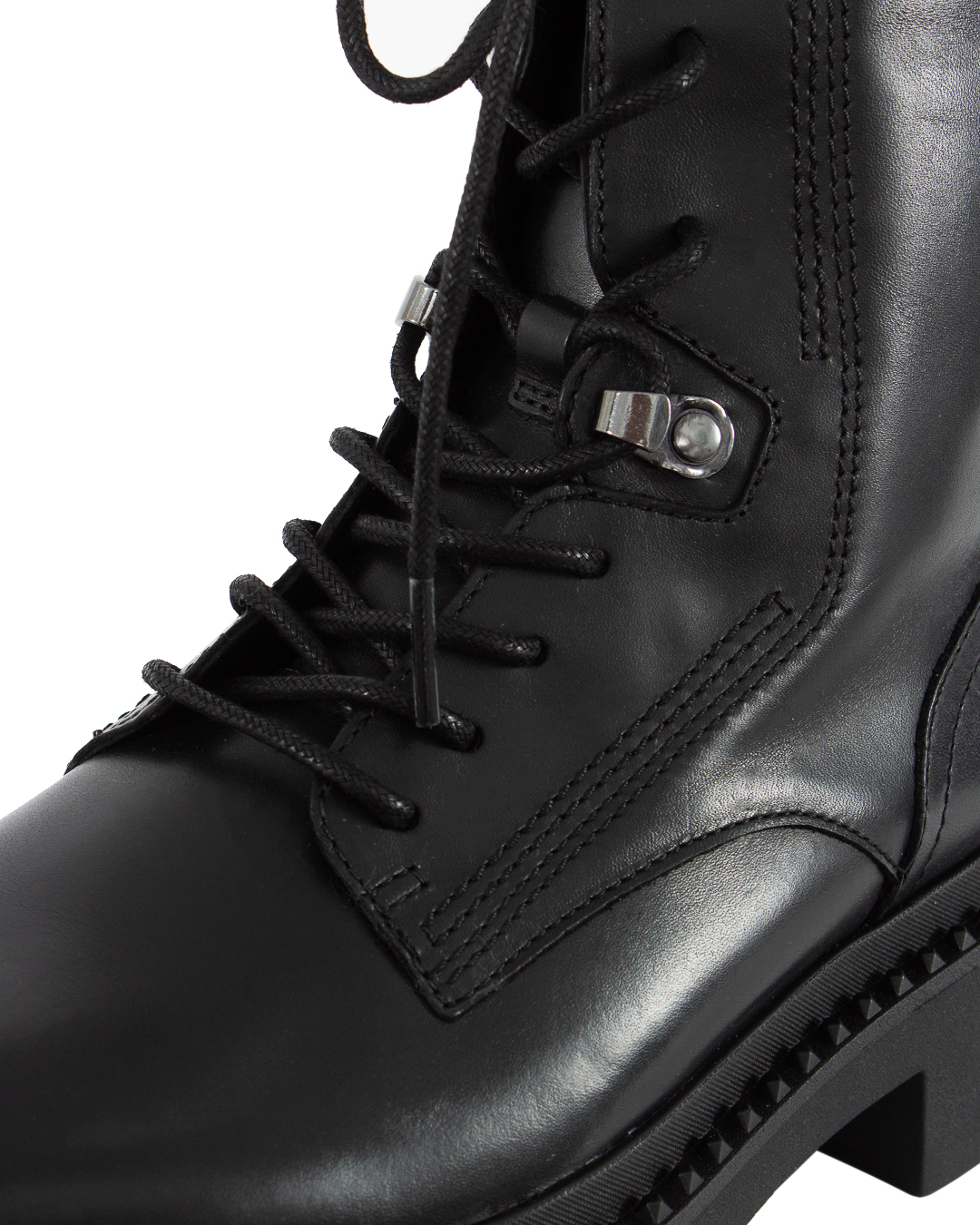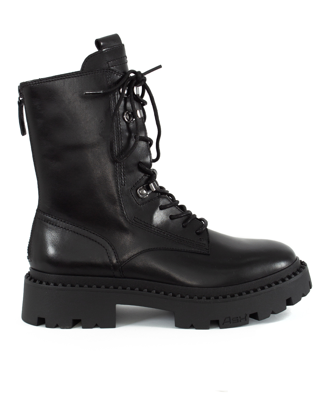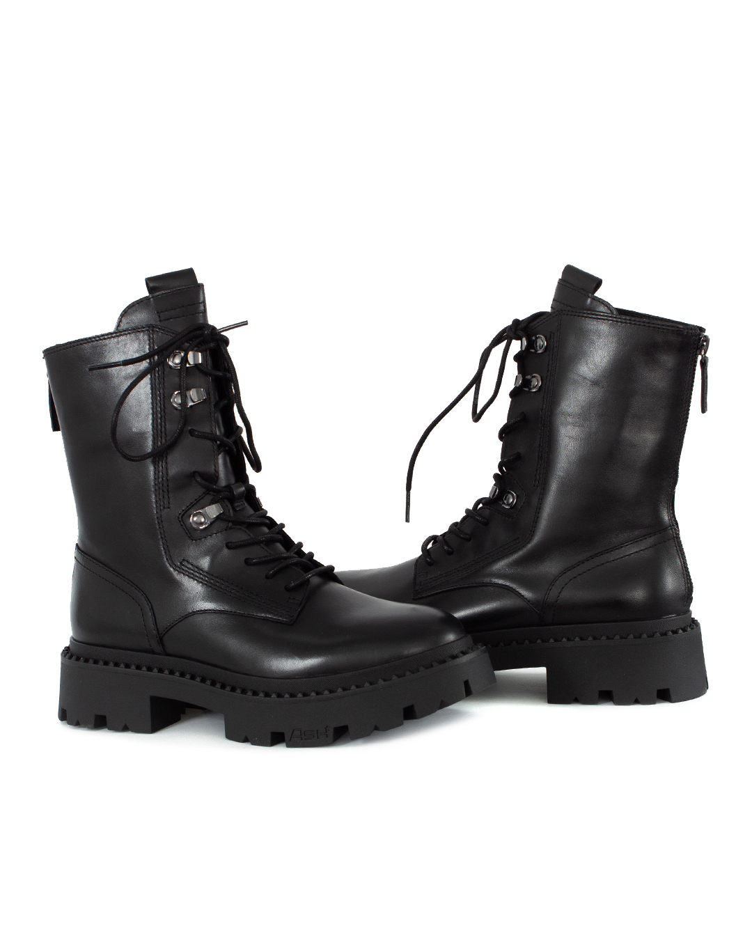 Сапоги ASH из кожи черного цвета. Высокая парка на шнуровке дополнена застежкой на молнию на пятке. Закругленный мыс и резиновая подошва с глубоким протектором.