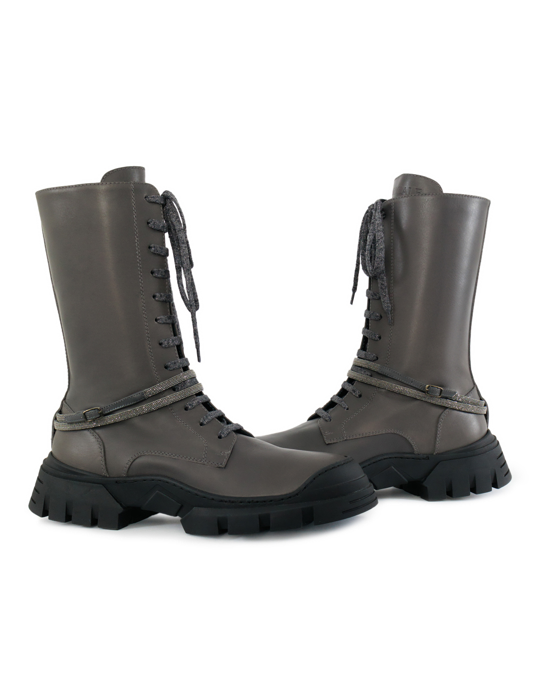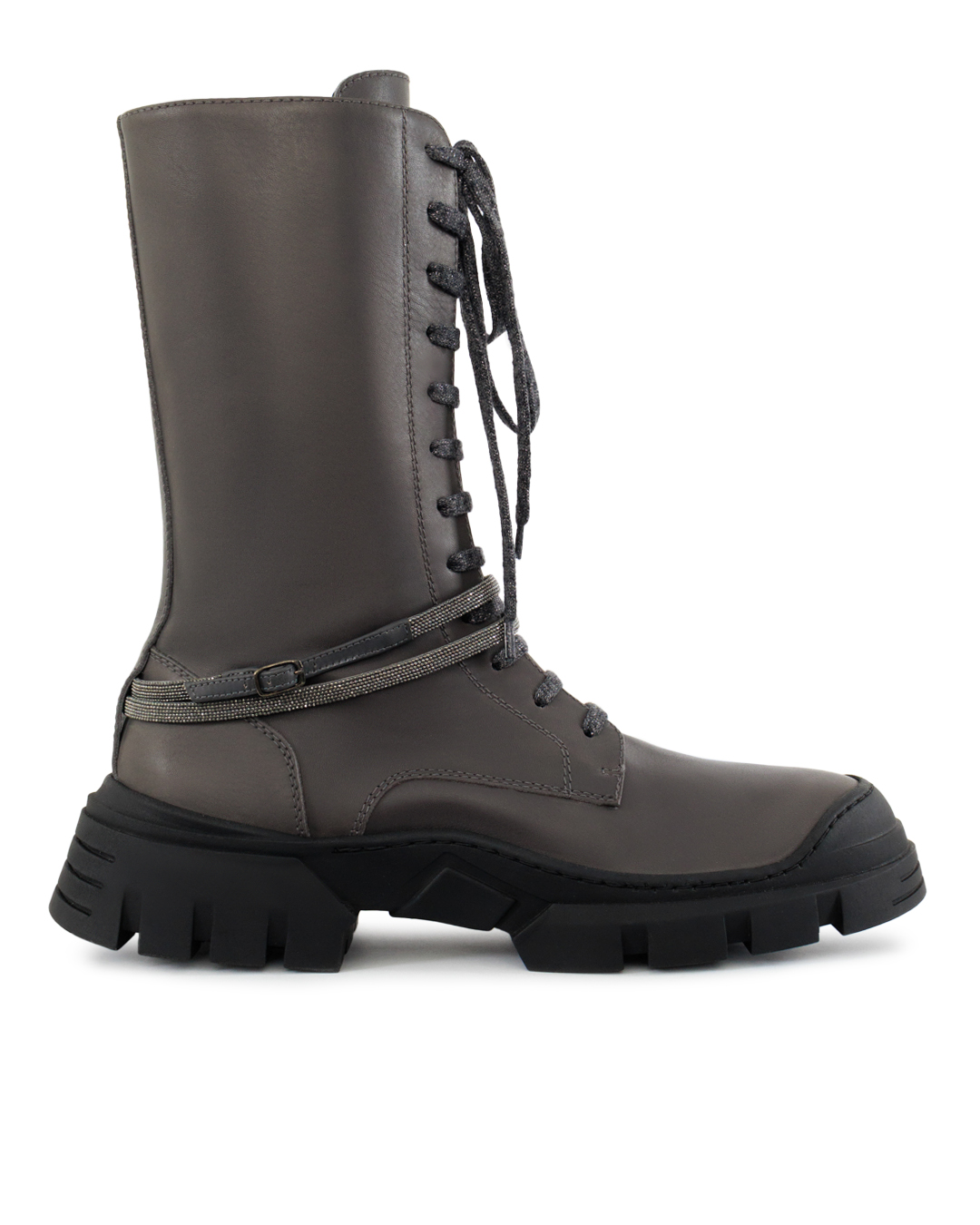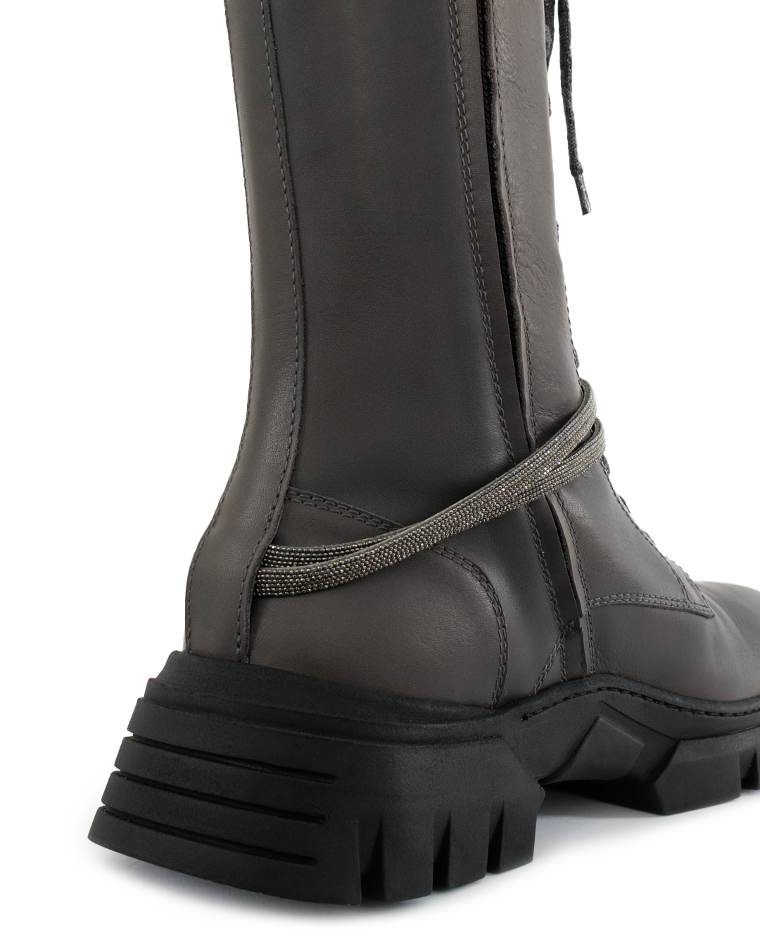 Эти ботинки воплощают утонченную комбинацию брутальности и изысканного вкуса. Выполненные из высококачественной кожи, они имеют гладкую матовую поверхность, которая идеально дополняет их строгость и элегантность. Высокий голенище обеспечивает дополнительную поддержку и комфорт, одновременно придавая образу дерзкую выразительность. Оригинальная шнуровка тонко подчеркивает их функциональность и современный стиль, обеспечивая надежную фиксацию. Плотная резиновая подошва с глубоким протектором не только добавляет практичности за счет устойчивости и долговечности, но и создает смелый акцент, идеально гармонируя с общей эстетикой модели. Края подошвы аккуратно прошиты, что увеличивает прочность и придает изысканный вид. Декоративный ремешок, закрепленный вокруг щиколотки, добавляет нотку авантюризма и завершает образ, создавая уникальный баланс между классическим шармом и актуальными модными тенденциями. Это идеальная пара для тех, кто ценит комфорт и стремится выразить уникальность через детали.