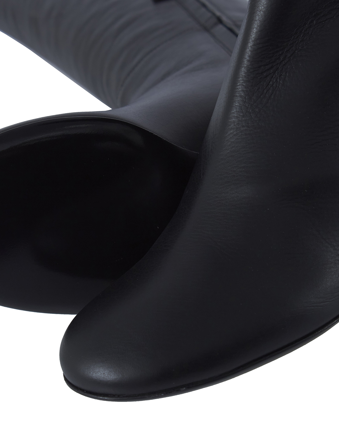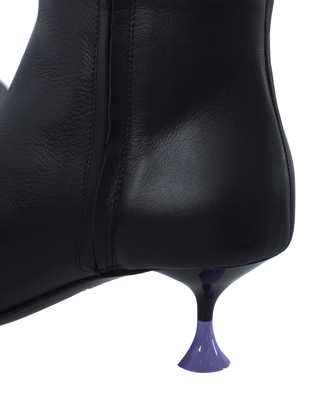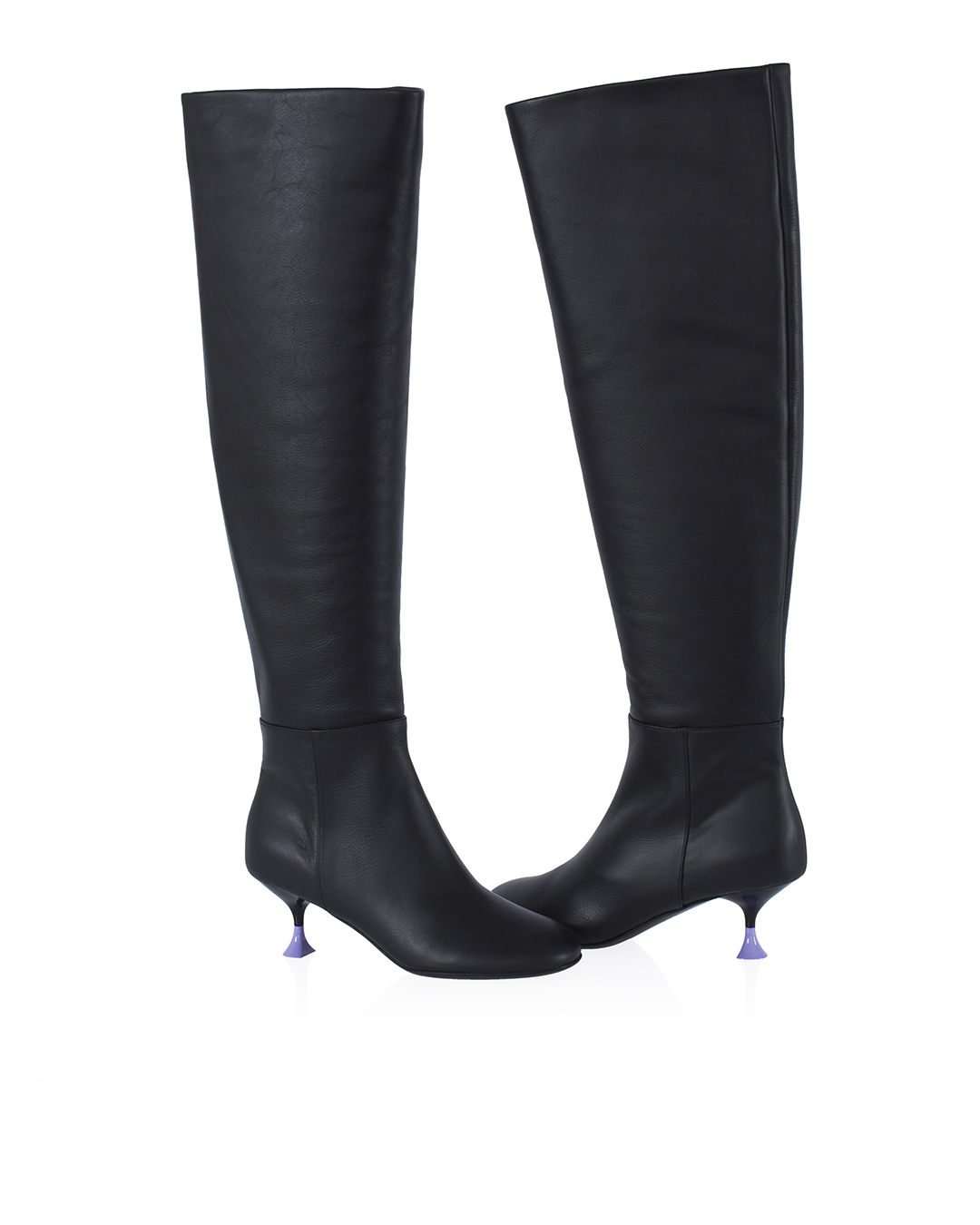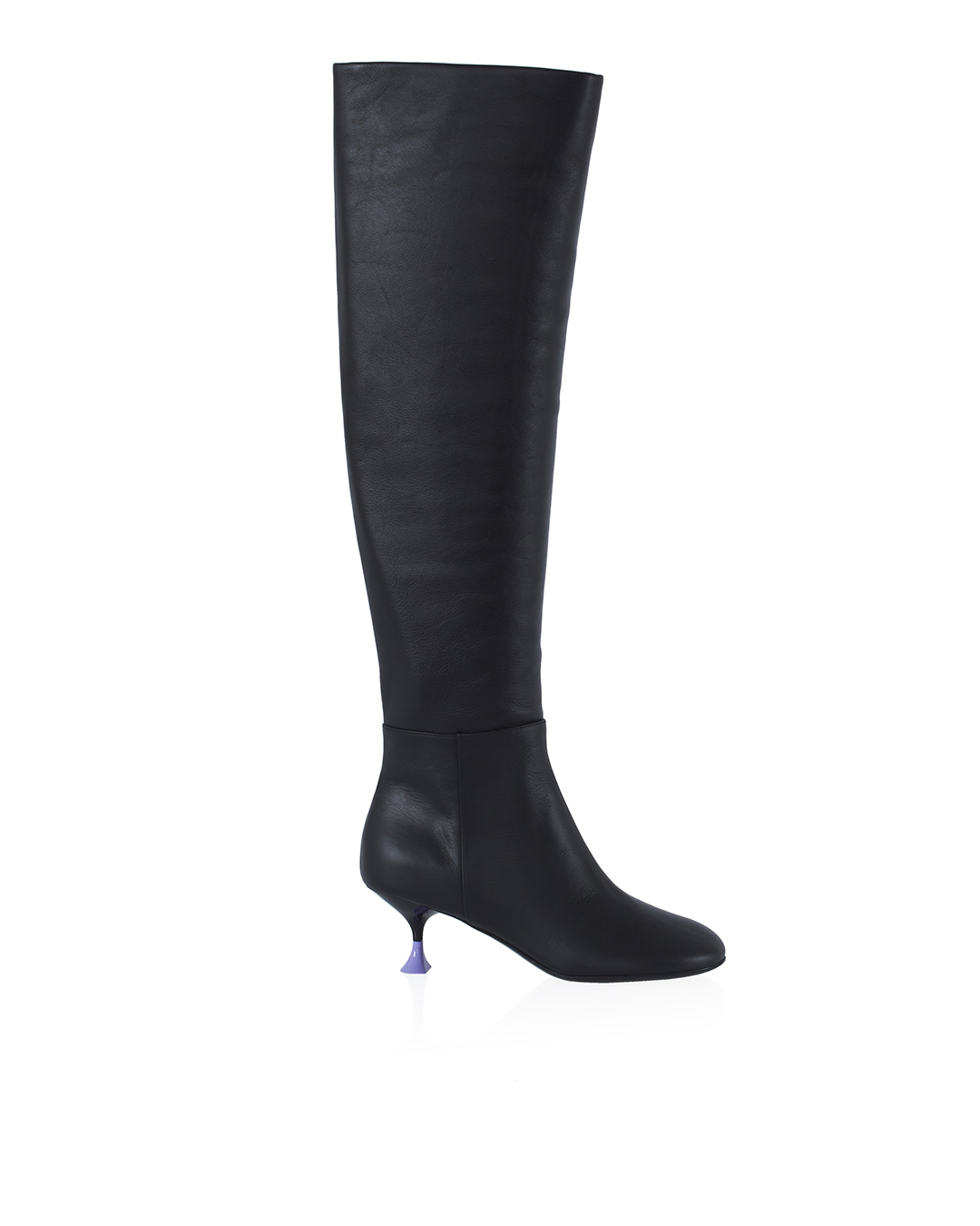 Высокие сапоги из мягкой кожи черного цвета. Пара с закругленным мысом и на акцентном невысоком расклешенном каблуке фиолетового оттенка. Внутренняя кожаная отделка и мягкая удобная стелька.