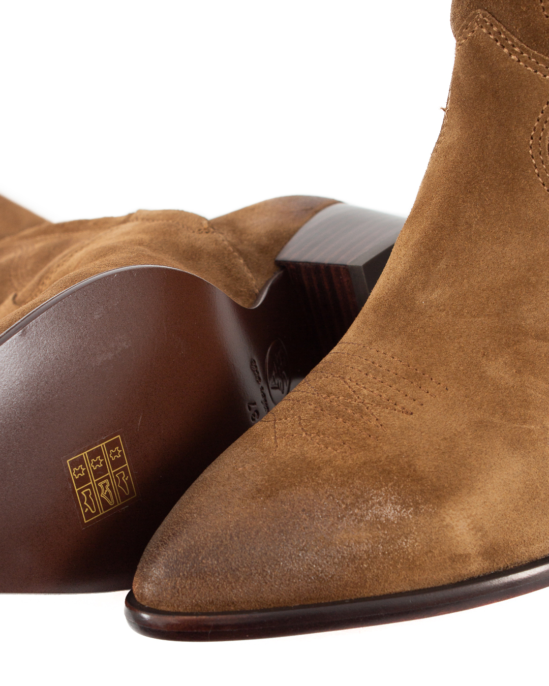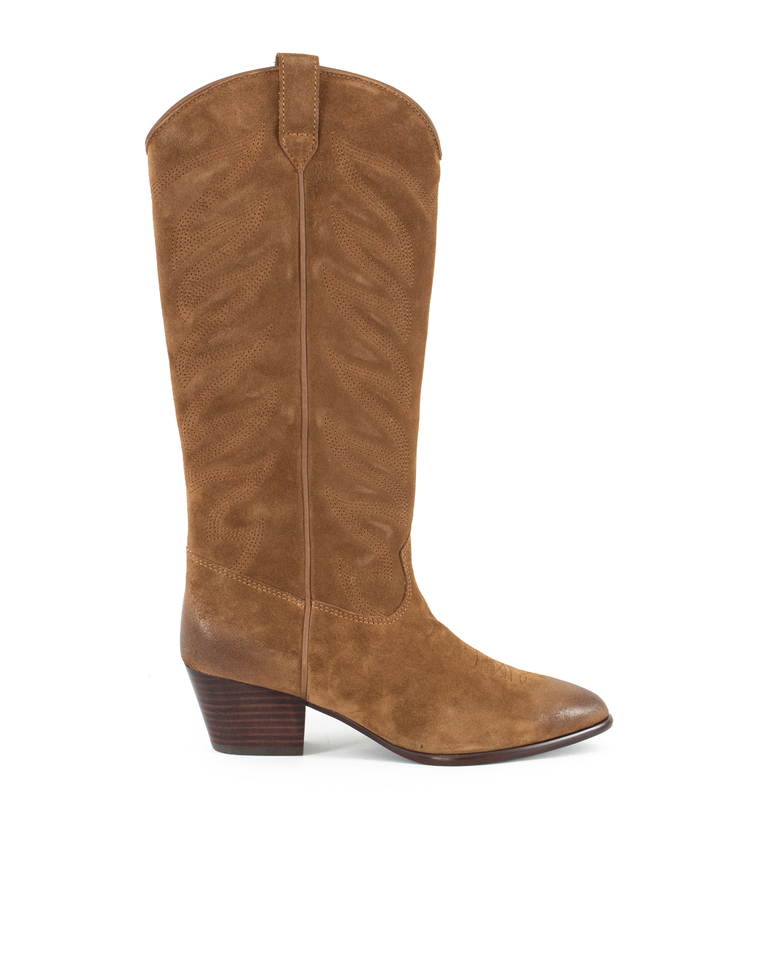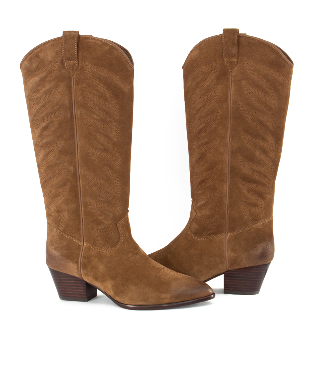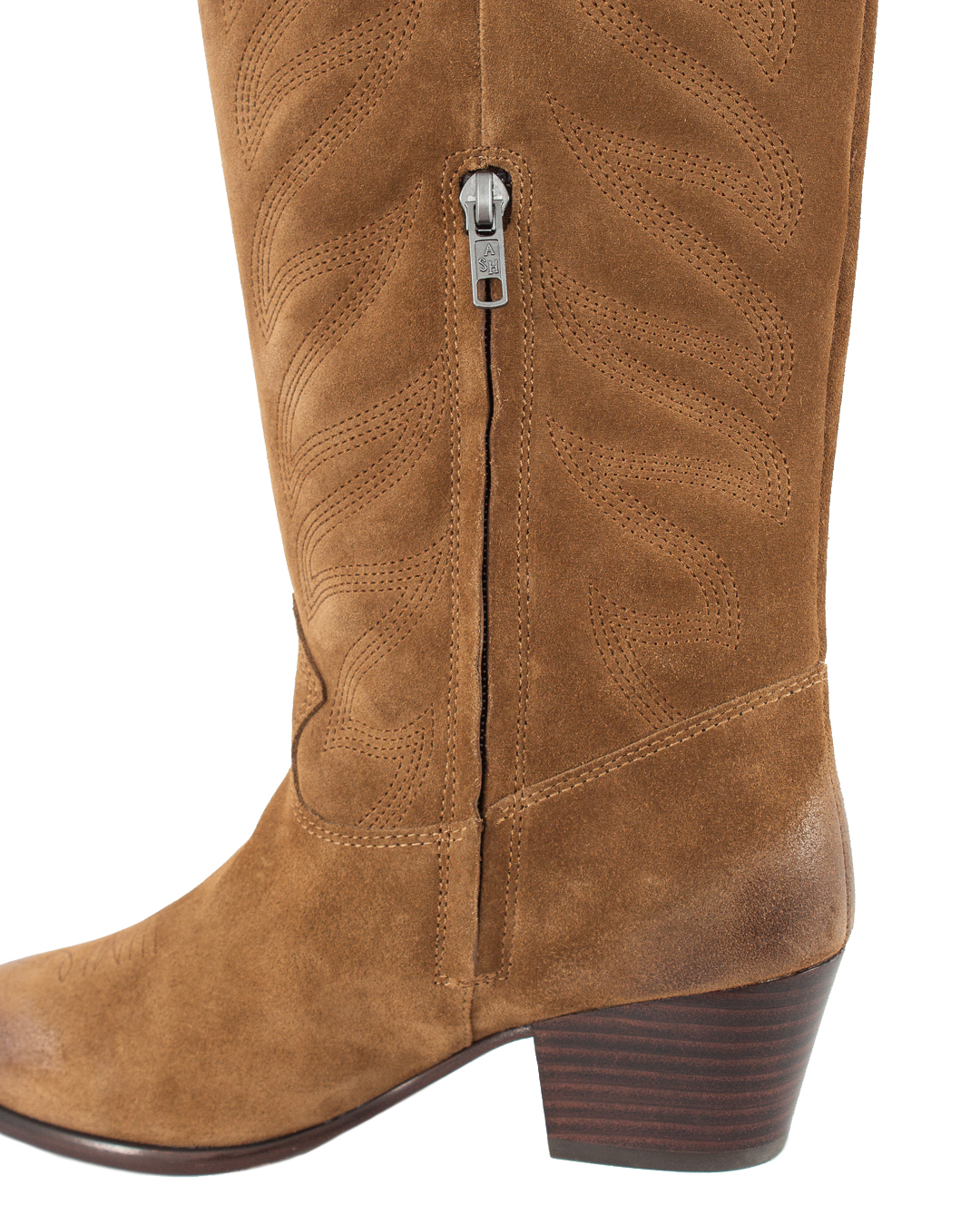 Кожаные высокие сапоги-казаки ASH в коричневом оттенке. Пара с прошитым орнаментом и двумя петлями по бокам. Невысокий наборный каблук и застежка с внутренней стороны обуви.