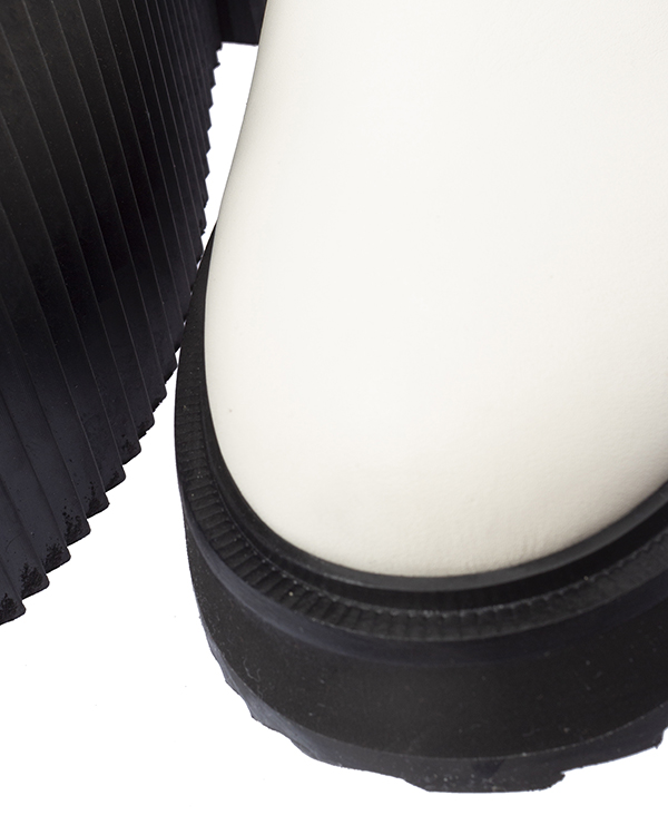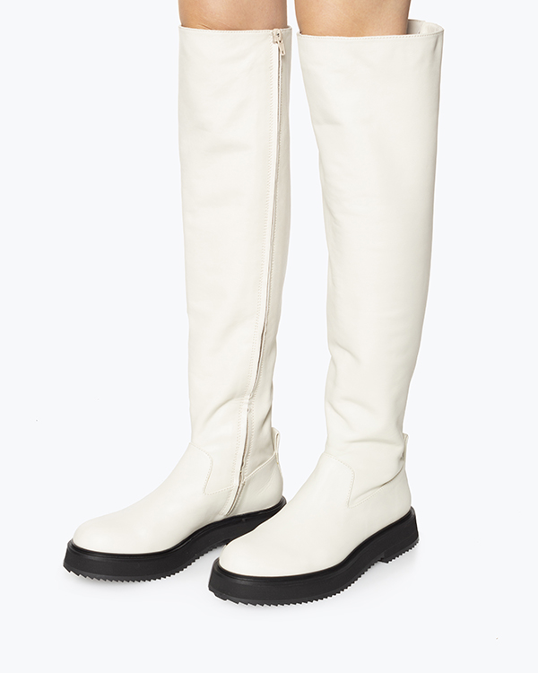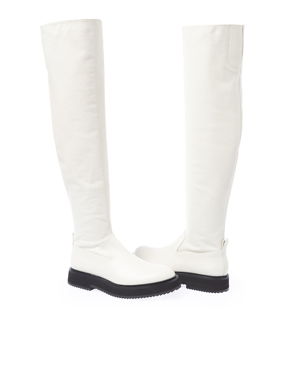 Ботфорты из натуральной мягкой кожи белого цвета. Сапоги на массивной резиновой подошве с протектором. Внутренняя кожаная отделка и мягкая удобная стелька. Застежка на молнию по всей длине сапог.