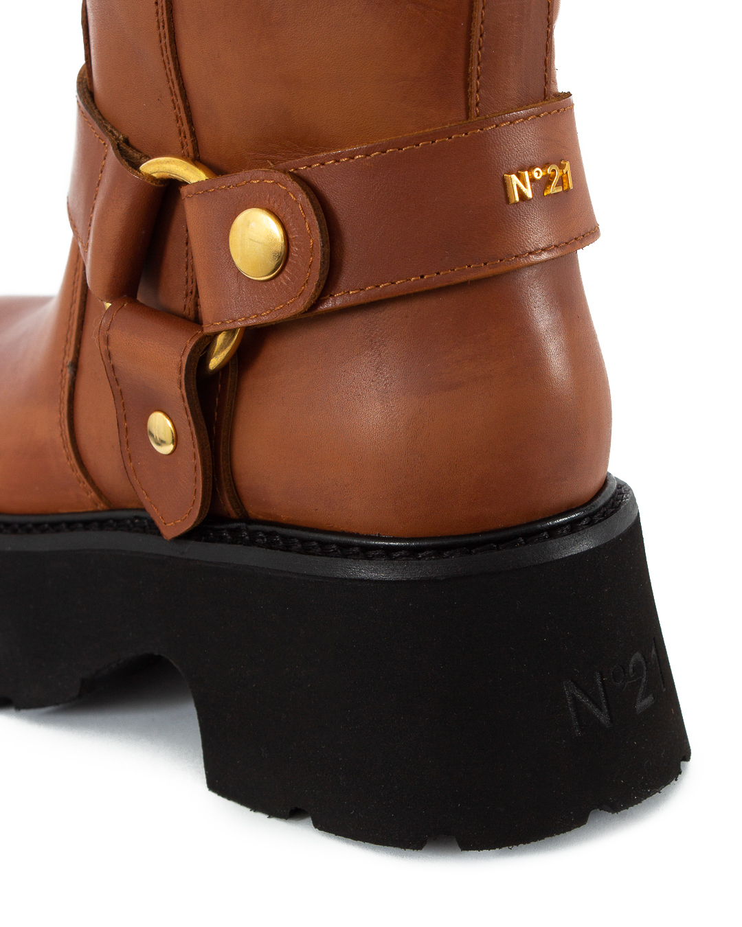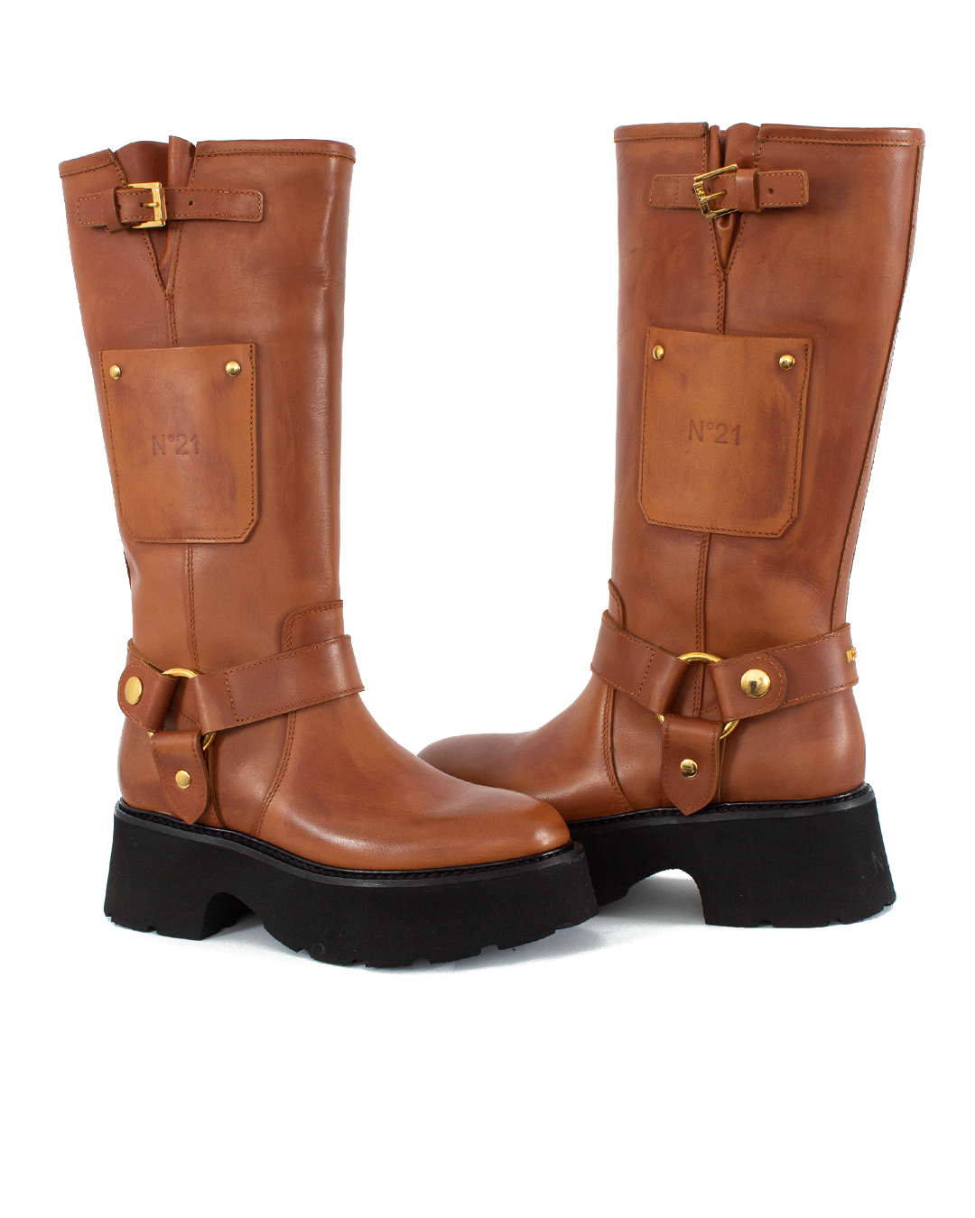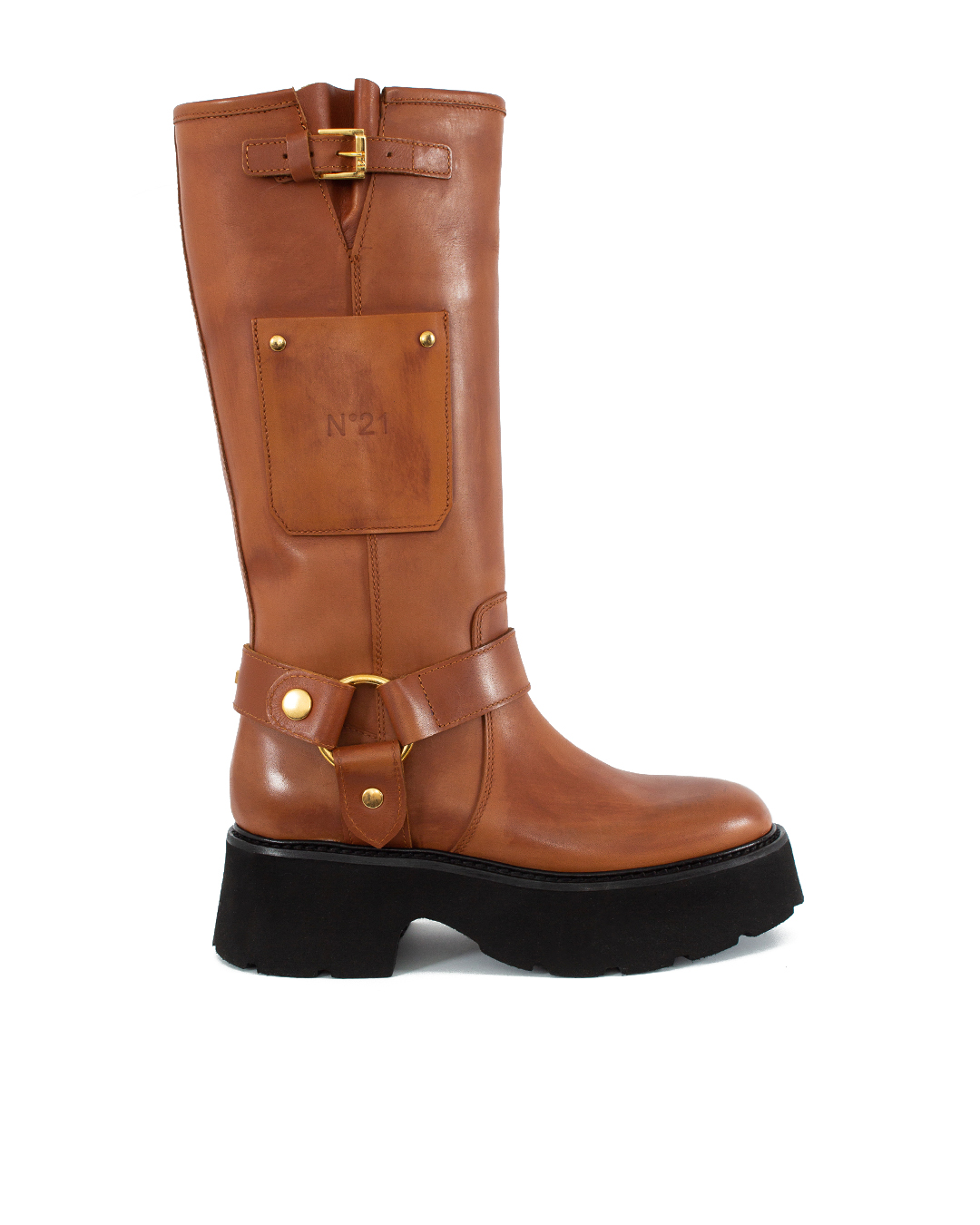 Высокие сапоги № 21 выполнены из кожи. Пара с широким голенищем дополнена кожаными хлястиками и карманом с логотипом бренда.