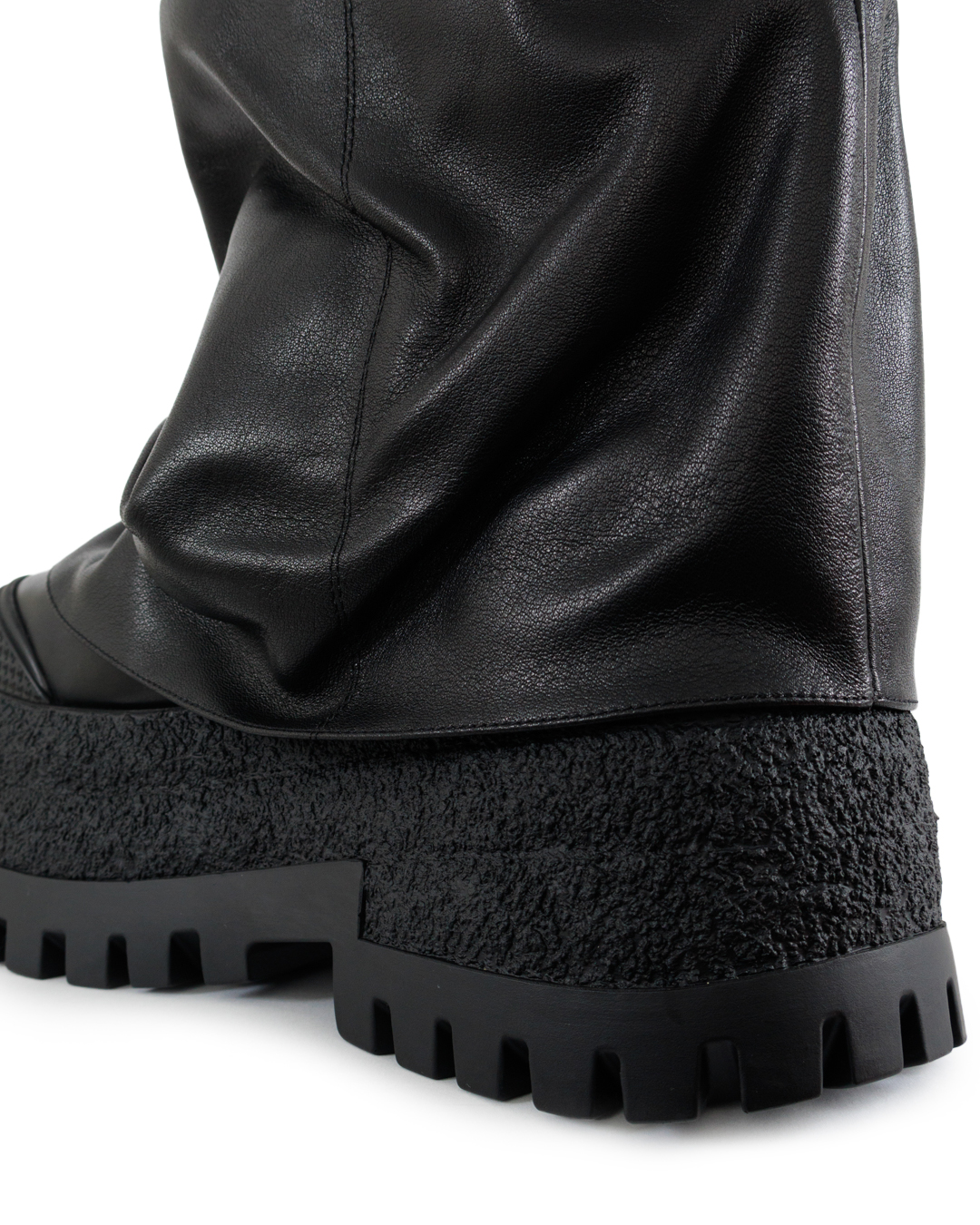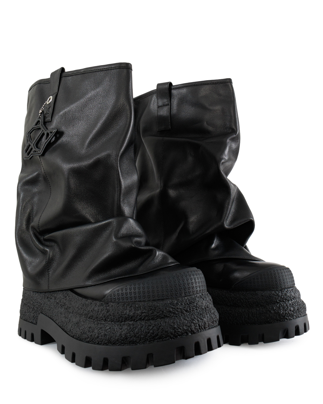 Эти сапоги — прекрасный пример современного авангарда с нотками утонченной элегантности. Выполненные из гладкой черной кожи, они демонстрируют роскошную текстуру и глубину, создавая эффектный и выразительный образ. Сапоги имеют свободный силуэт с эффектом легкой драпировки, что придаёт им динамику и добавляет изысканную небрежность. Высокая текстурированная подошва с глубоким протектором обеспечивает отличное сцепление и подчеркивает модный городской стиль. На верхней части сапога выделяется декоративный элемент в виде изящного логотипа на кожаной петле, который добавляет оригинальности и брендовую изысканность. Аккуратная строчка и внимание к деталям подчёркивают мастерство исполнения и высокий уровень качества. Эти сапоги — идеальный выбор для тех, кто ищет баланс между функциональностью и уникальным стилем, желая подчеркнуть индивидуальность и уверенность в каждом шаге.