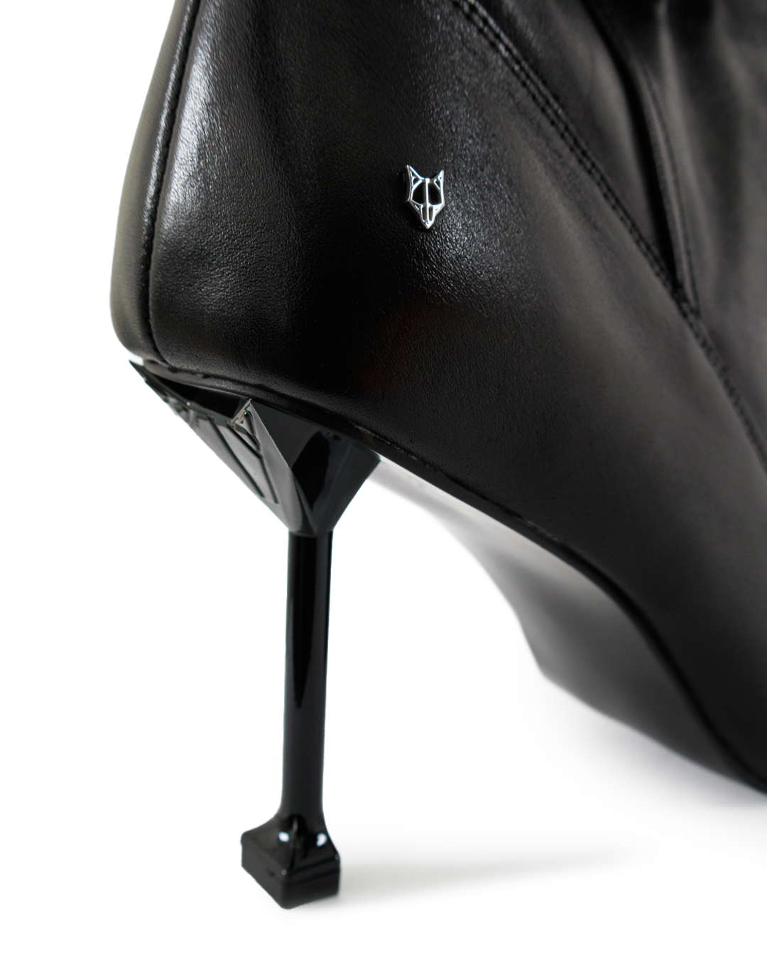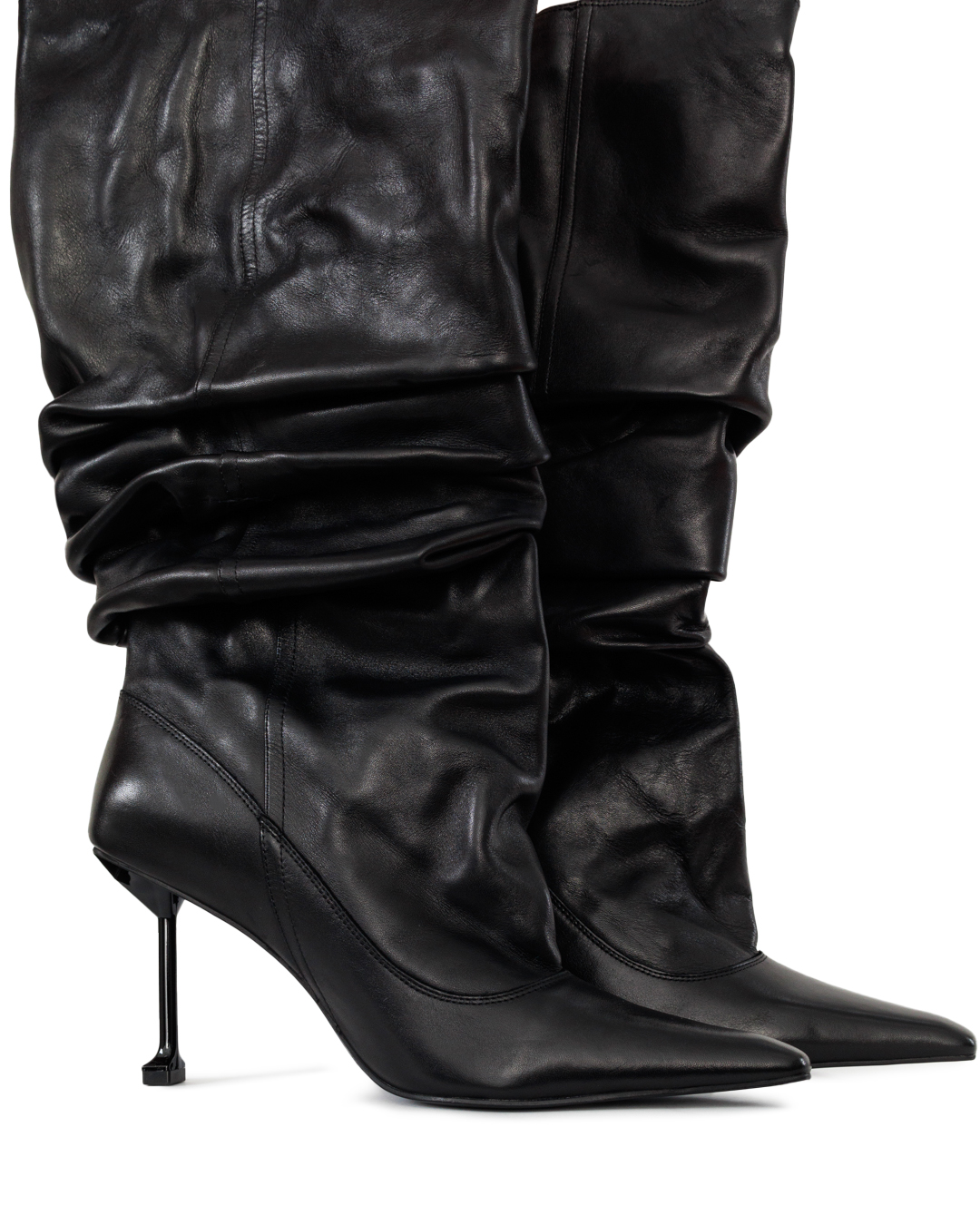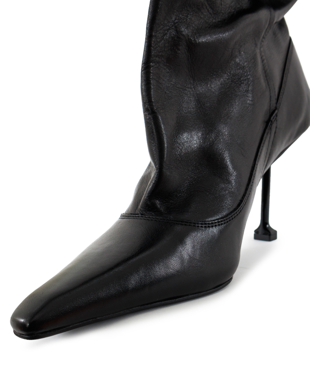 Эти сапоги — воплощение смелой элегантности и современного стиля. Выполненные из мягкой черной кожи, они излучают утонченность и роскошь. Эффектная гармошка создает образ загадочной небрежности, добавляя динамику и объем. Высокий силуэт сочетается с острым носком, что визуально удлиняет ногу, придавая силуэту стройность и изящество. Искусно выполненный каблук-шпилька задает уверенный и решительный акцент, подчеркивая женственность и уверенность. Декоративный металлический элемент на нижней части сапога добавляет нотку эксклюзивности, подчеркивая внимание к деталям и высокое качество исполнения. Эти сапоги — идеальный выбор для создания как дневных, так и вечерних образов, где стиль и комфорт должны идти рука об руку. Игра текстур и форм делает эту модель незаменимой в гардеробе, позволяя с легкостью комбинировать её с различными аутфитами, от изысканных платьев до трендовых джинсов.