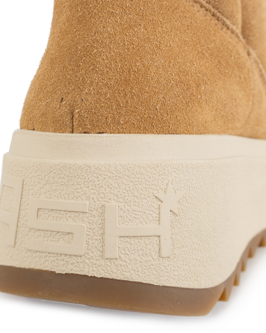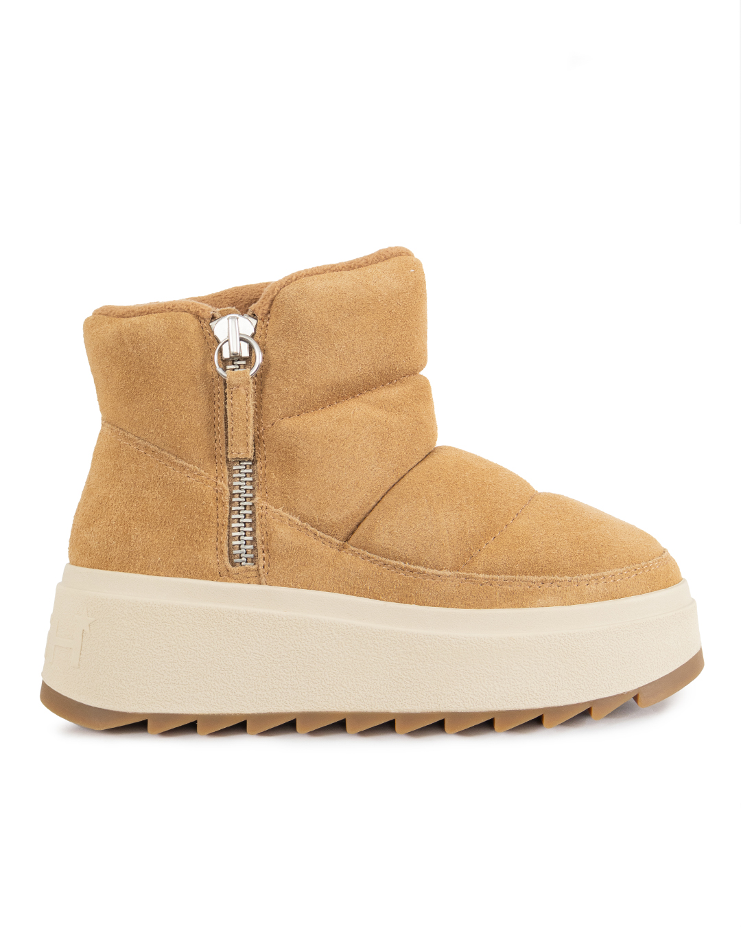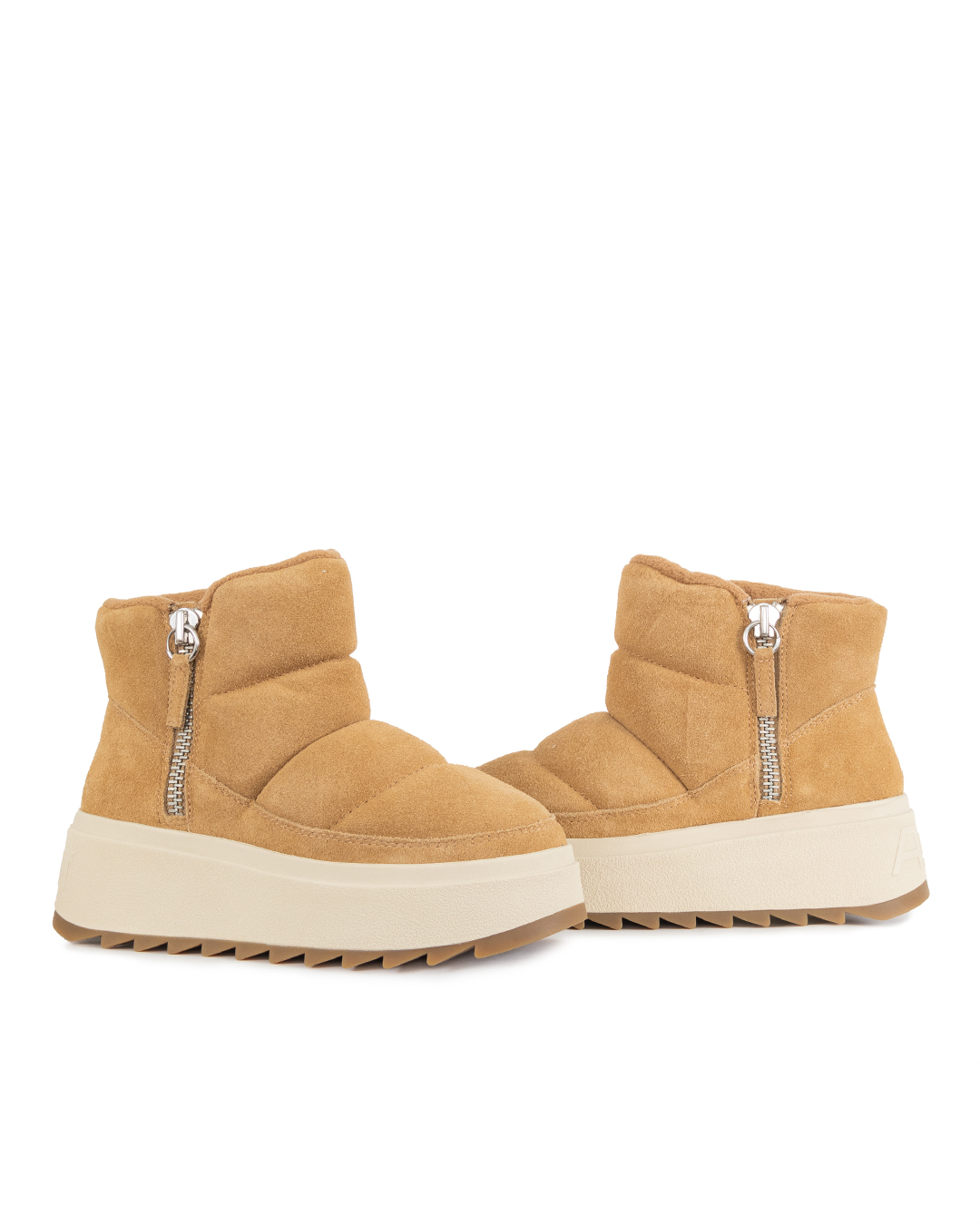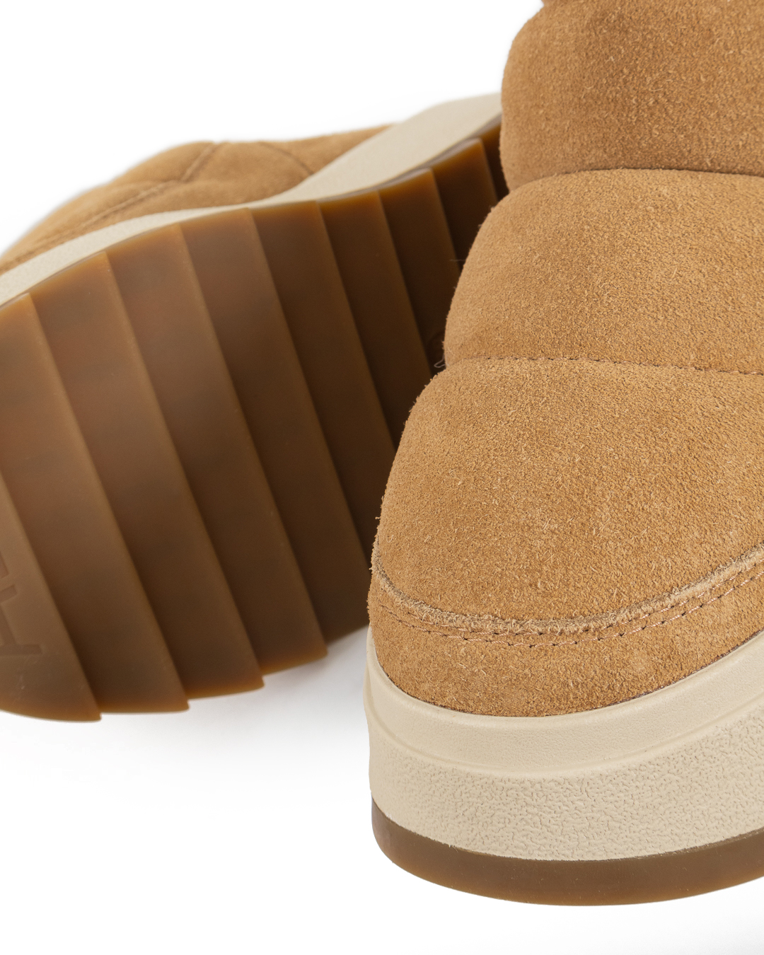 Угги дутые из замши утеплены синтепоном. Модель застегивается на молнии по бокам. Высокая резиновая подошва создает дополнительную защиту от влаги и грязи.