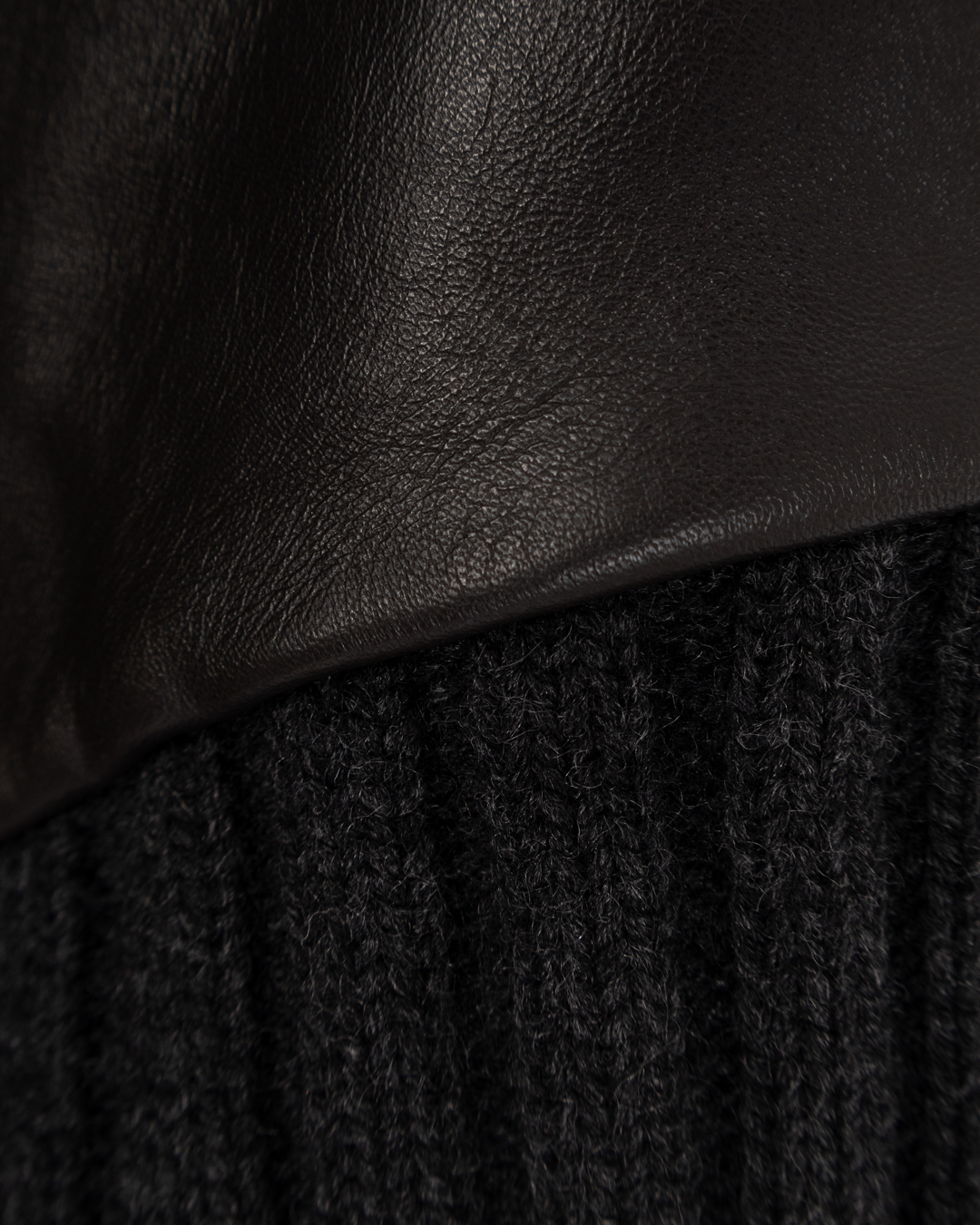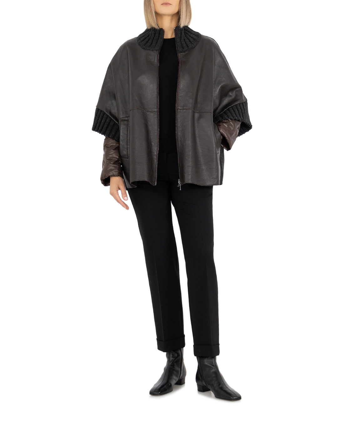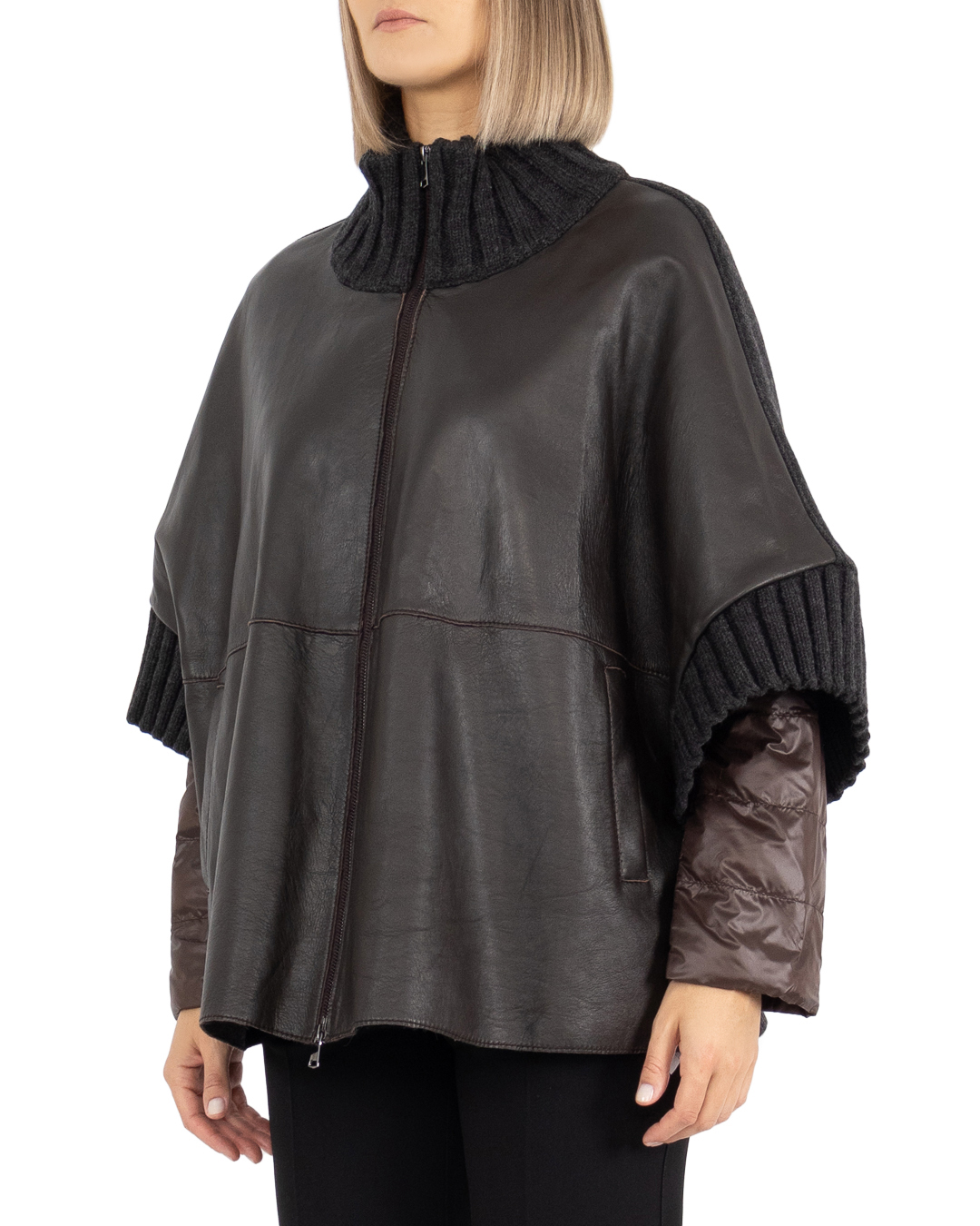 Комфортный стильный женский жилет оверсайз из натуральной кожи с отдельной стеганной , утепленной подкладкой с длинным рукавом . Модель с застежкой на молнию.  Высокий воротник стойка , манжеты и спинка связаны из трикотажной пряжи. Жилет идеален для повседневного образа.