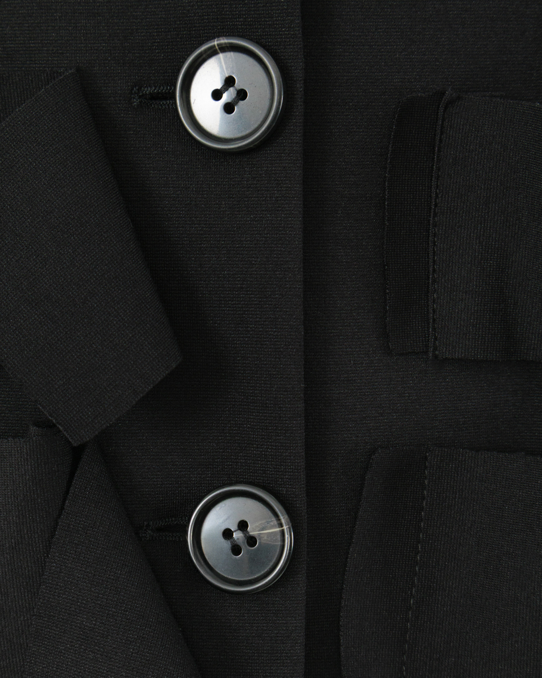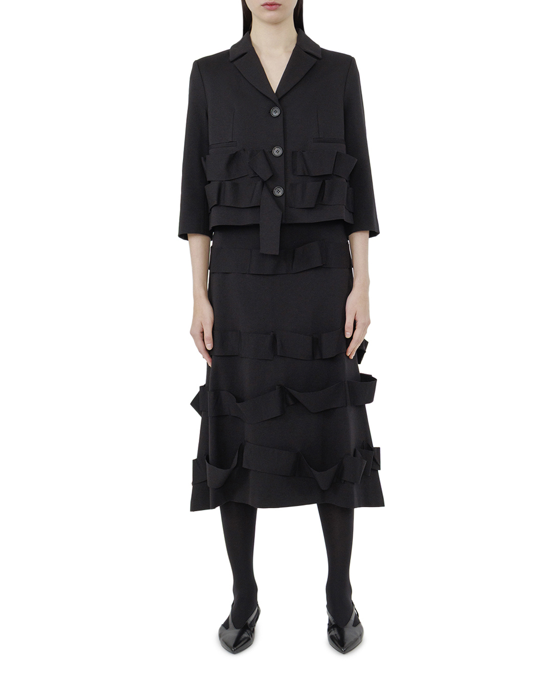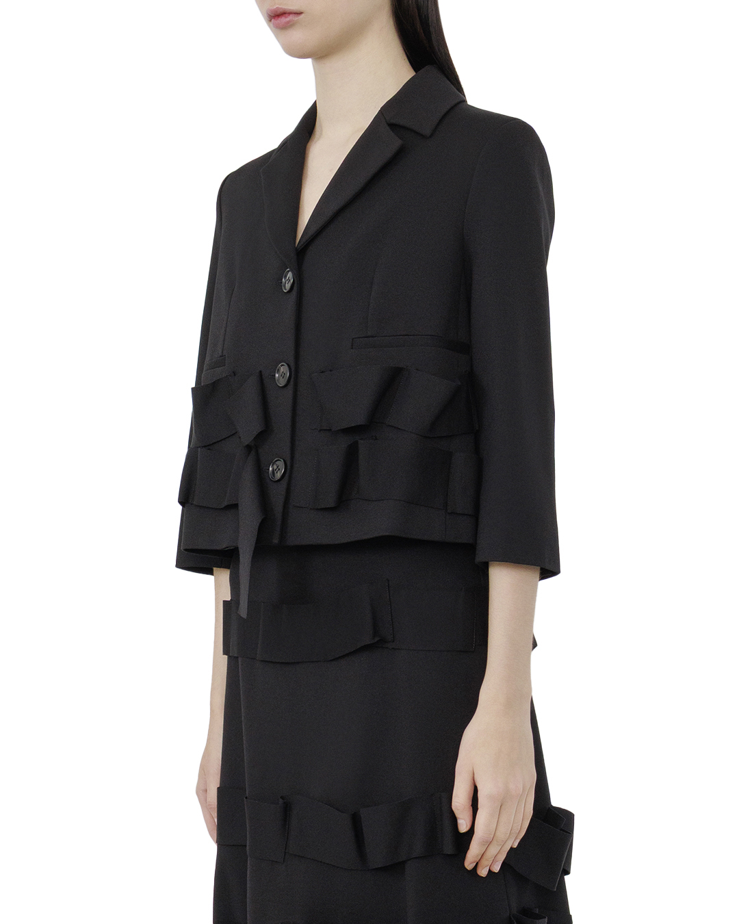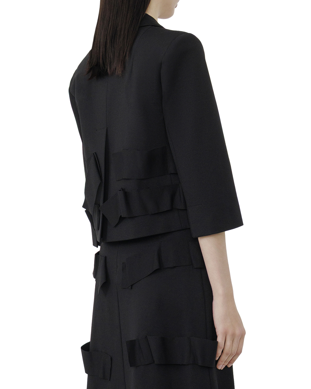 Этот жакет представляет собой гармонию классики и оригинальности, идеально подходящий для создания эффектных и запоминающихся образов. Глубокий чёрный цвет придаёт ему универсальность и строгую элегантность. Чёткие линии силуэта подчёркнуты классическим отложным воротником и изысканными пуговицами, выполняющими роль изысканного акцента. Минималистичный дизайн со скрытыми карманами делает образ лаконичным и стилевым. Особое внимание привлекают декоративные элементы в виде объёмных лент на линии талии, которые добавляют игривости и делают образ более динамичным. Этот смелый акцент трансформирует жакет, превращая его в центральный элемент образа. Идеально проработанная подкладка и точность в обработке швов обеспечивают комфорт и свидетельствуют о высоком качестве исполнения. Этот жакет можно сочетать как с классическими офисными нарядами, так и с более экстравагантными вечерними комбинациями, раскрывая потенциал индивидуального стиля.