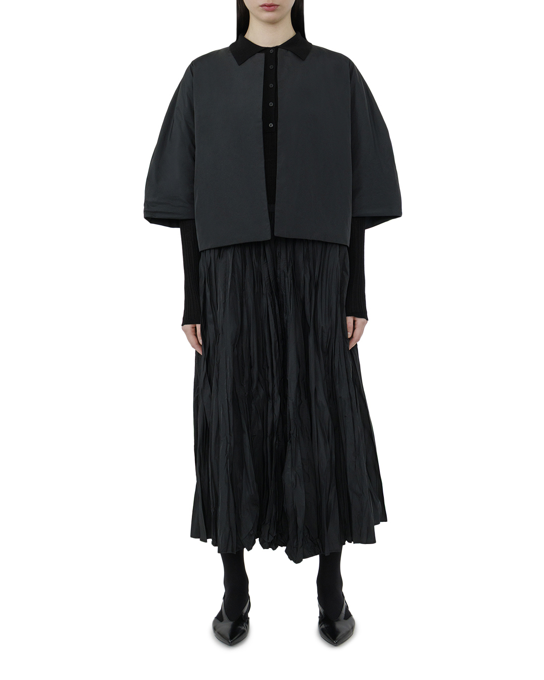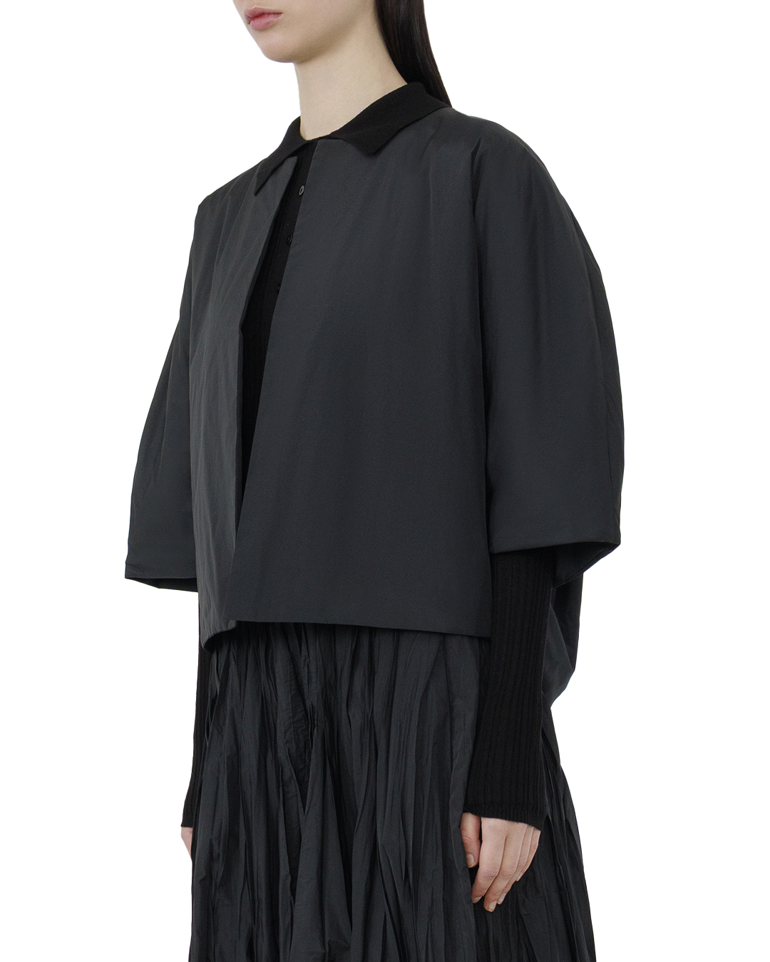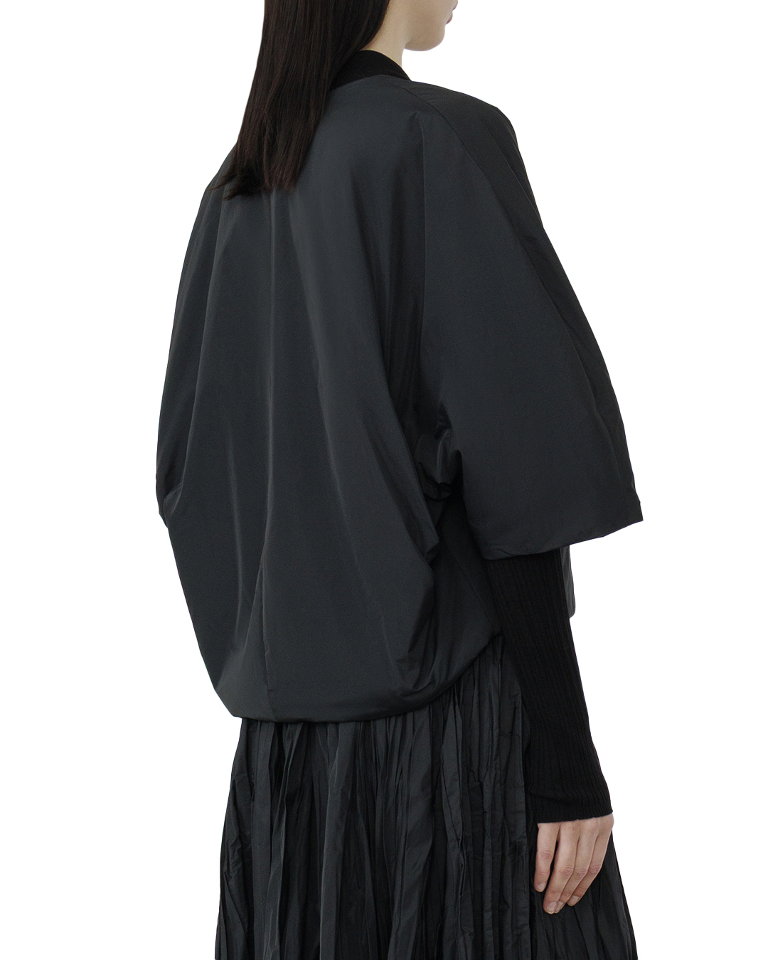 Этот жакет — воплощение минималистичной элегантности и современного стиля. Глубокий чёрный цвет подчёркивает его лаконичность и универсальность, делая его идеальным дополнением для любого гардероба. Свободный силуэт с объёмными рукавами средней длины добавляет динамику и лёгкость, придавая образу оригинальность и непринуждённость. Он выполнен в безупречном крое без излишних деталей, что позволяет сосредоточиться на идеально продуманных линиях. Скрытая застёжка спереди поддерживает концепцию минимализма и делает образ более целостным. Идеально обработанные швы и внутренние детали говорят о высоком качестве исполнения, обещая долгий срок службы и комфорт при носке. Жакет легко сочетается с самыми разными элементами гардероба, будь то строгие брюки или расслабленные джинсы, предоставляя возможность создавать как деловые, так и повседневные образы.