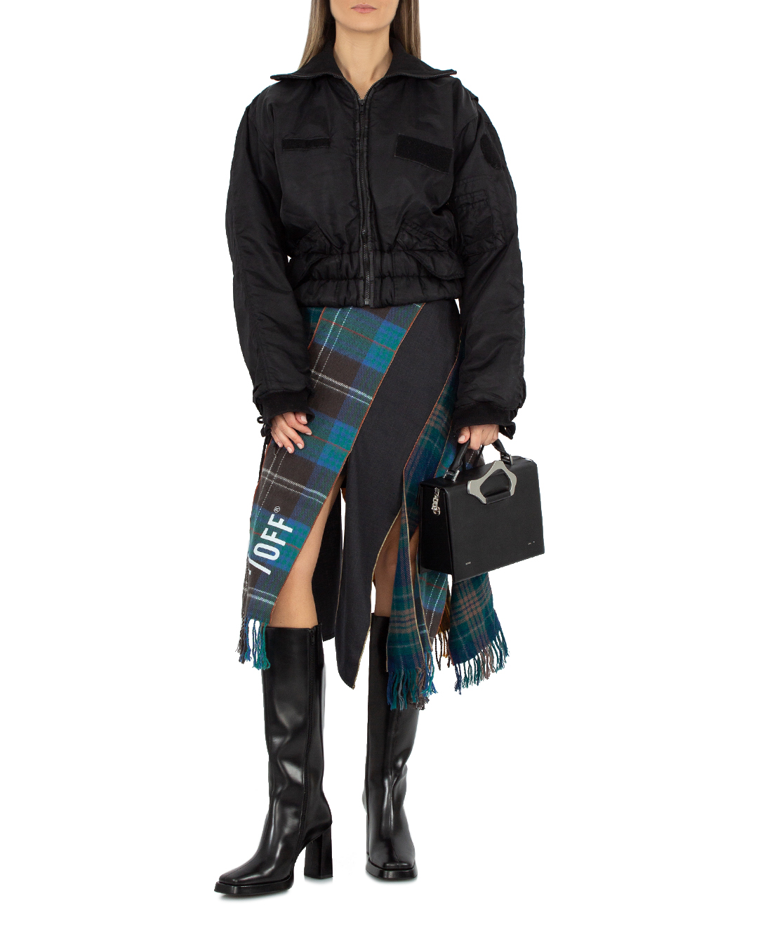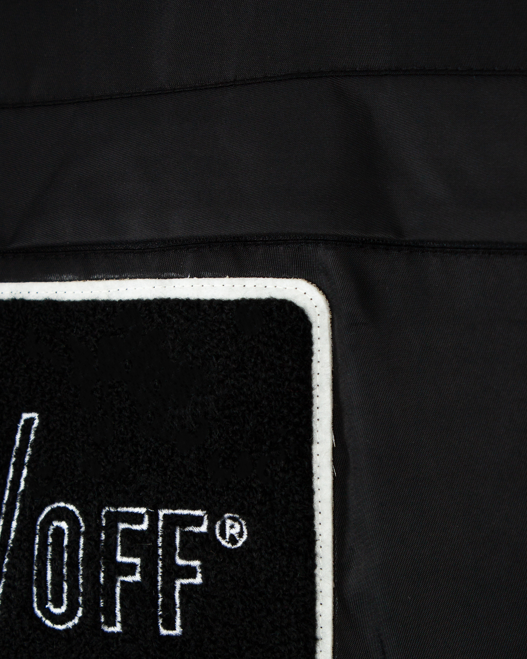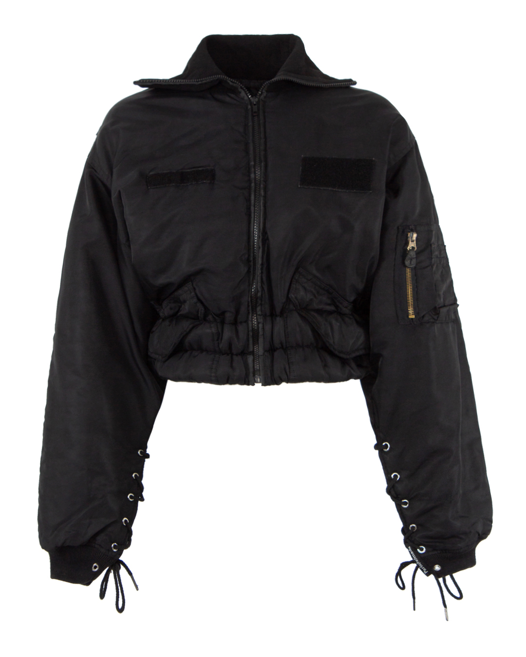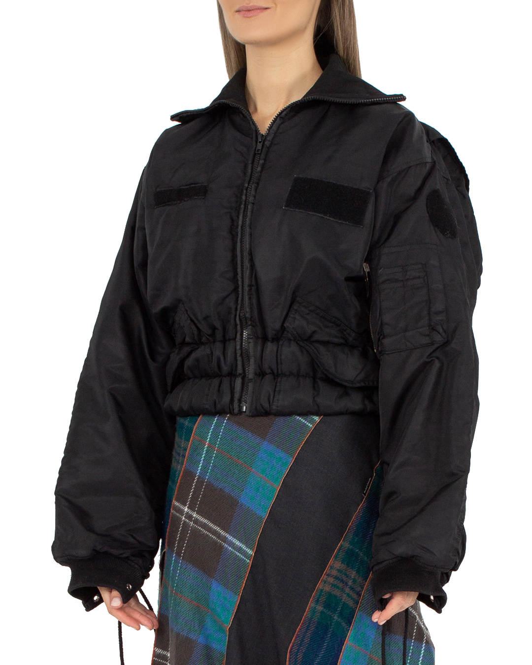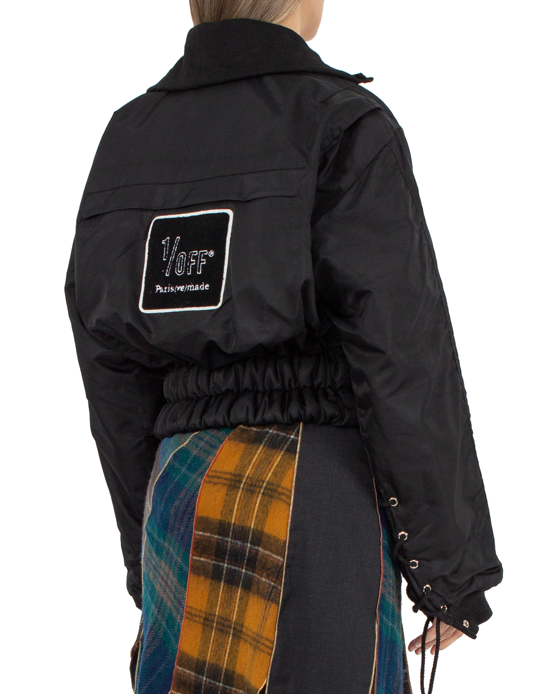 Рестайлинговый бомбер 1/OFF сшили из плотного нейлона черного цвета. Укороченное изделие объемного силуэта с застежкой на молнию дополнено корсетными завязками на широких рукавах.