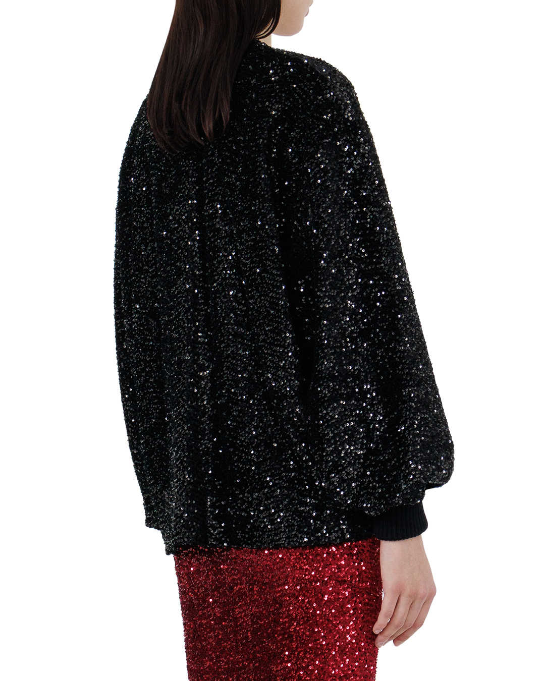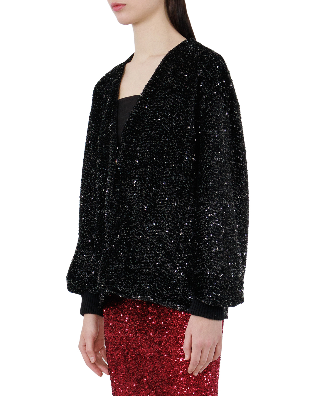 Этот бомбер — изысканное сочетание элегантности и гламура. Изготовленный из ткани, усыпанной блестящими пайетками, он привлекает внимание завораживающим сиянием, которое идеально подойдет для вечерних выходов и особенных мероприятий. Силуэт модели выдержан в классическом стиле с современным акцентом на минимализм. V-образный вырез создаёт утончённый и удлинённый эффект, делая образ более изящным. Плотные манжеты из рельефной резинки обеспечивают удобную и плотную посадку, подчёркивая спортивный характер бомбера. Блеск пайеток создаёт игру света и теней, добавляя модели магическую переливчатость. Это позволяет интегрировать бомбер в самые разные образы, будь то комбинация с вечерним платьем или с джинсами для создания эффектного контраста в повседневном аутфите. Эти детали делают модель универсальной, подчёркивая индивидуальность и смелость её обладателя, и обещая стать центром притяжения взглядов в любом окружении.