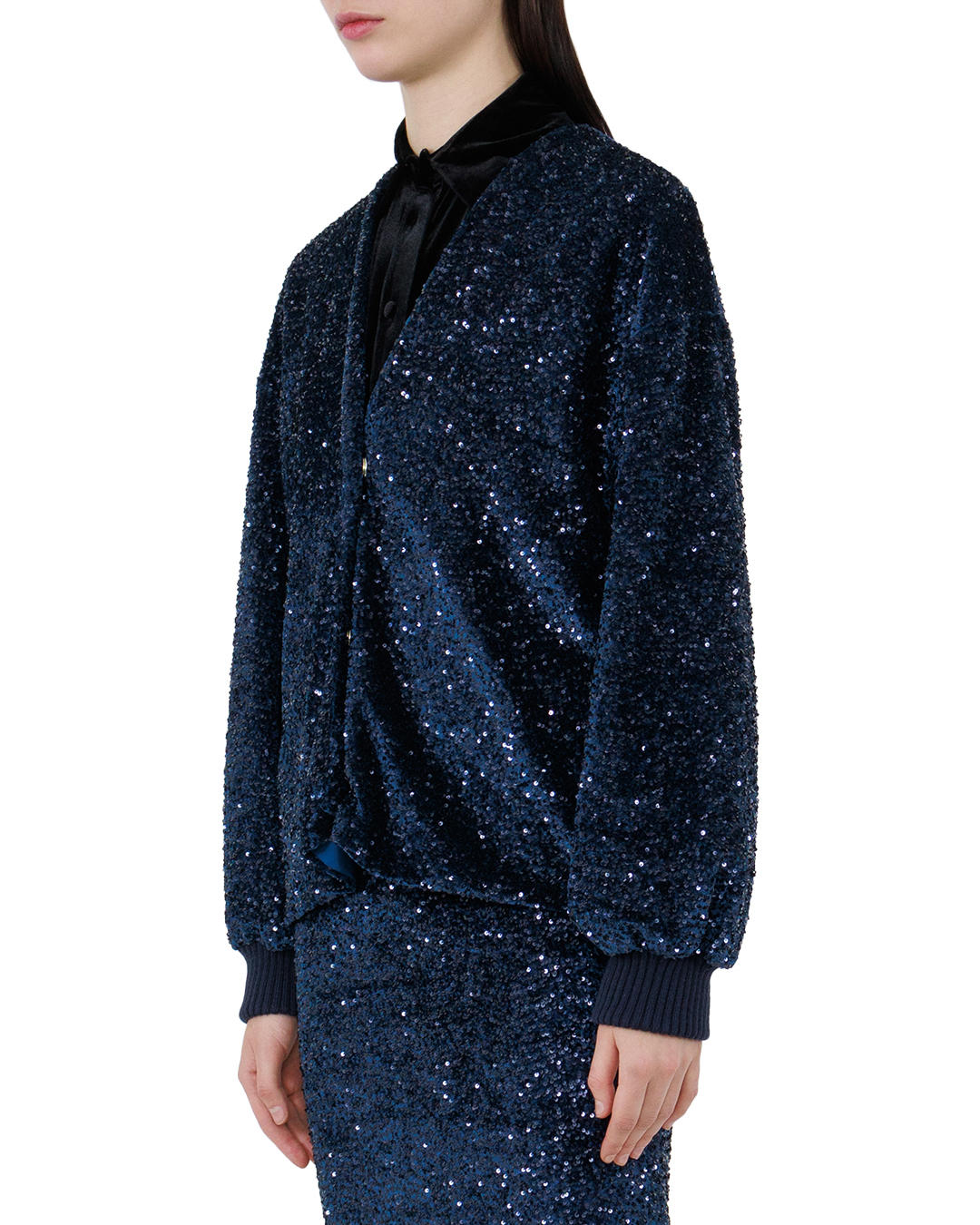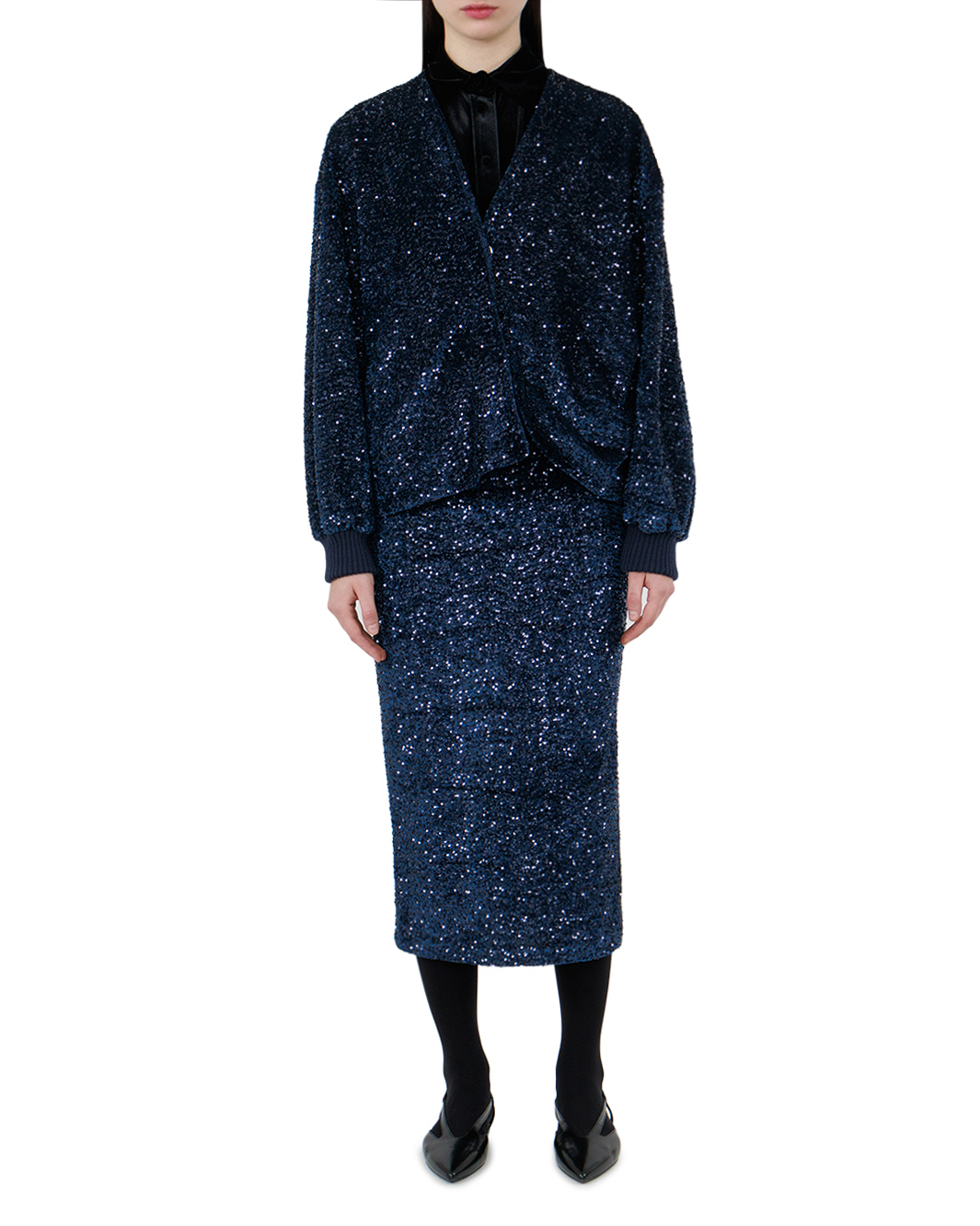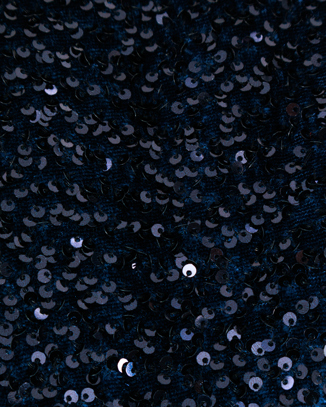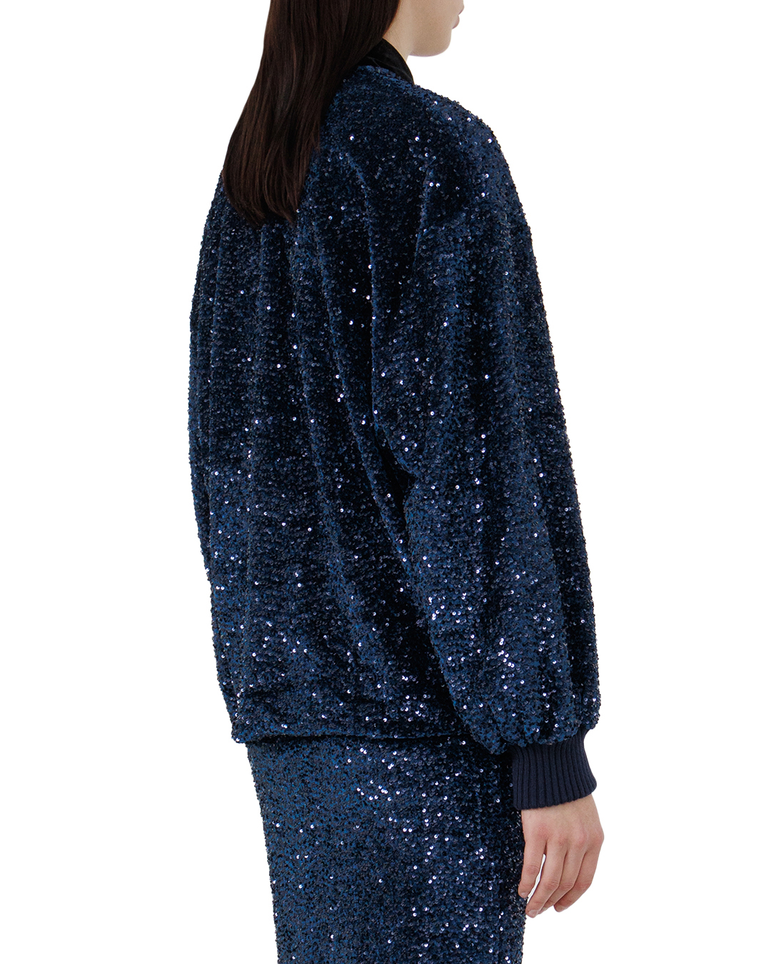 Этот бомбер — изысканное сочетание элегантности и гламура. Изготовленный из ткани, усыпанной блестящими пайетками, он привлекает внимание завораживающим сиянием, которое идеально подойдет для вечерних выходов и особенных мероприятий. Силуэт модели выдержан в классическом стиле с современным акцентом на минимализм. V-образный вырез создаёт утончённый и удлинённый эффект, делая образ более изящным. Плотные манжеты из рельефной резинки обеспечивают удобную и плотную посадку, подчёркивая спортивный характер бомбера. Блеск пайеток создаёт игру света и теней, добавляя модели магическую переливчатость. Это позволяет интегрировать бомбер в самые разные образы, будь то комбинация с вечерним платьем или с джинсами для создания эффектного контраста в повседневном аутфите. Эти детали делают модель универсальной, подчёркивая индивидуальность и смелость её обладателя, и обещая стать центром притяжения взглядов в любом окружении.
