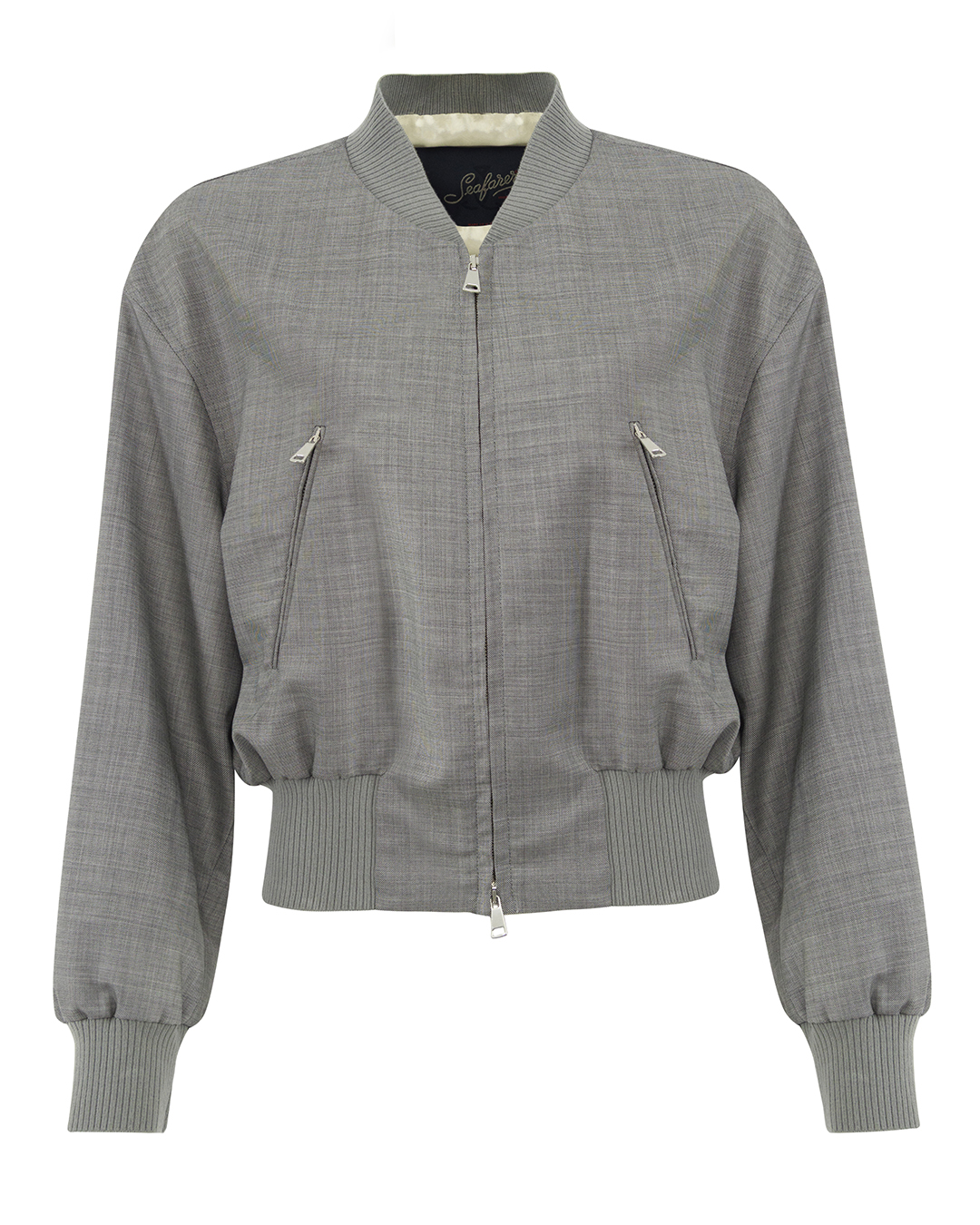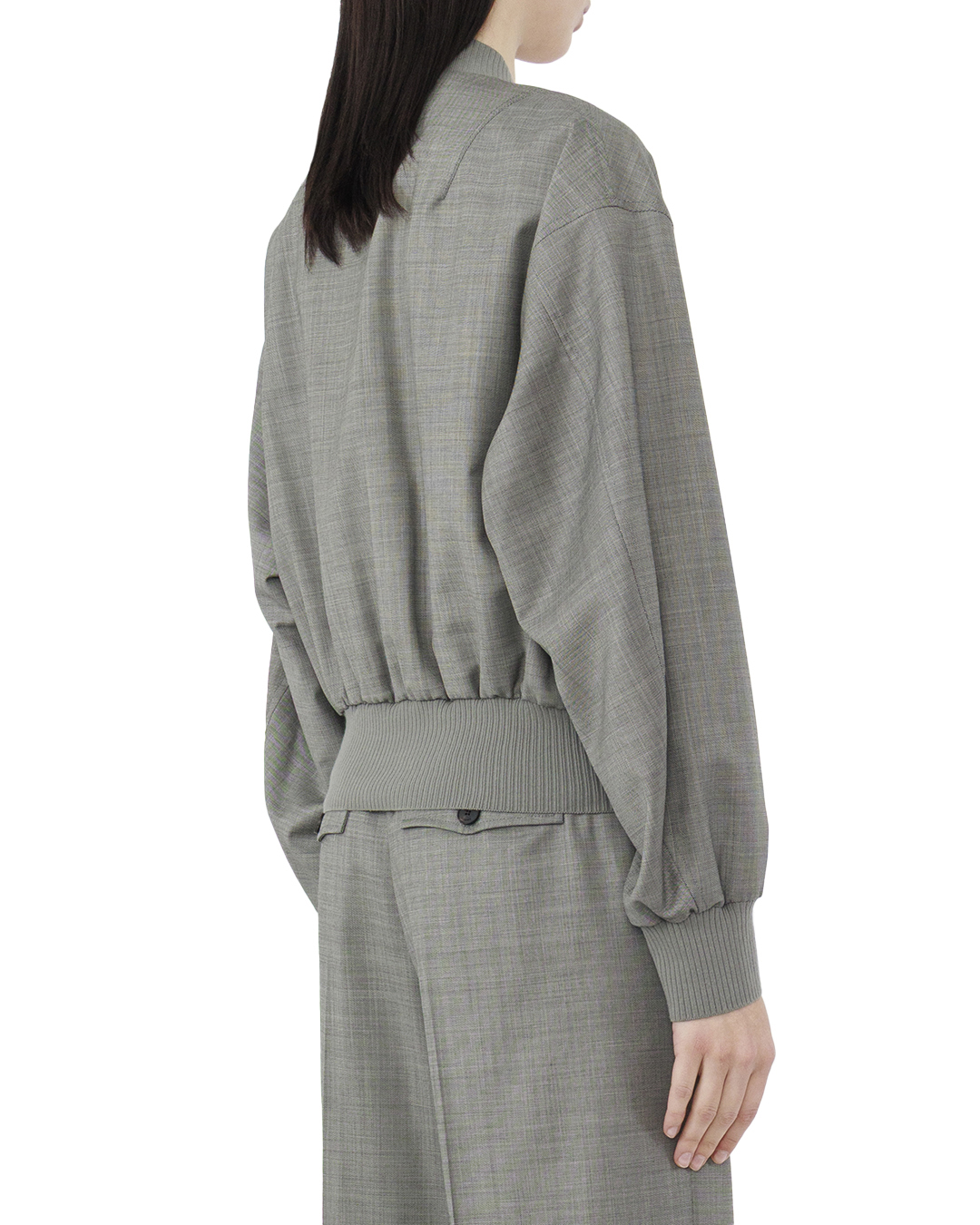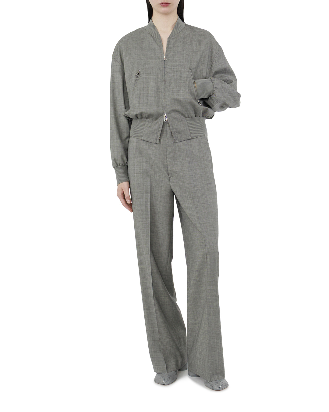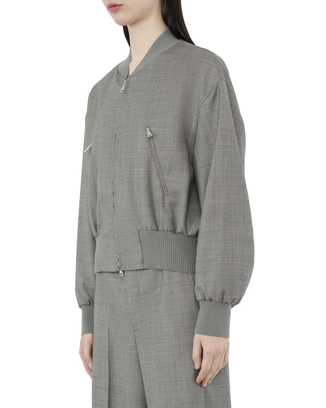 Этот бомбер выполнен из высококачественного текстиля с мелкой клетчатой текстурой, что придает изделию современный и элегантный вид. Серый оттенок подчеркивает универсальность модели, позволяя сочетать её с разнообразными нарядами. Крой бомбера характеризуется свободным силуэтом и коконом, что обеспечивает комфорт и свободу движений. Классическая длина модели завершается по линии талии, что акцентирует силуэт и создает гармоничный образ. Воротник выполнен в виде полосатого резинки, что придает стильный спортивный акцент. Молния на центральной части переда выполнена с металлическим логотипом, что добавляет изделию ощутимую роскошь. Отделка включает два горизонтальных кармана на молнии, оформленных с кожаными вставками, что обеспечивает не только практичность, но и визуальный контраст. Эластичные манжеты на рукавах и по низу бомбера создают эффект «объема» и хорошо фиксируют посадку, подчеркивая пропорции фигуры. Этот бомбер идеально сочетается как с джинсами, так и с юбками, добавляя в образ современный шик и непринужденность. Брендовые детали и качественная отделка делают его универсальным предметом гардероба для создания стильных аутфитов в любом стиле.