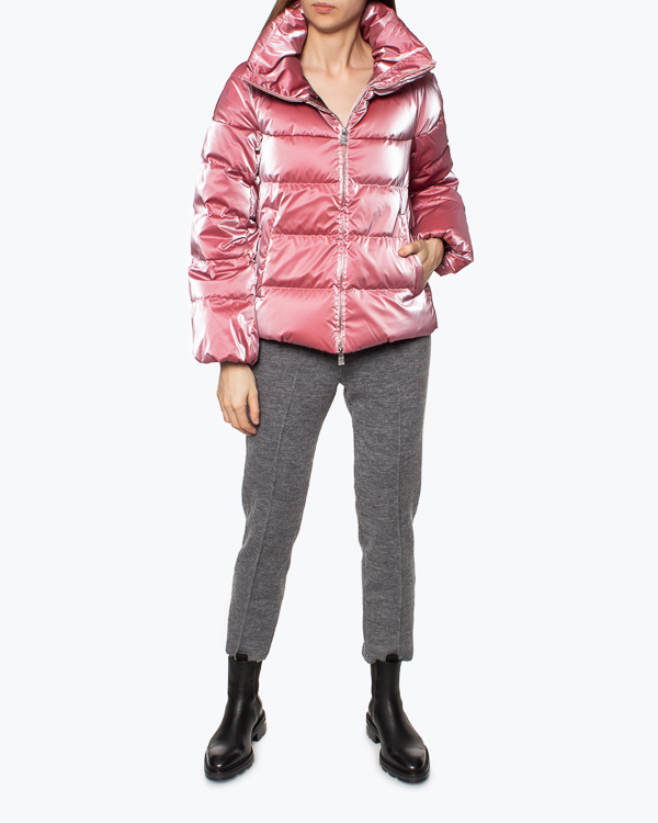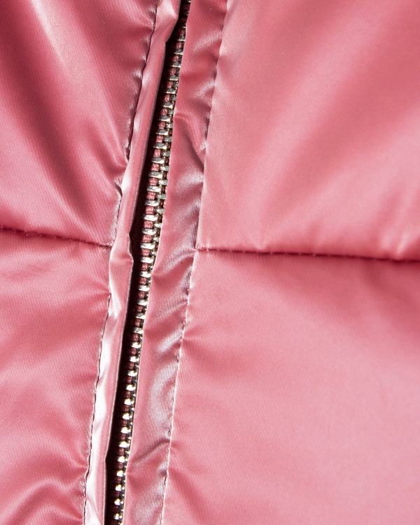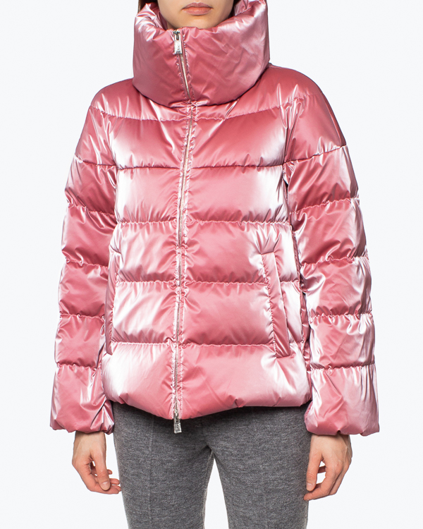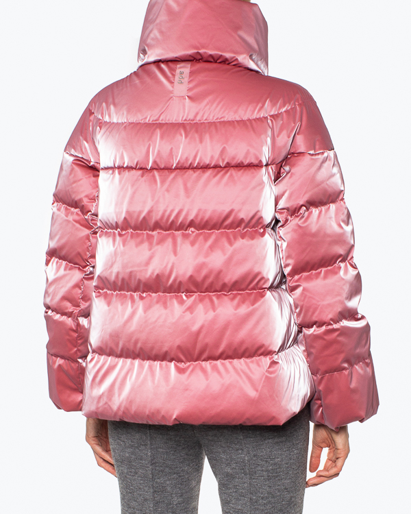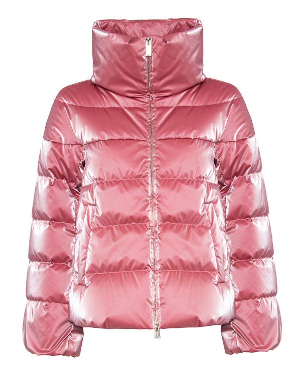 Дутая куртка-пуховик из плотного переливающегося нейлона розового оттенка. Объемное изделие прямого кроя с застежкой на молнию и двумя карманами по бокам. Куртка дополнена воротником-стойкой.