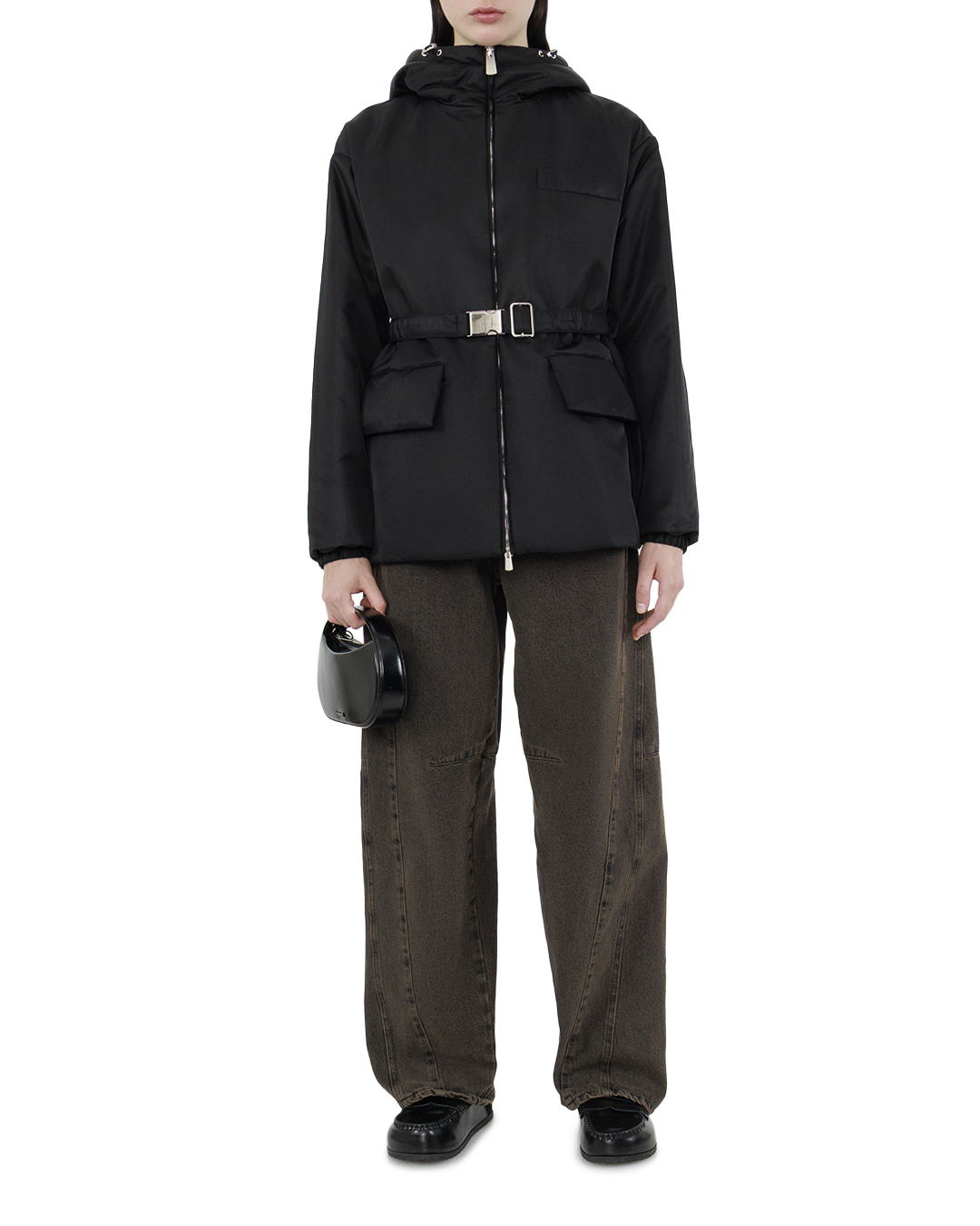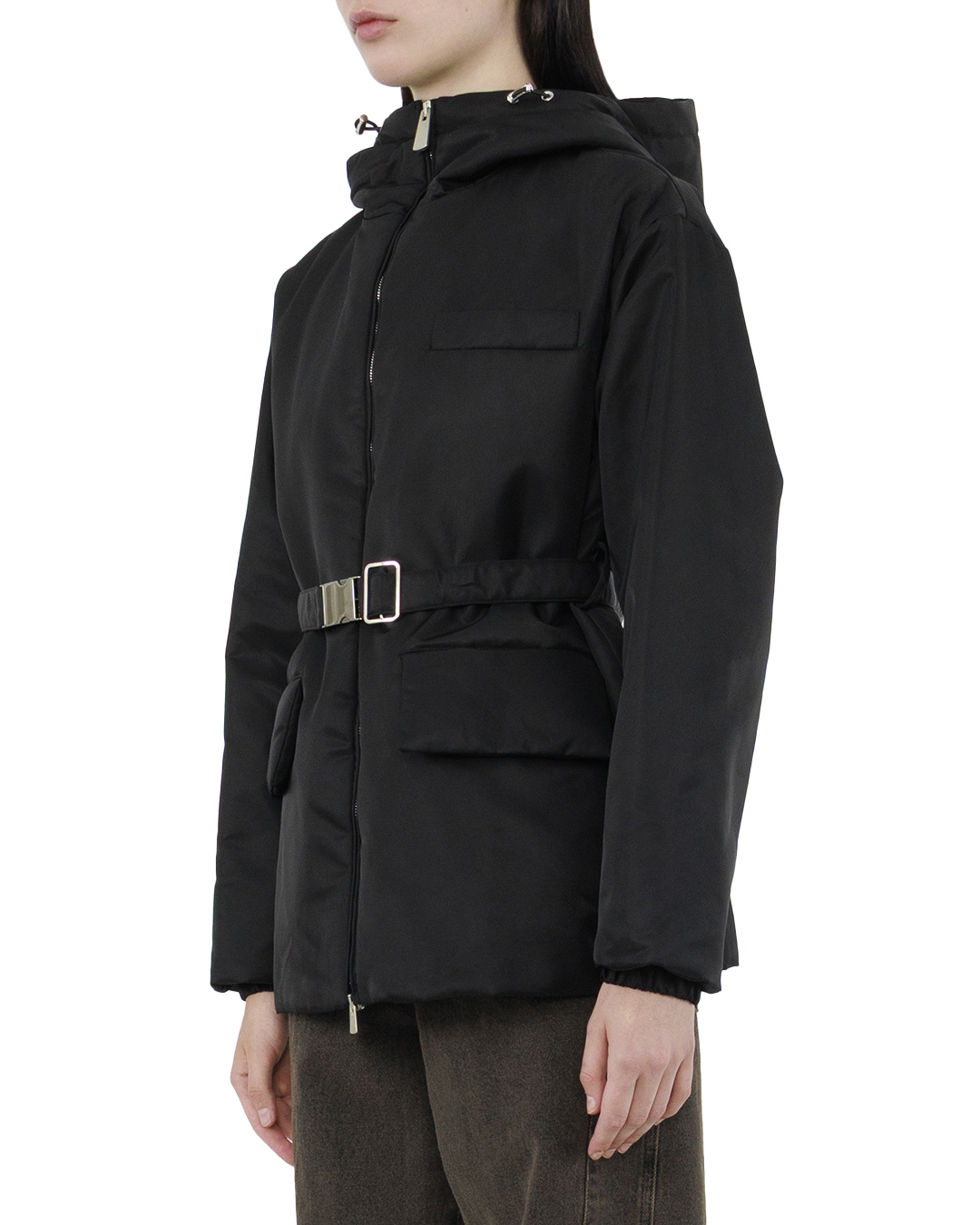 Эта стильная куртка — воплощение современного урбанистического шика и функционального дизайна. Выполненная из плотного, водоотталкивающего материала в насыщенном чёрном цвете, она идеально подходит для городских условий, сочетая практичность и эстетичность. Капюшон с регулируемыми шнурками обеспечивает защиту от ветра и дождя, добавляя современный акцент в общий ансамбль. Центральная молния с металлическим отблеском создает вертикальную линию, дополнительно вытягивая силуэт и придавая изделию технологичный вид. Ремень с пряжкой искусно подчёркивает талию, создавая изящный силуэт и добавляя выразительность. Два вместительных кармана с клапанами, расположенные по бокам, обеспечивают функциональность и удобство. Декоративная патч-панель на груди добавляет элемент современного дизайна и завершает образ, делая его более выразительным и гармоничным. Куртка идеально впишется в активный городской гардероб, сочетая в себе комфорт, стиль и практичность, необходимую для динамичного ритма жизни.