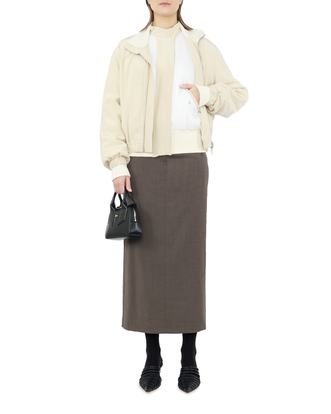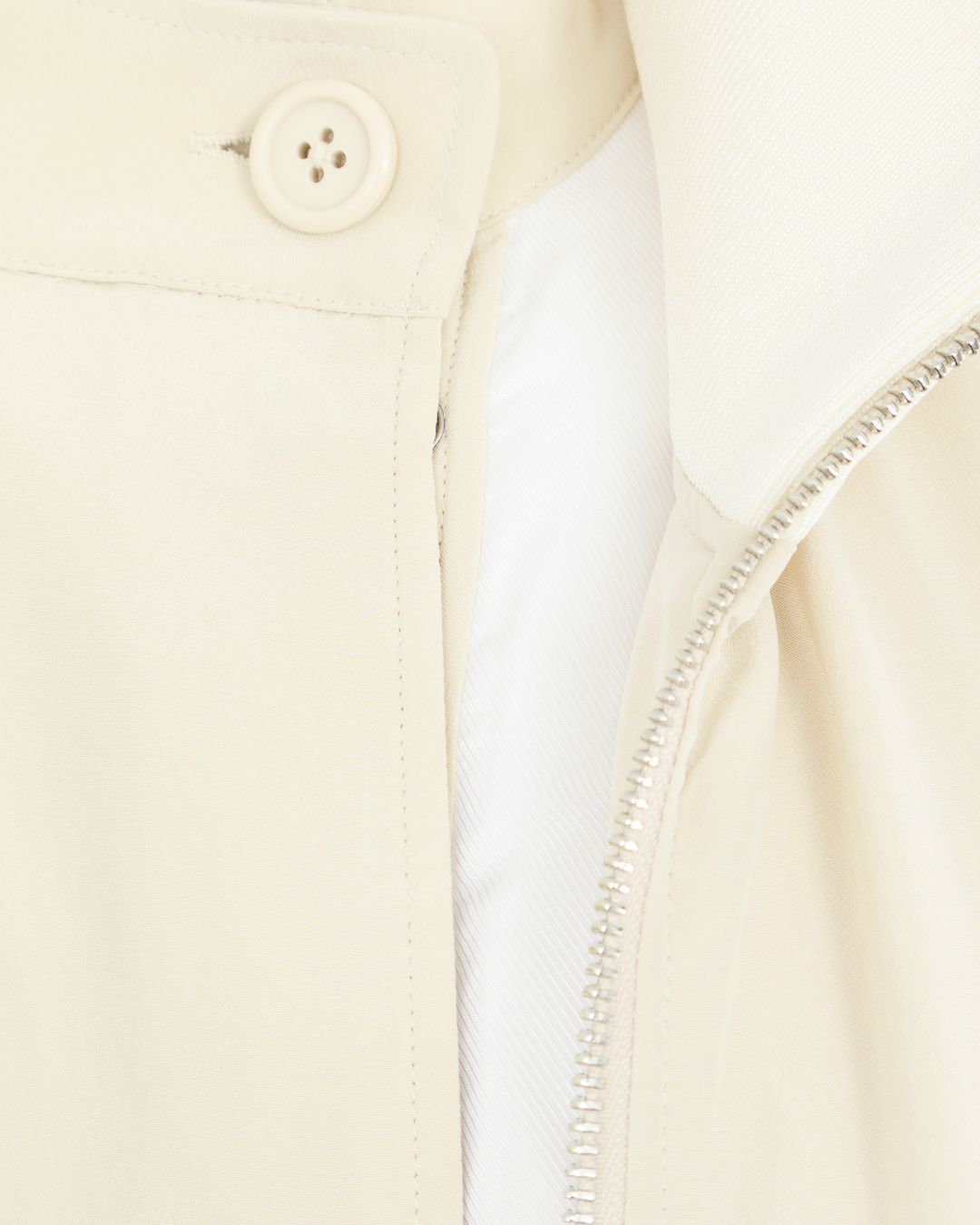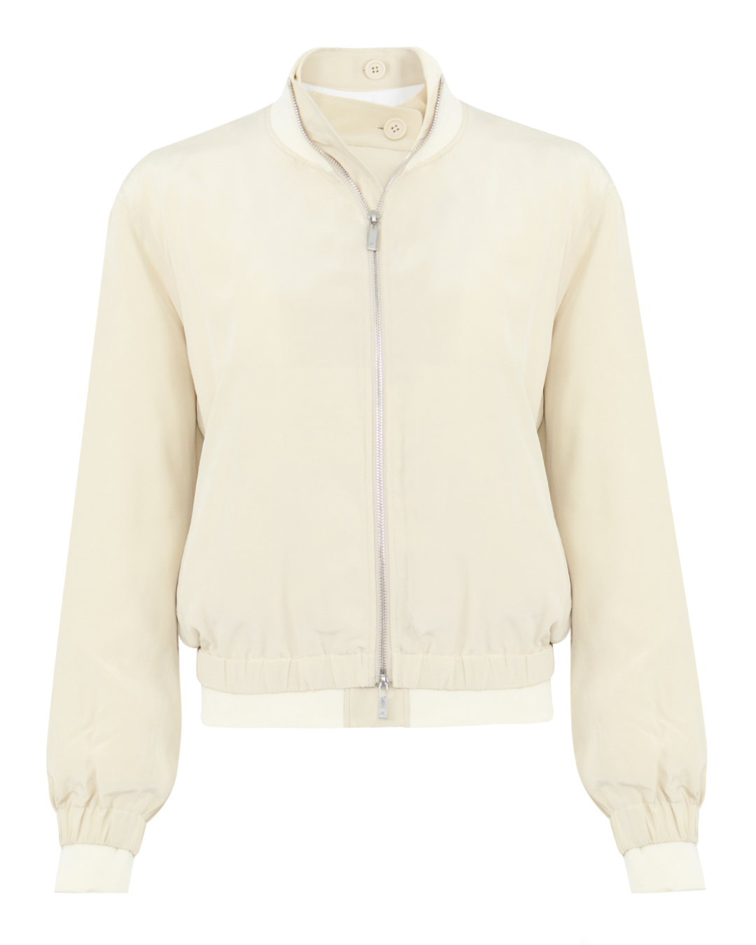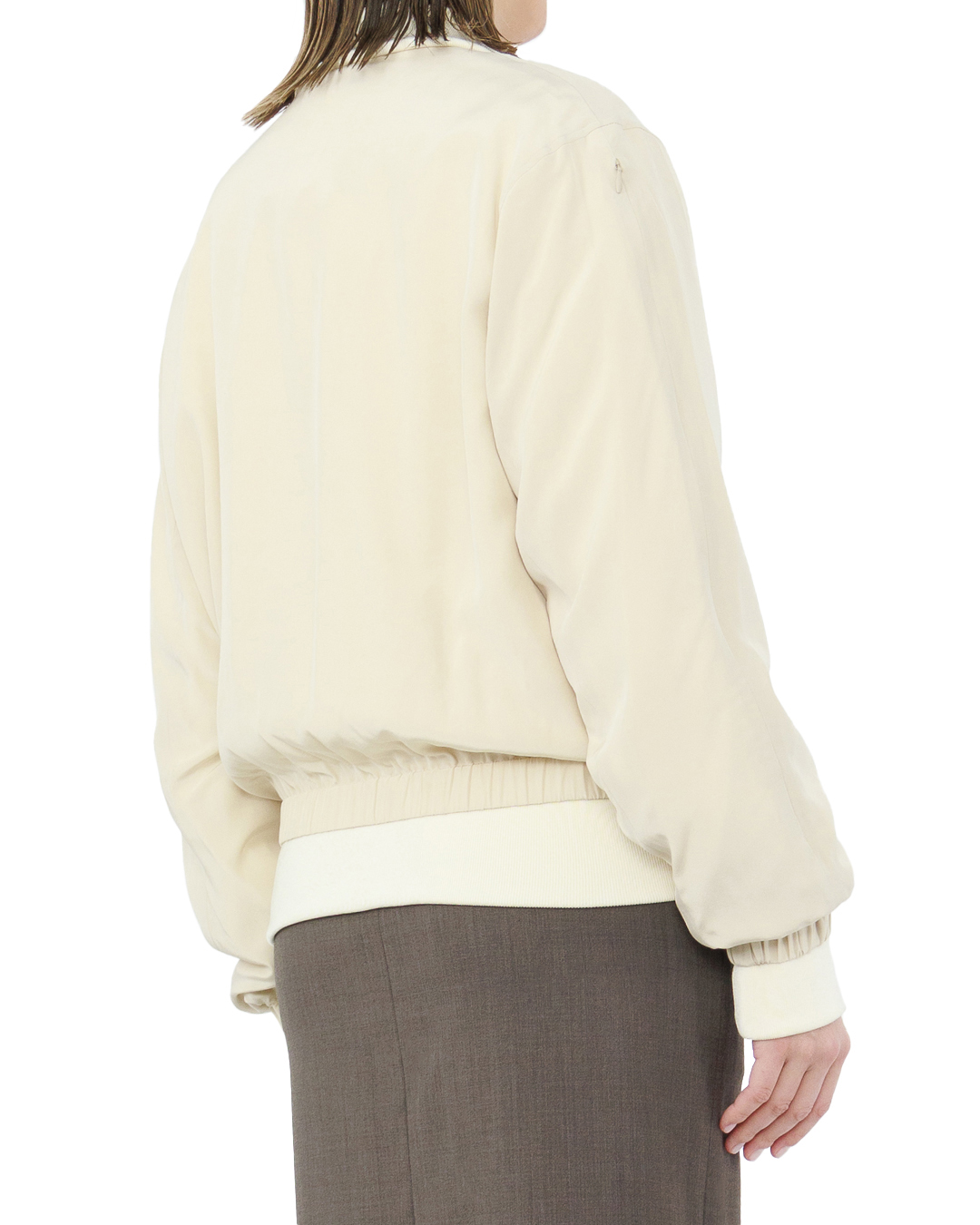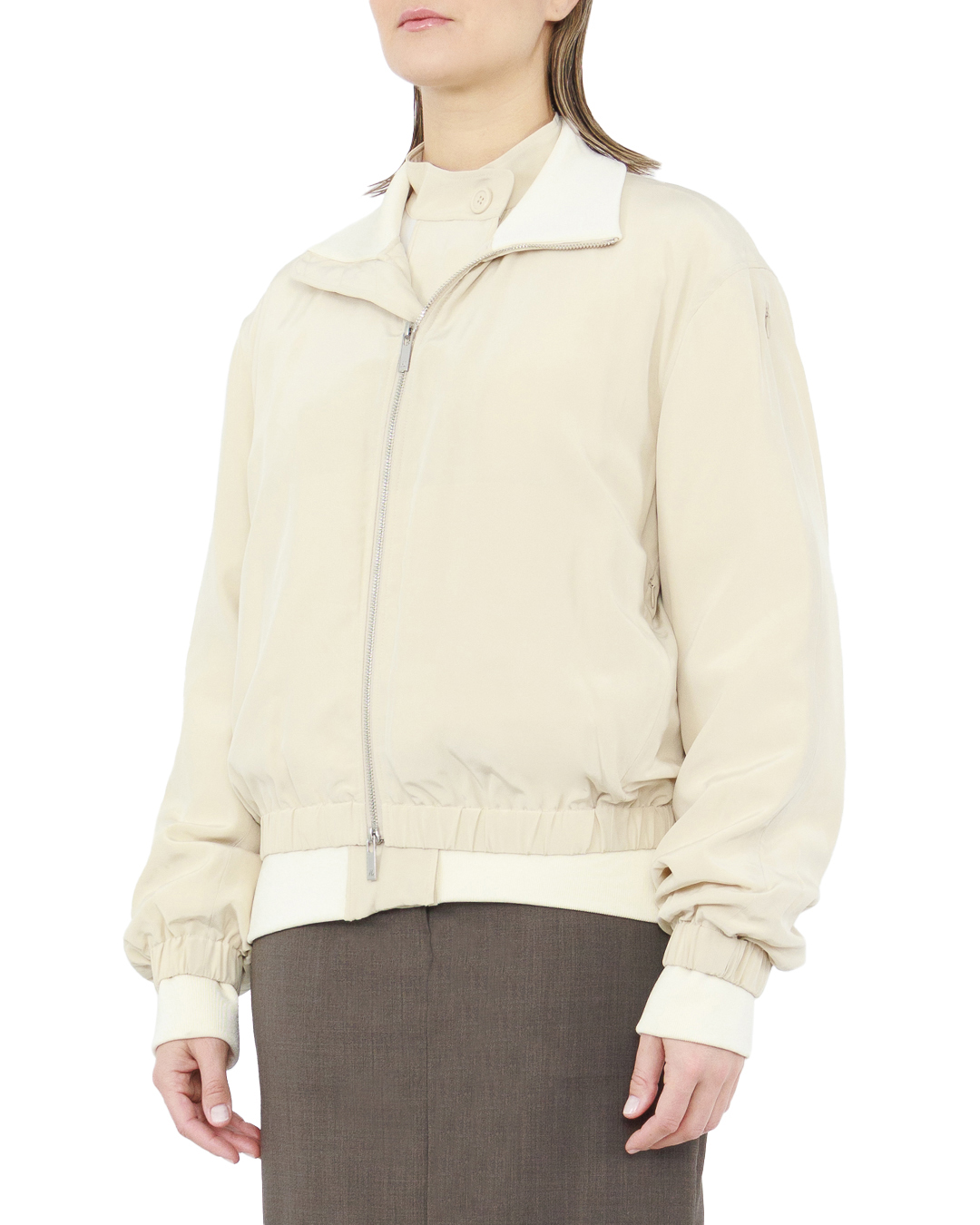 Дизайн куртки с панелями из белого/бежевого шелка, высокий воротник, застежка-молния спереди, длинные рукава, два кармана с клапанами спереди, манжеты и низ на резинке