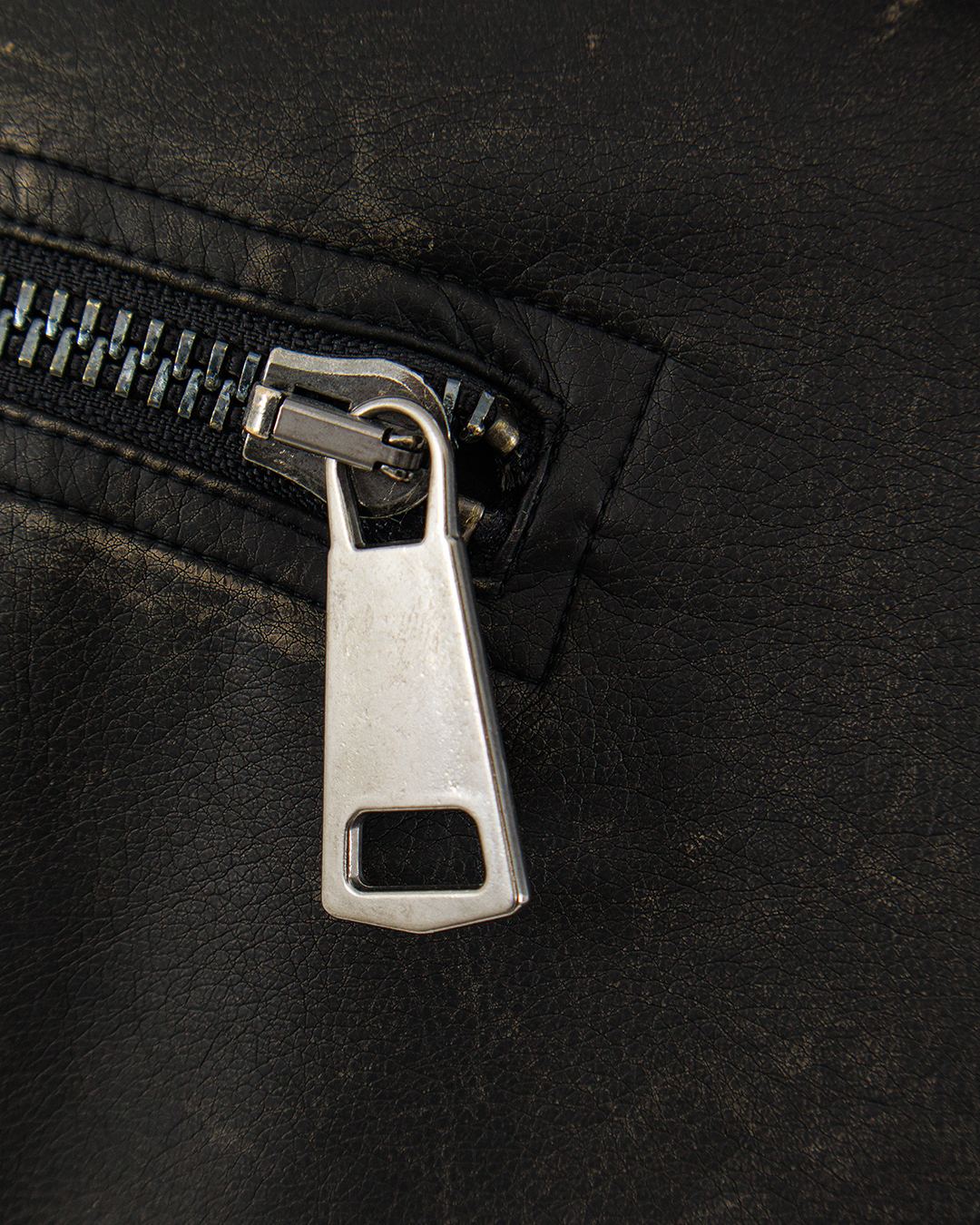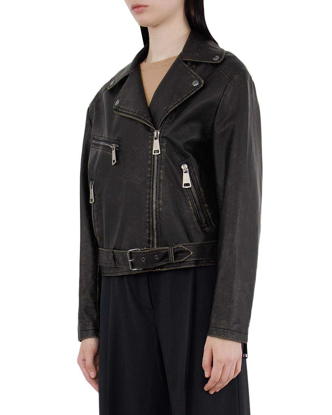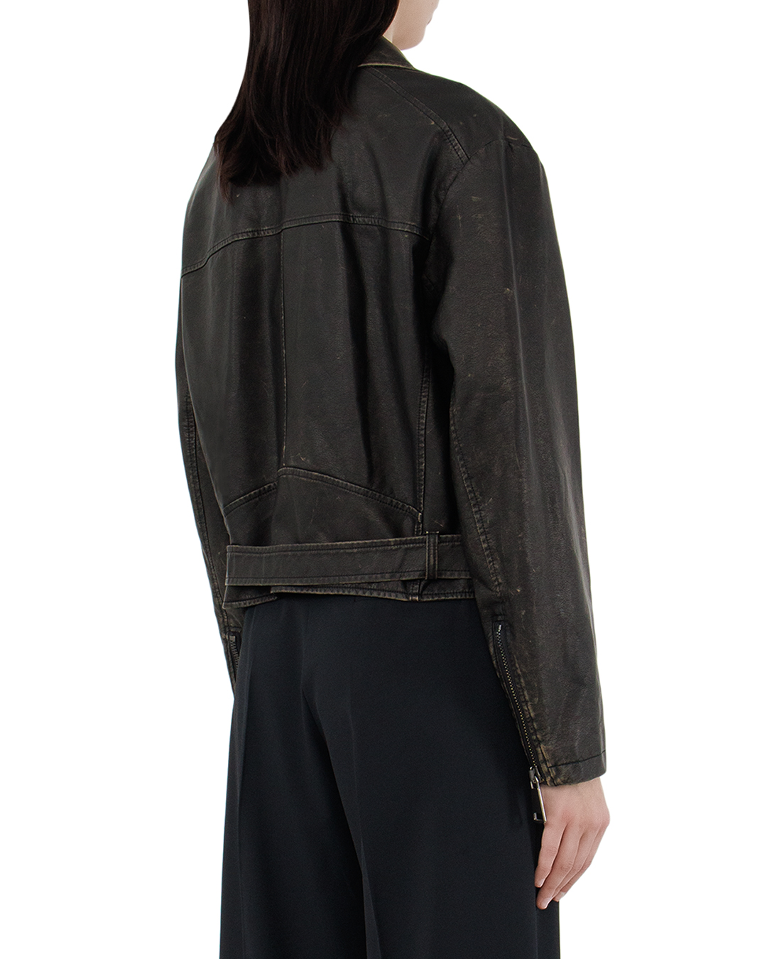 Эта куртка — яркий пример неувядаемой классики в мире моды. Воплощая дух авантюризма и свободы, она выполнена из высококачественной кожи с эффектом винтажности, что придает изделию особый шарм и характер. Натуральные текстурные оттенки создают глубину и динамичность визуального восприятия. Асимметричная застежка-молния, выполненная с мастерским вниманием к деталям, придаёт куртке выразительность и подчёркивает её дерзкий стиль. Металлические элементы представлены в виде массивных молний и клепок, которые усиливают байкерский характер и добавляют функциональности. Широкий отложной воротник с кнопками и объемные лацканы создают эффектный и харизматичный образ. Присутствие декоративных карманов с молниями добавляет изысканную практичность и служит стильным акцентом. Регулируемый кожаный ремень на талии завершает образ, подчеркивая фигуру и обеспечивая дополнительный комфорт. Эта куртка станет идеальным выбором для создания смелых и экспрессивных образов, подчеркнув вашу индивидуальность и уверенность в себе.