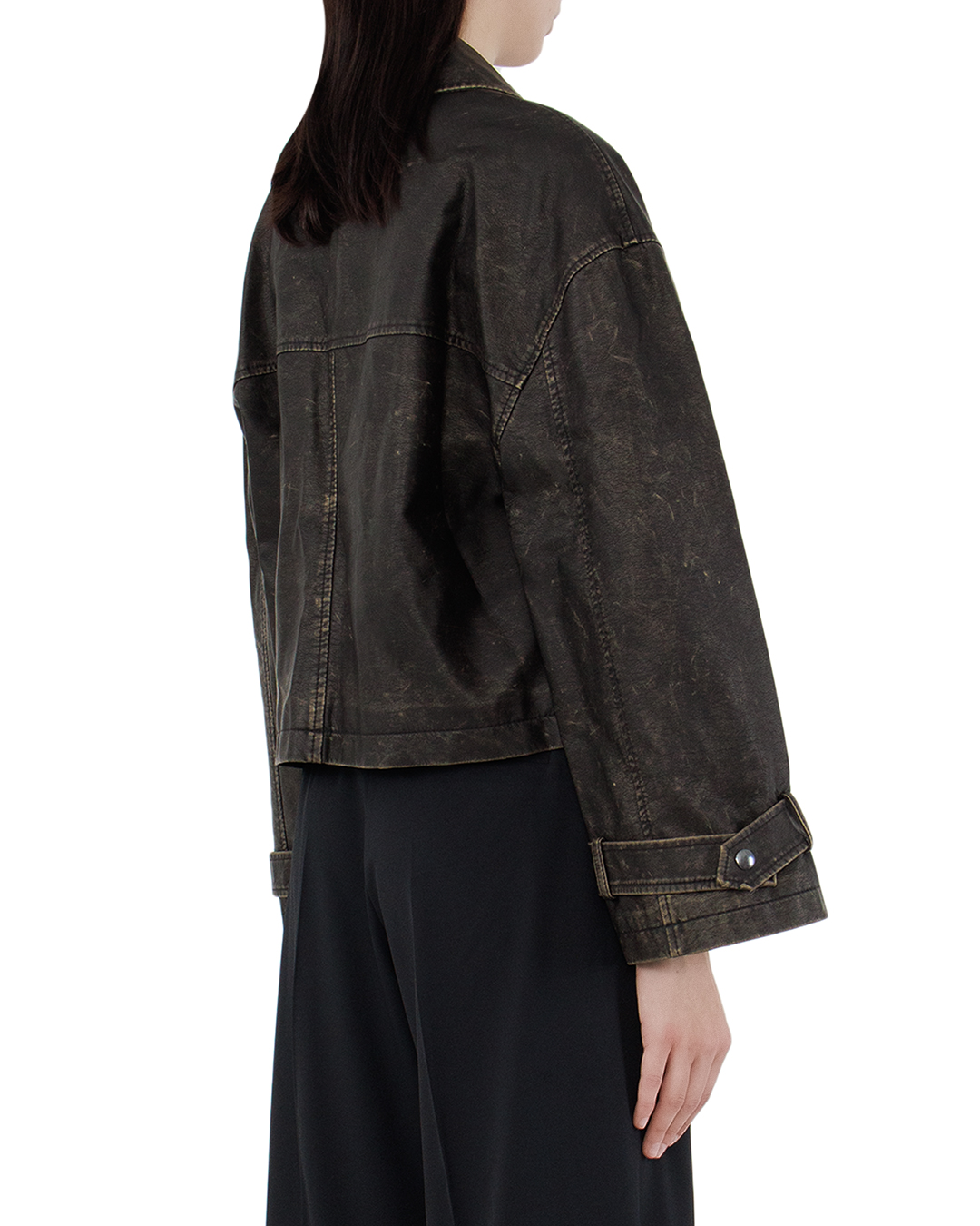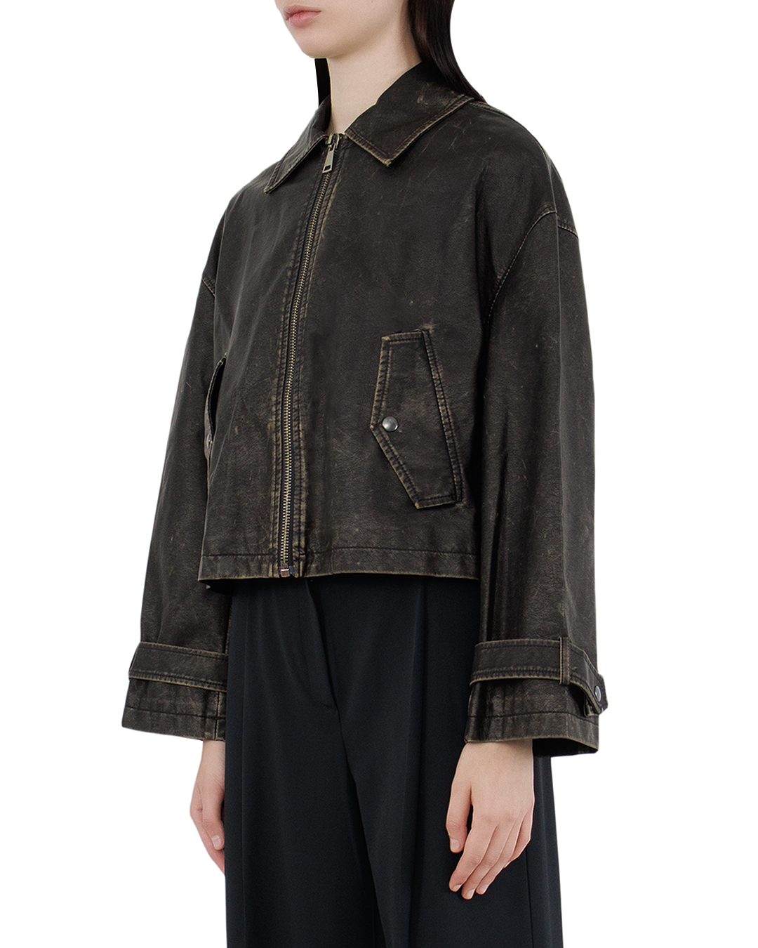 Эта куртка в винтажном стиле идеально воплощает нестареющую классику с дерзким и уверенным характером. Глубокий оттенок черного с эффектом состаренной эко-кожи создает уникальную текстурированную поверхность, придавая изделию динамичность и глубину. Отложной воротник с четкими линиями добавляет образу классическую строгость и завершенность. Центральная застежка на молнии не только практична, но и акцентирует внимание, создавая сильный вертикальный силуэт. Удобные карманы с клапанами, выполненные с аккуратной строчкой, добавляют практичности, оставаясь стильным акцентом. Ремешки на манжетах подчеркивают внимание к деталям и добавляют функциональности, позволяя адаптировать посадку. Декоративные швы, простроченные контрастной нитью, усиливают ощущение винтажного шарма и подчеркивают индивидуальность куртки. Эта модель станет неотъемлемой частью гардероба, идеально сочетаясь как с джинсами, так и с более формальными элементами, подчеркивая вашу уверенность и стилистическое чутье.