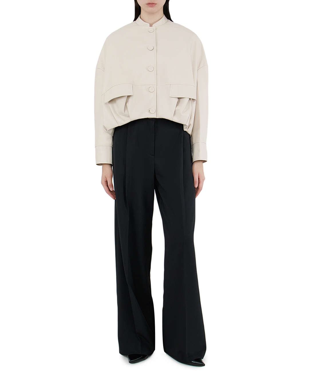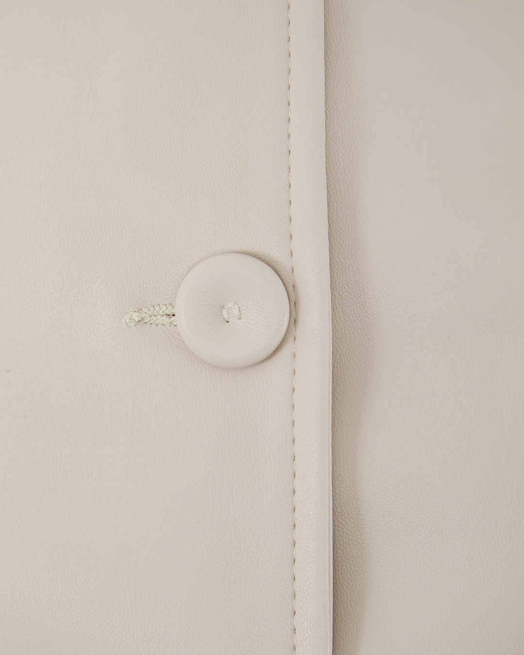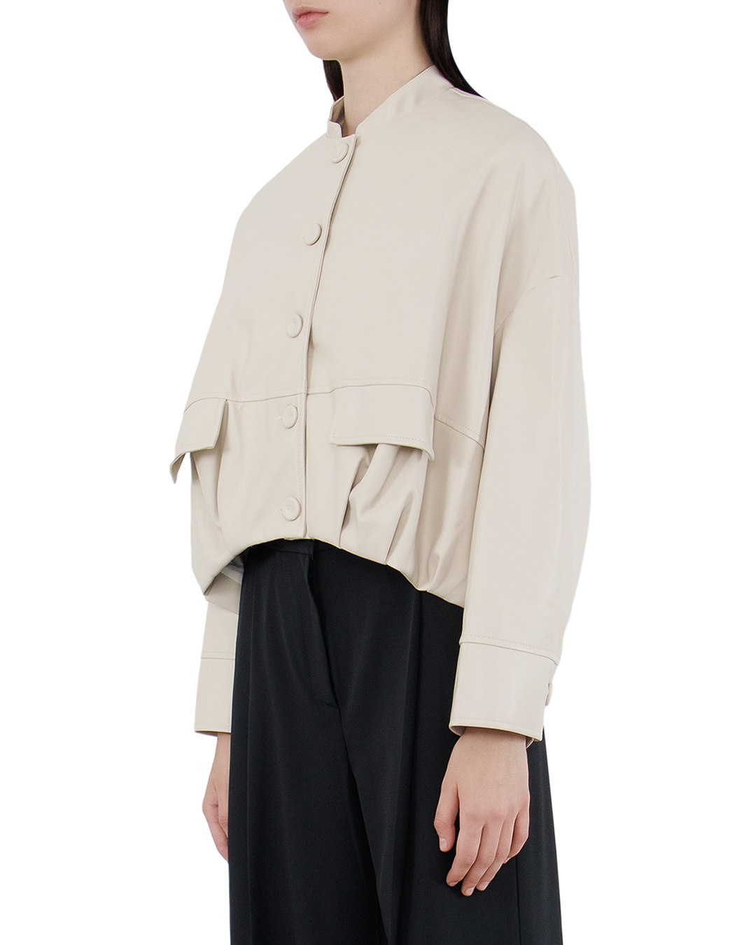 Эта куртка олицетворяет концептуальный минимализм и современную элегантность. Классический кремовый оттенок создает свежий и утонченный образ, идеально вписываясь в любые модные комбинации. Эко-кожа отличается мягкостью и легкостью, что делает носку приятной и комфортной. Стильный акцент — это стоячий воротник, который добавляет изделиям изысканную строгость и подчёркивает линию шеи. Застежка на крупные пуговицы создает ровный вертикальный акцент, добавляя образу симметричности и структурированности. Элегантные широкие манжеты и рукава слегка увеличенного объема добавляют куртке динамичности и оригинальности, обеспечивая модное звучание и комфорт движений. Архитектурные складки и накладные элементы подчеркивают геометричность дизайна, создавая неожиданный художественный ритм. Эта куртка станет ключевым элементом гардероба, привлекая внимание своей утонченной простотой и оригинальностью. Она легко сочетается как с классическими, так и с повседневными образами, добавляя характер и индивидуальность любому ансамблю.