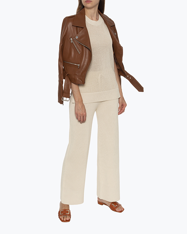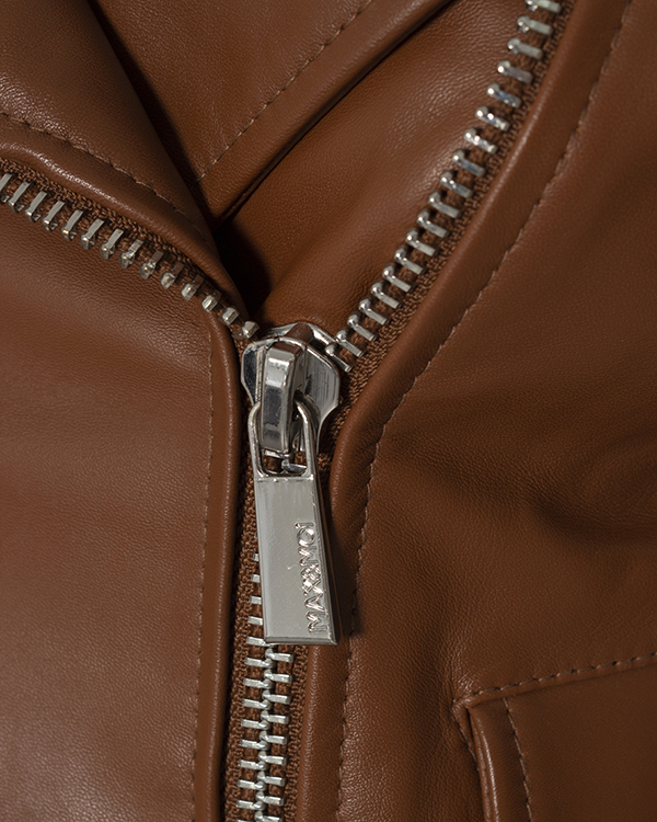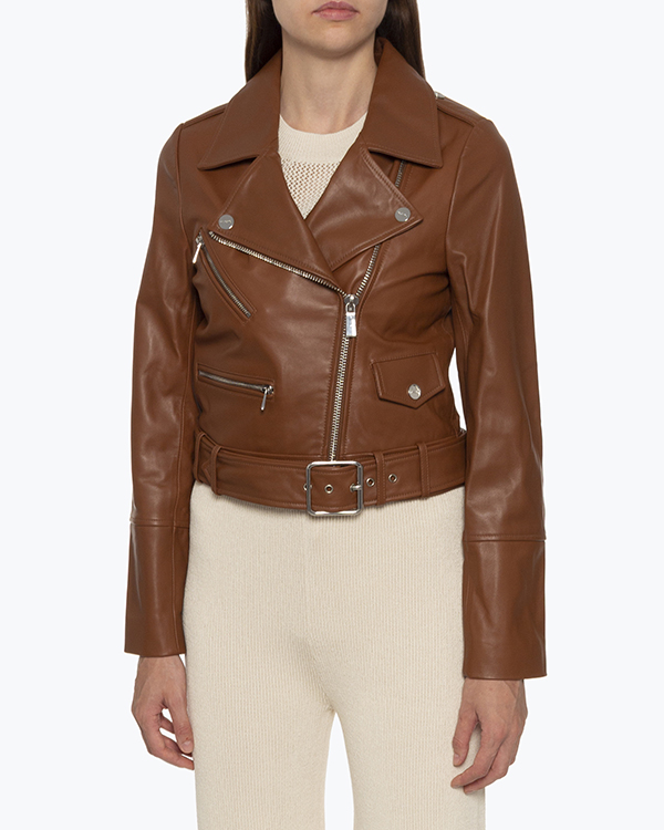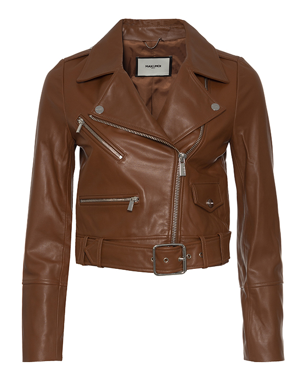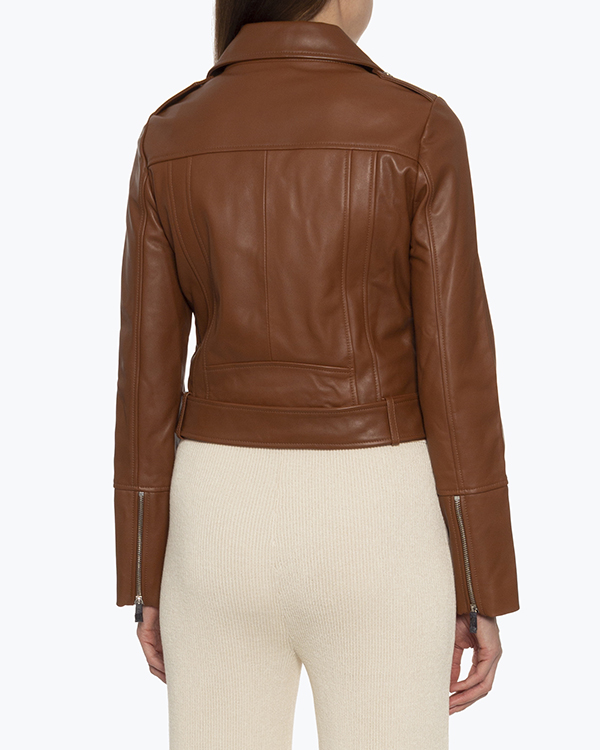 Куртка-косуха из натуральной кожи коричневого оттенка, на подкладке. Модель полуприлегающего укороченного силуэта со смещенной застежкой на металлическую молнию. Куртка дополнена отложным воротником и застежкой на кожаный ремень с металлической пряжкой.