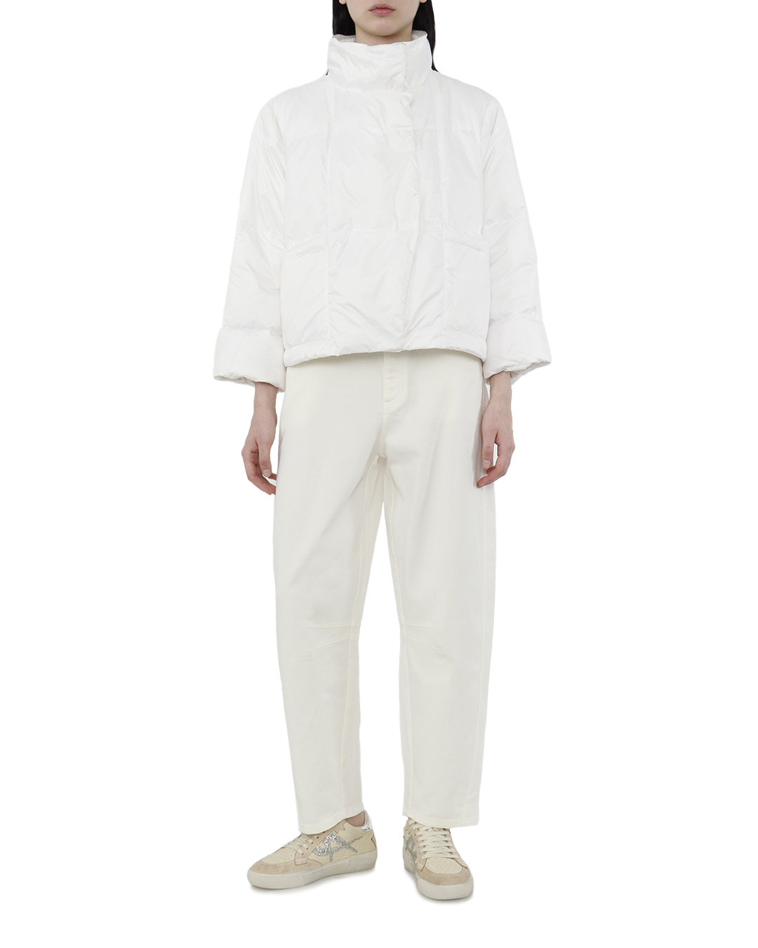 Эта куртка обладает утончённой элегантностью и современным дизайном, который с лёгкостью станет центральным элементом вашего зимнего гардероба. Нежный белый цвет придаёт свежесть и светлость, создавая чистый и изысканный образ. Объёмный силуэт и укороченная длина подчёркивают актуальный тренд на оверсайз, придавая образу современный городской шик. Куртка сшита из высококачественного материала, обеспечивающего надёжную защиту от холода и ветра. Воротник с контрастной отделкой из ребристой вязки добавляет уют и дополнительную изоляцию, привнося интересный текстурный элемент. Он также служит стильным акцентом, который выделяет изделие среди классических моделей. Крупные накладные карманы не только функциональны, но и создают дополнительный визуальный интерес, акцентируя внимание на деталях. Внутренние застёжки скрыты, что поддерживает минималистичный и чистый дизайн. Эта куртка станет отличным выбором как для повседневного ношения, так и для более формальных случаев, добавляя любому образу нотку современности и легкой роскоши.