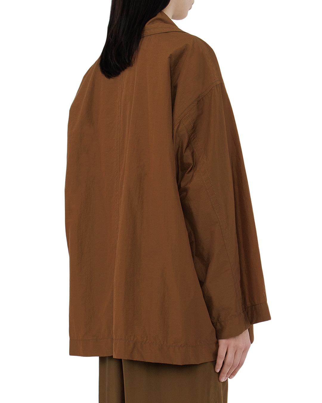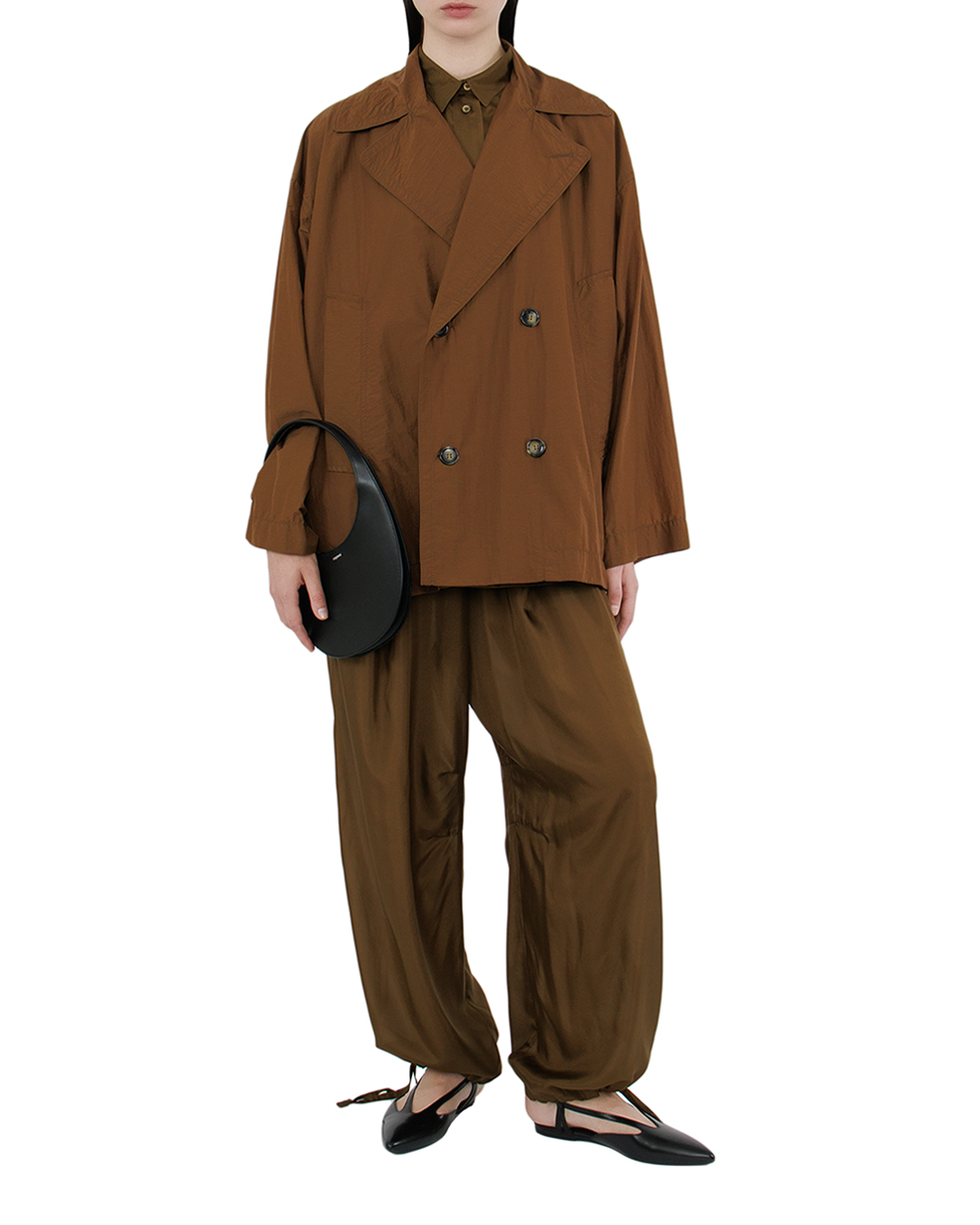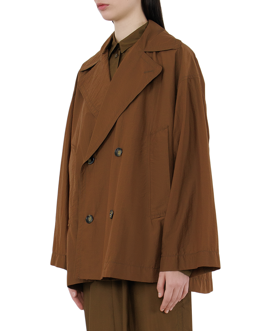 Эта куртка — воплощение современного стиля с элементами классической элегантности. Выполненная в насыщенном коричневом оттенке, она придаёт образу глубину и благородство, идеально вписываясь в осеннюю палитру. Двойная застёжка и широкий воротник создают шикарный акцент, добавляя изделию архитектурной выразительности и подчёркивая внимание к деталям. Свободный крой с опущенной линией плеч обеспечивает комфорт и расслабленную посадку, что особенно актуально для современного ритма жизни. Пуговицы, гармонично сочетающиеся с базовым цветом, завершают образ, внося нотку утончённого изящества. Лёгкая текстура материала придаёт куртке динамичности и позволяет носить её как в прохладные, так и в более тёплые дни. Эта куртка станет стильным дополнением как повседневного, так и более формального образа, позволяя её обладательнице оставаться в центре внимания при любом раскладе.