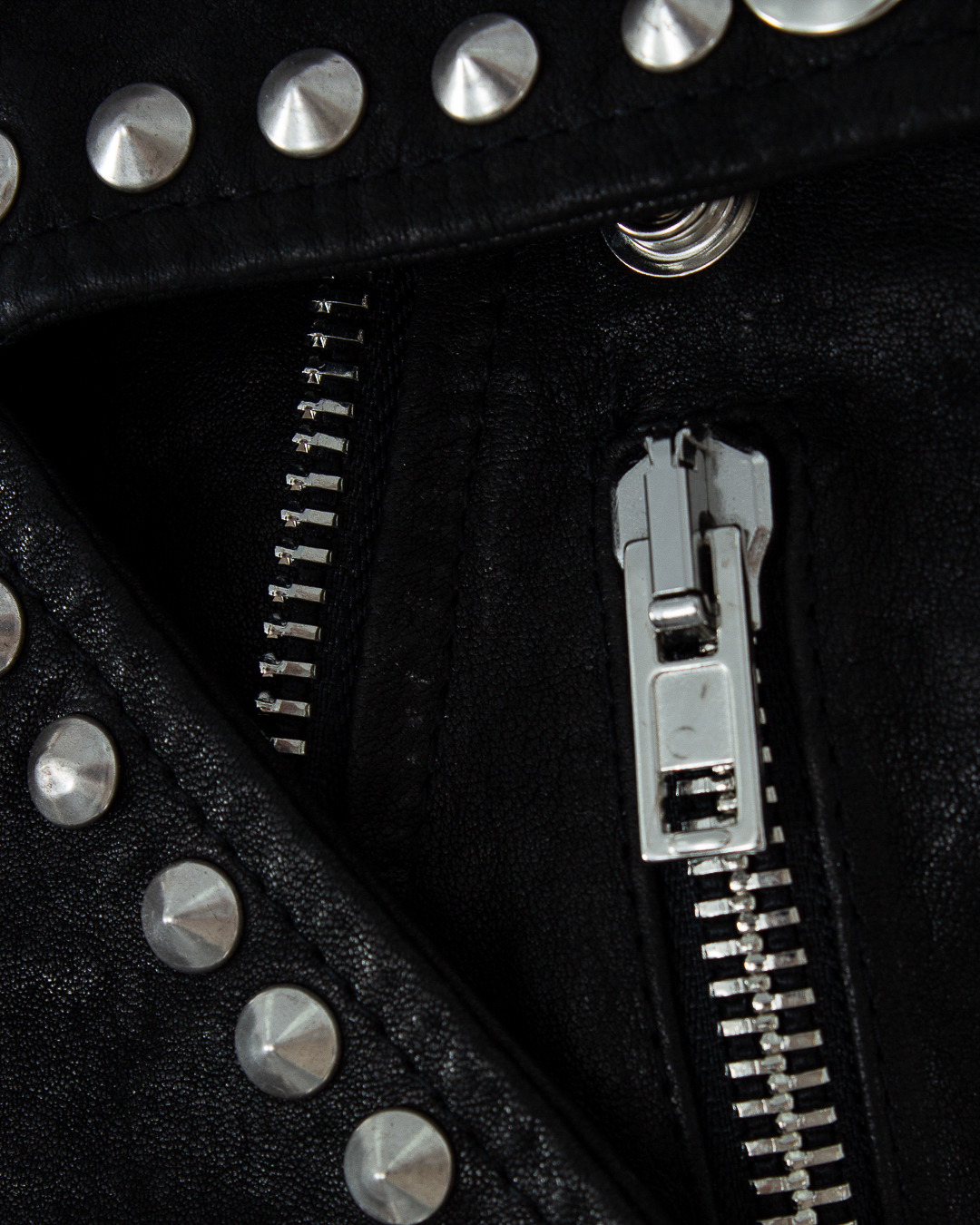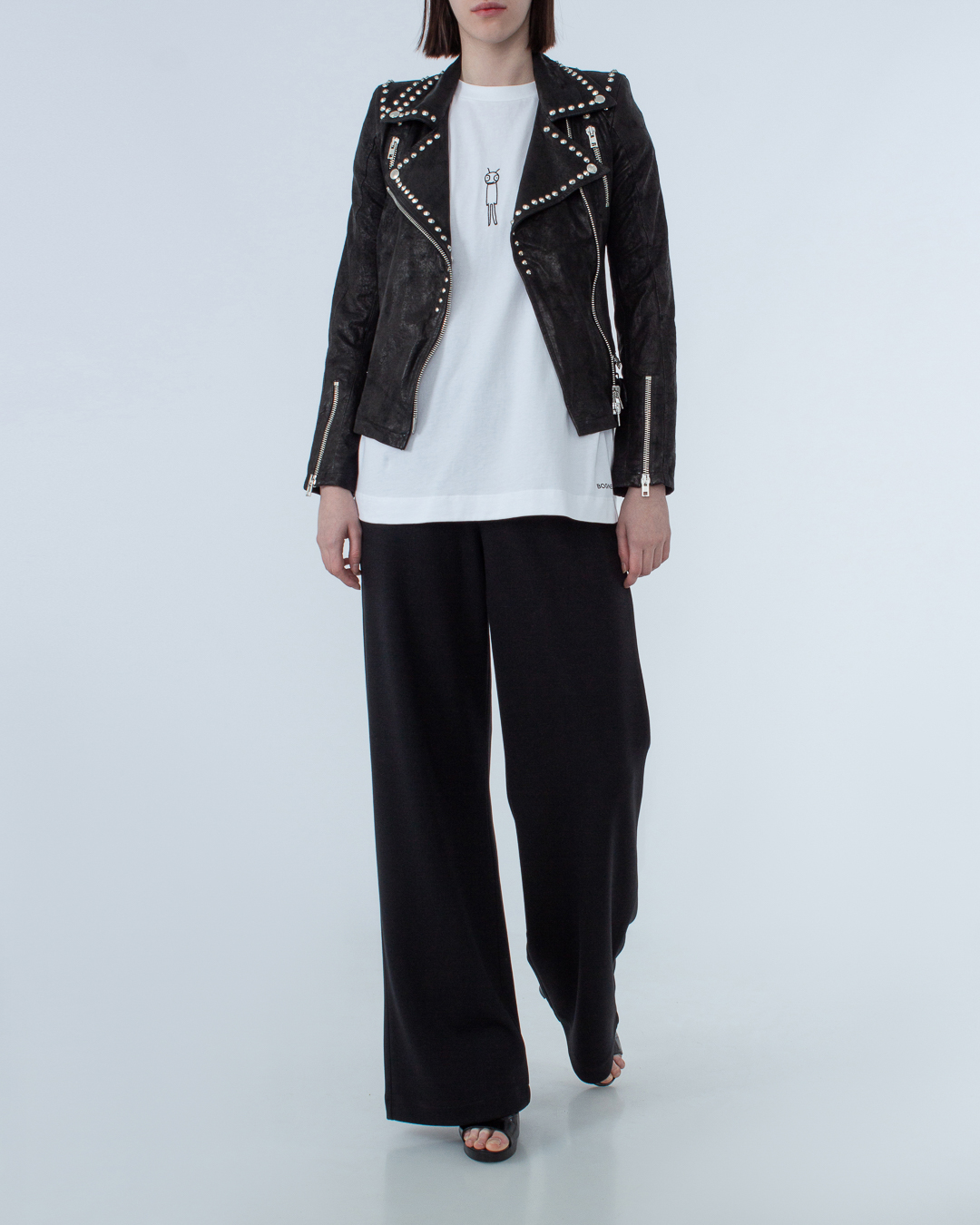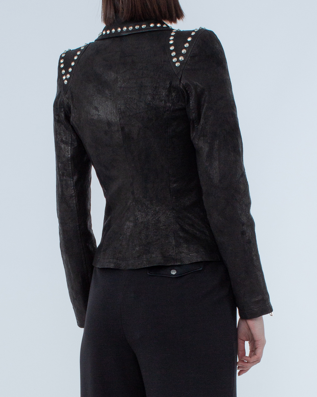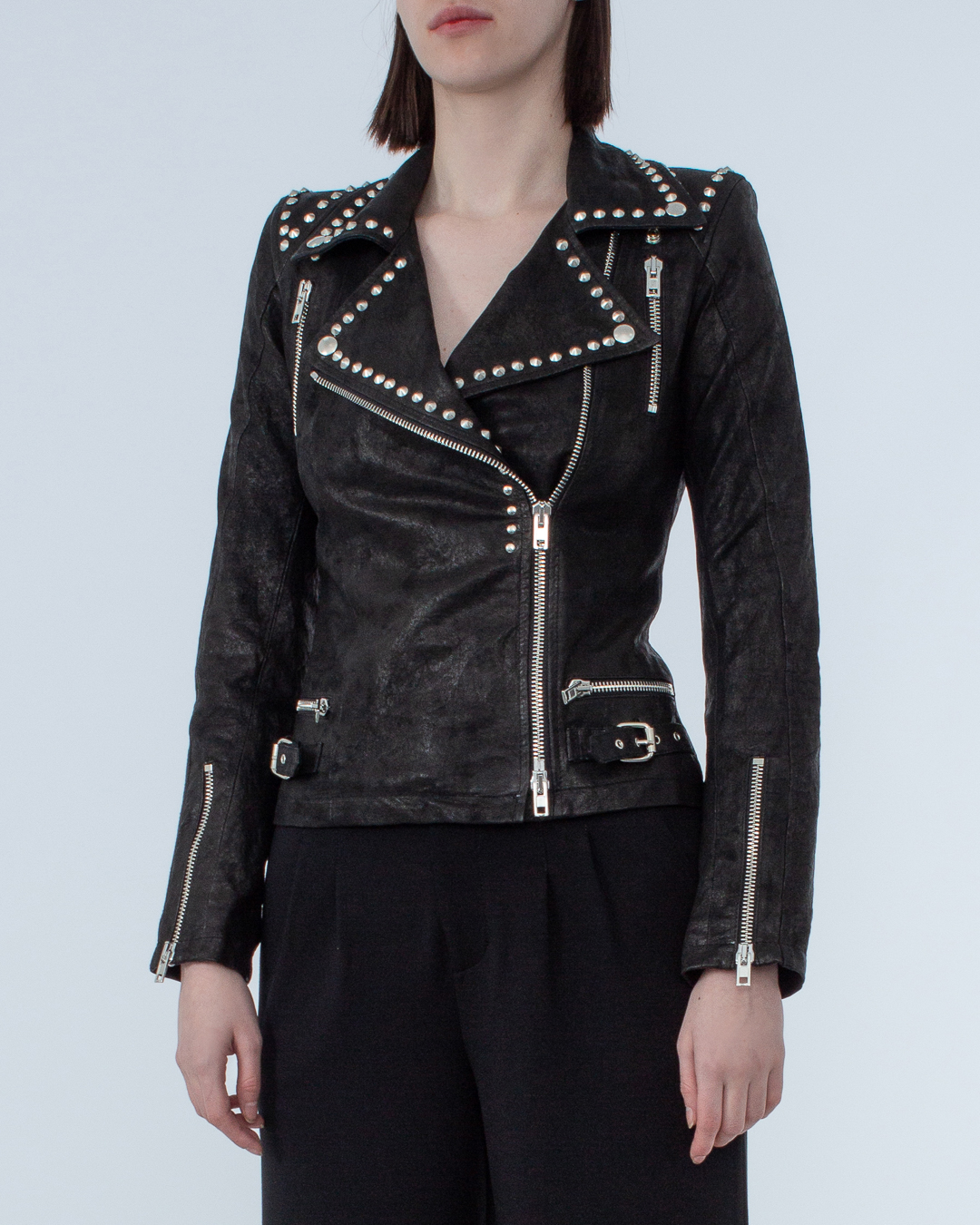Куртка-косуха SWORD из новой коллекции выполнена из натуральной кожи черного цвета с отделкой металлическими клепками. Модель прилегающего приталенного силуэта со смещенной застежкой на молнию и несколькими карманами. Изделие дополнено отложным воротником и кожаными хлястиками с металлическими пряжками.