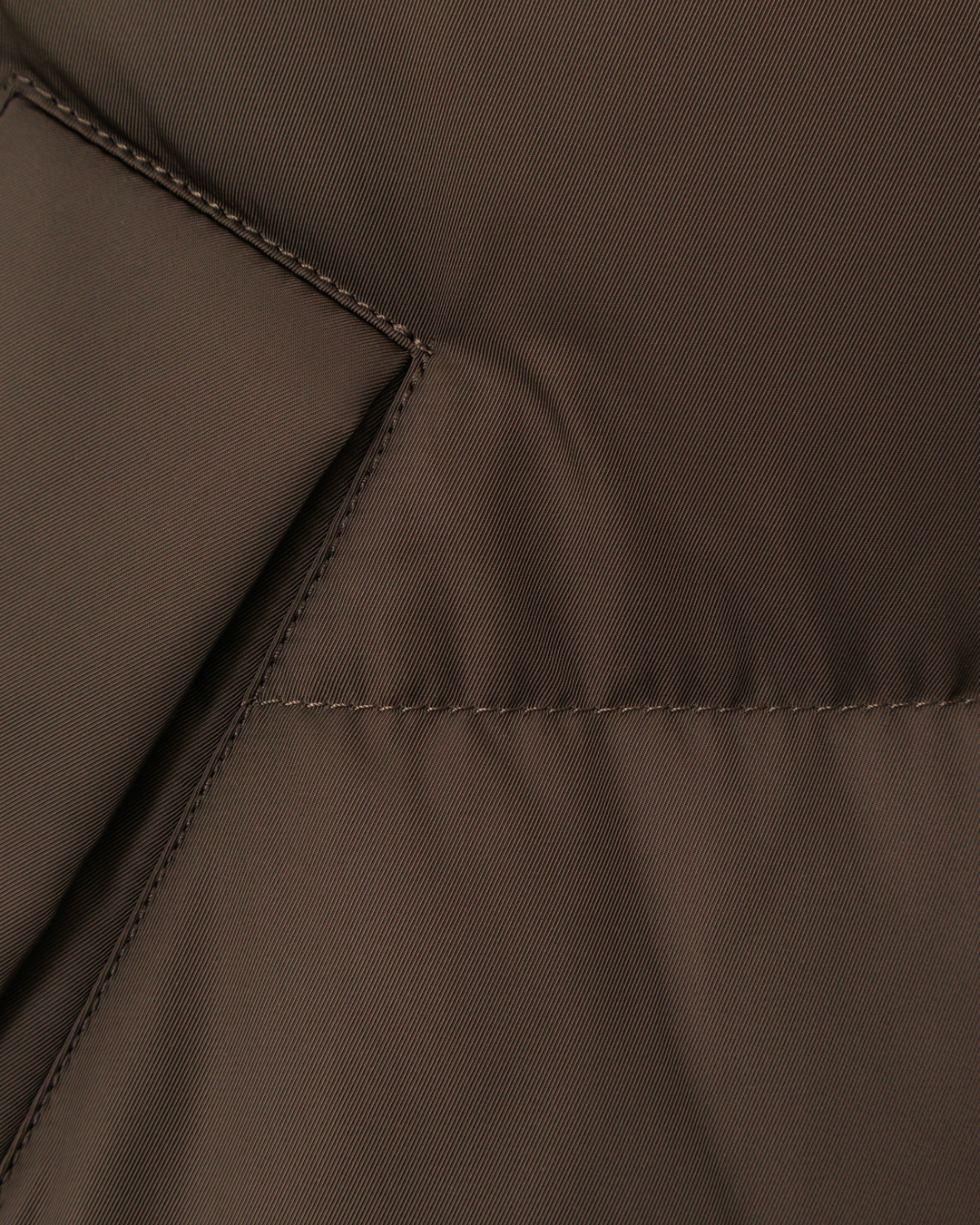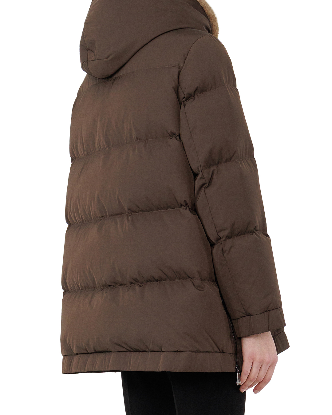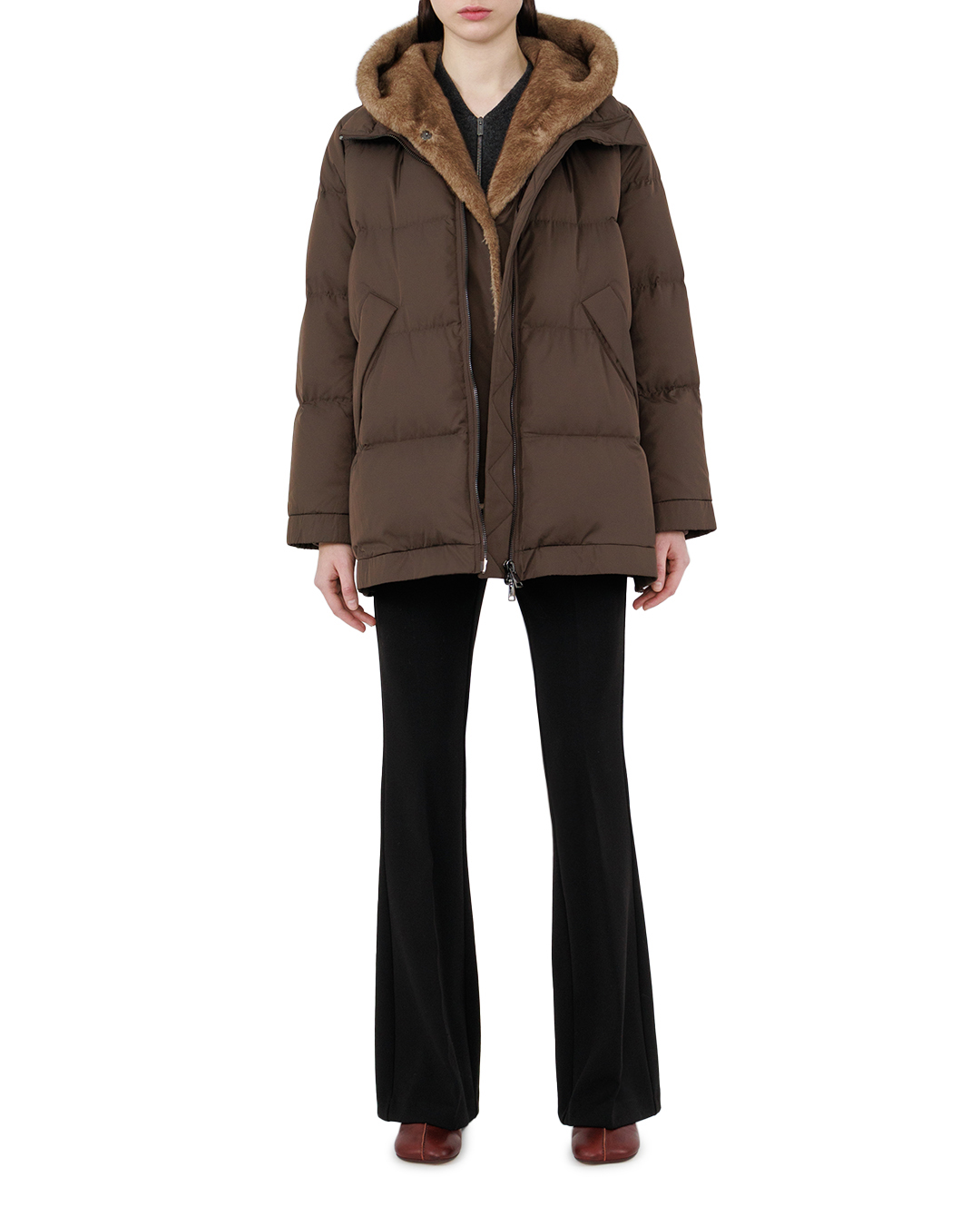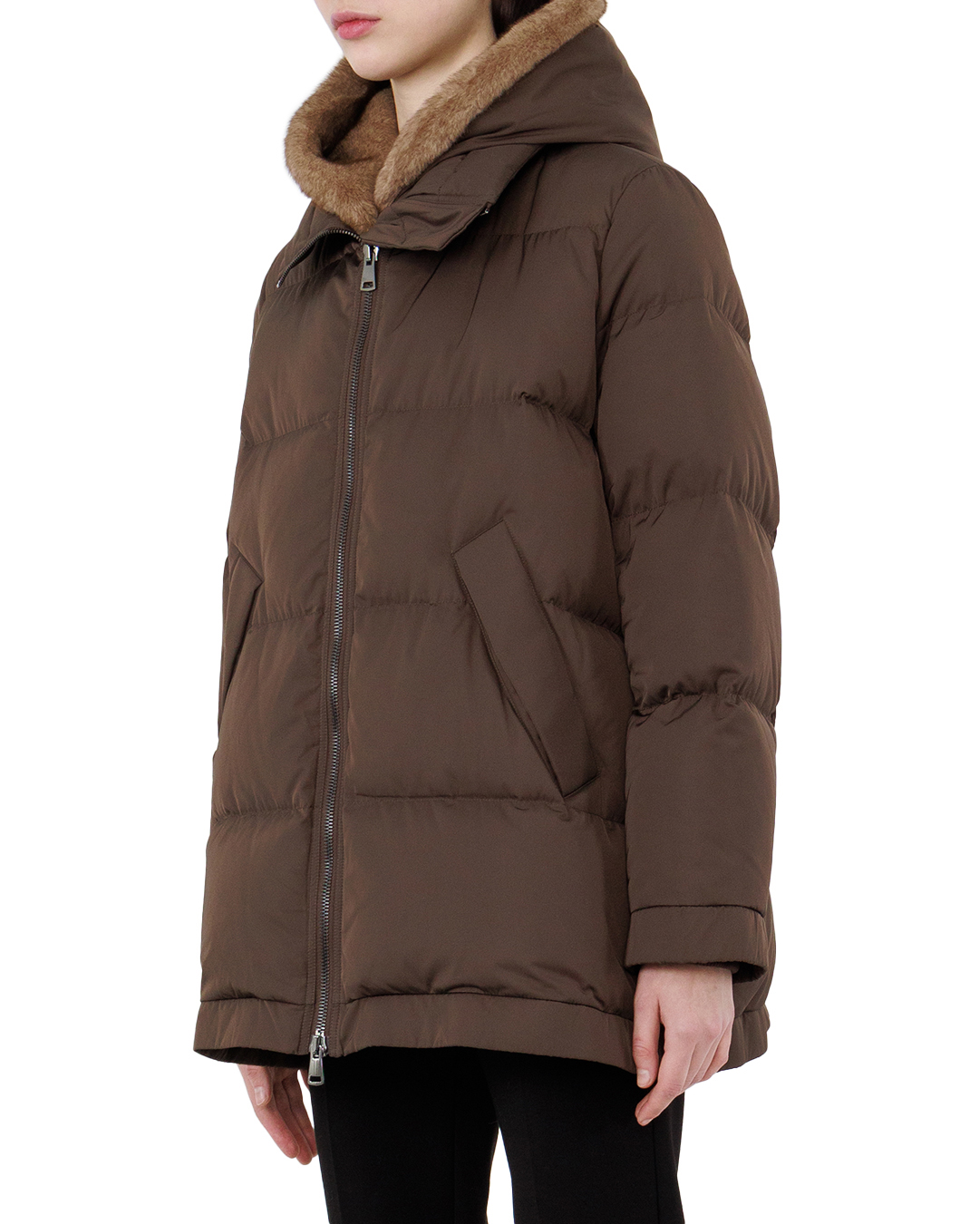 Эта двусторонняя куртка — пример элегантной универсальности и изысканности. Воплощенная в теплых оттенках, она сочетает в себе практичность и стиль. Одна сторона выполнена из высококачественного непродуваемого материала в насыщенном кофейном цвете, создающего уютный и современный образ. На обратной стороне мягкий искусственный мех светло-коричневого оттенка, добавляющий текстурный контраст и роскошное тепло. Объемный капюшон с меховой отделкой обеспечивает комфорт и акцентирует внимание на деталях, создавая гармоничный и законченный силуэт. Прямой крой с утолщенной стёжкой помогает сохранить тепло, а двухсторонняя молния предлагает легкость в трансформации внешнего вида, позволяя с легкостью переходить от одной текстуры к другой. Потайные карманы на молнии и аккуратные швы подчёркивают изысканность и внимание к мельчайшим деталям, сохраняя баланс между функциональностью и эстетикой. Эта куртка станет незаменимой частью вашего гардероба, сочетая в себе комфорт и изысканный стиль.