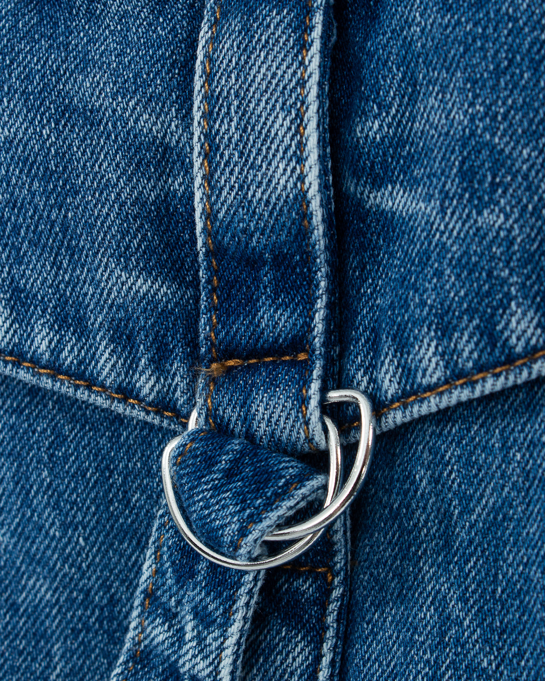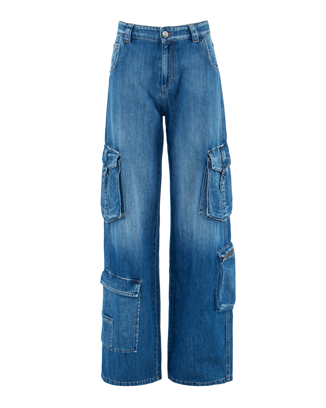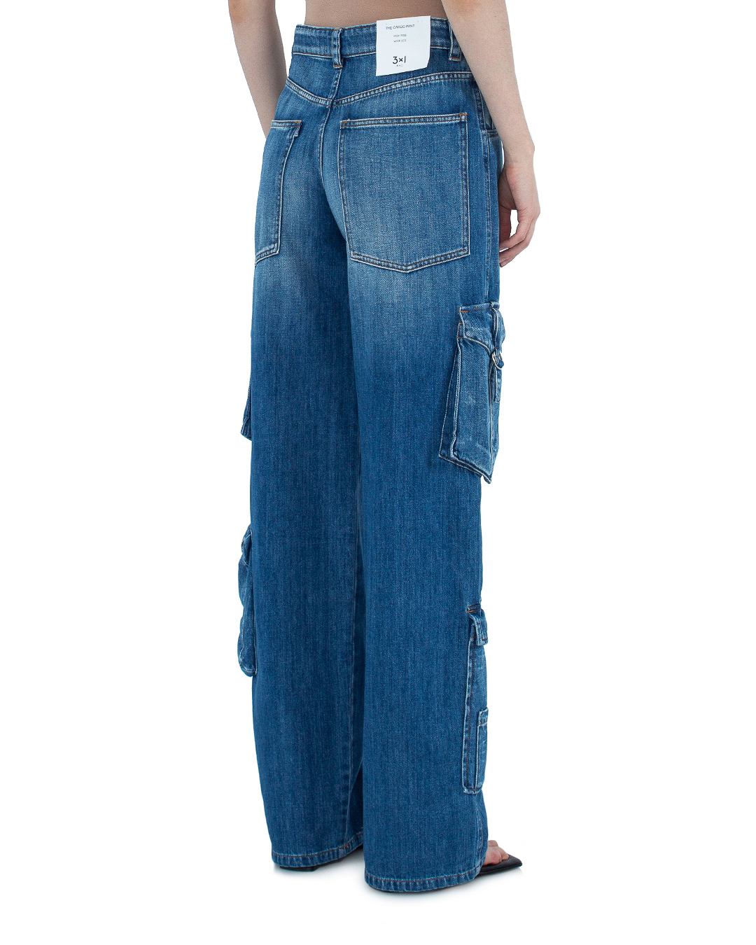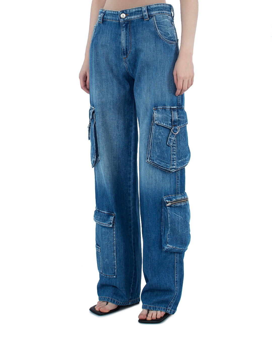 Женские джинсы из плотного хлопкового денима синего оттенка. Модель свободного силуэта с широкими брючинами дополнена объемными накладными карманами. Высокая комфортная посадка на талии и застежка на молнию и пуговицу.