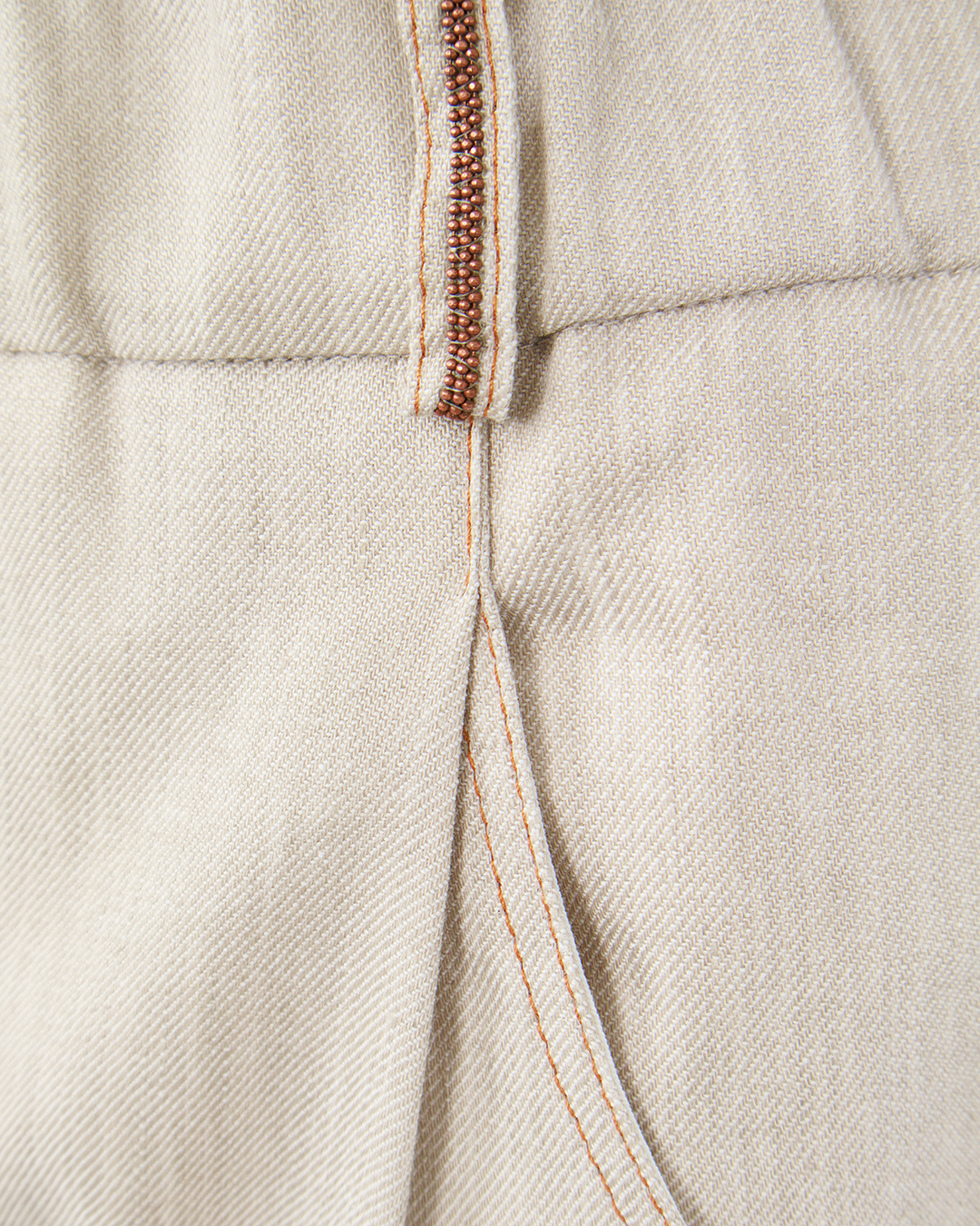 Эти изысканные джинсы выполнены в современном стиле, соединяющем комфорт и элегантность. Прямой крой и высокая посадка подчёркивают утончённость и создают благородный силуэт, визуально удлиняя ноги.  Ткань обладает легкой текстурой и светлым оттенком, что придаёт изделию свежесть и создаёт универсальную основу для различных образов. Акцент на талии усилен замысловатыми вытачками и элегантными защипами, которые добавляют объем и уникальную форму в области бедер.  Строчка выполнена с использованием контрастных нитей, что добавляет тонкую выразительность и подчеркивает каждую деталь конструкции. Шлёвки для ремня и верхняя кромка оформлены лаконично, с минималистичной отделкой, гарантируя гармоничное сочетание с аксессуарами. Эти джинсы идеально подходят для создания как повседневных, так и более формальных ансамблей, оставаясь в тренде и демонстрируя безупречный вкус.
