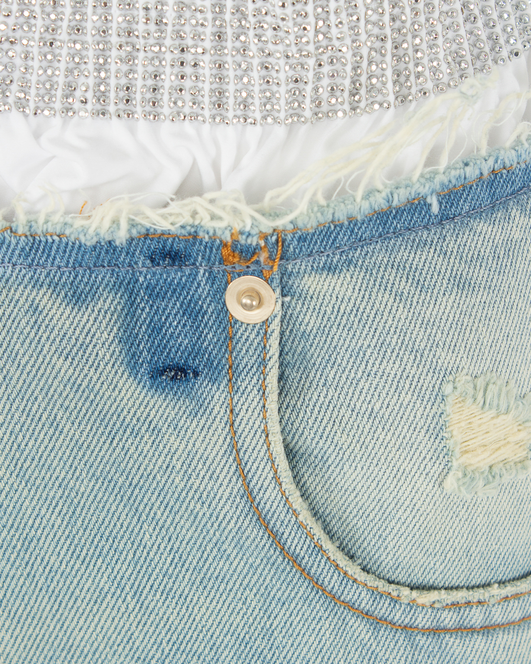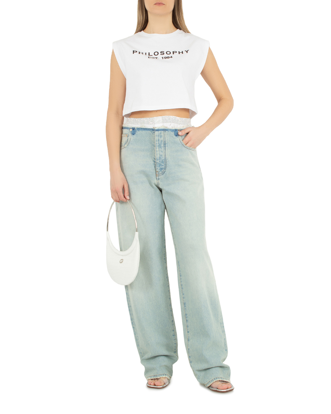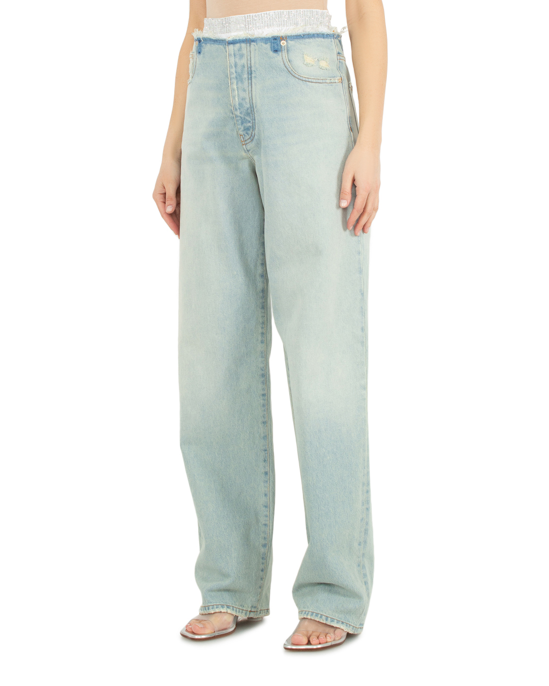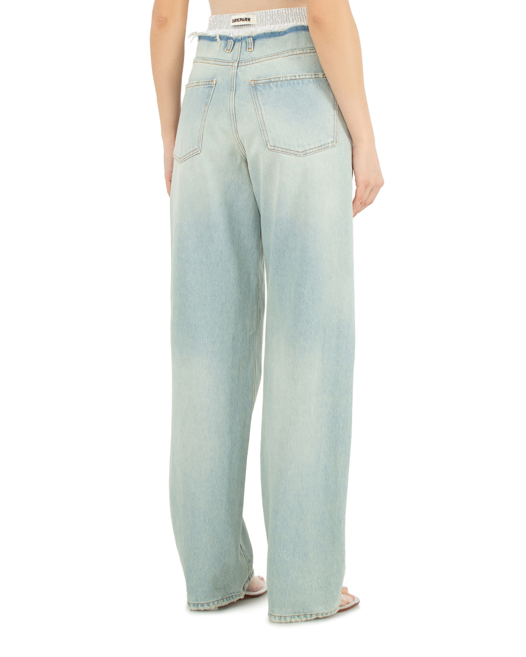 Широкие джинсы Darkpark из уплотненного хлопкового денима с декоративными потертостями. Модель прямого силуэта с высокой посадкой на талии и застежкой на молнию и пуговицу дополнена пятью карманами. Джинсы стилизованы отделкой в виде торчащего нижнего белья с эластичной линией пояса и отделкой кристаллами.