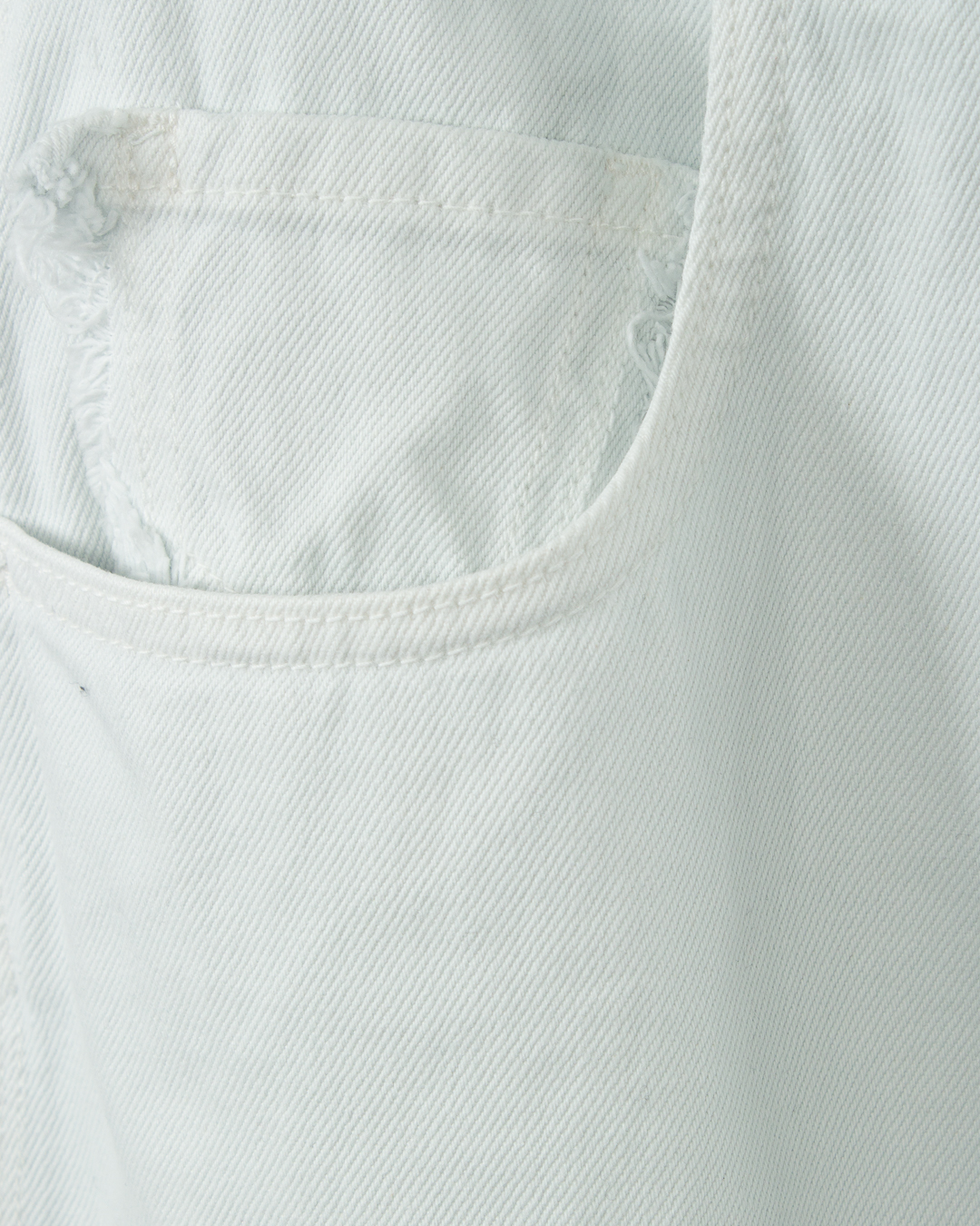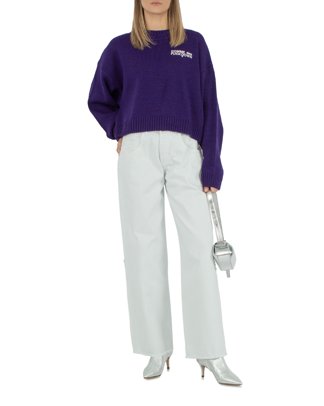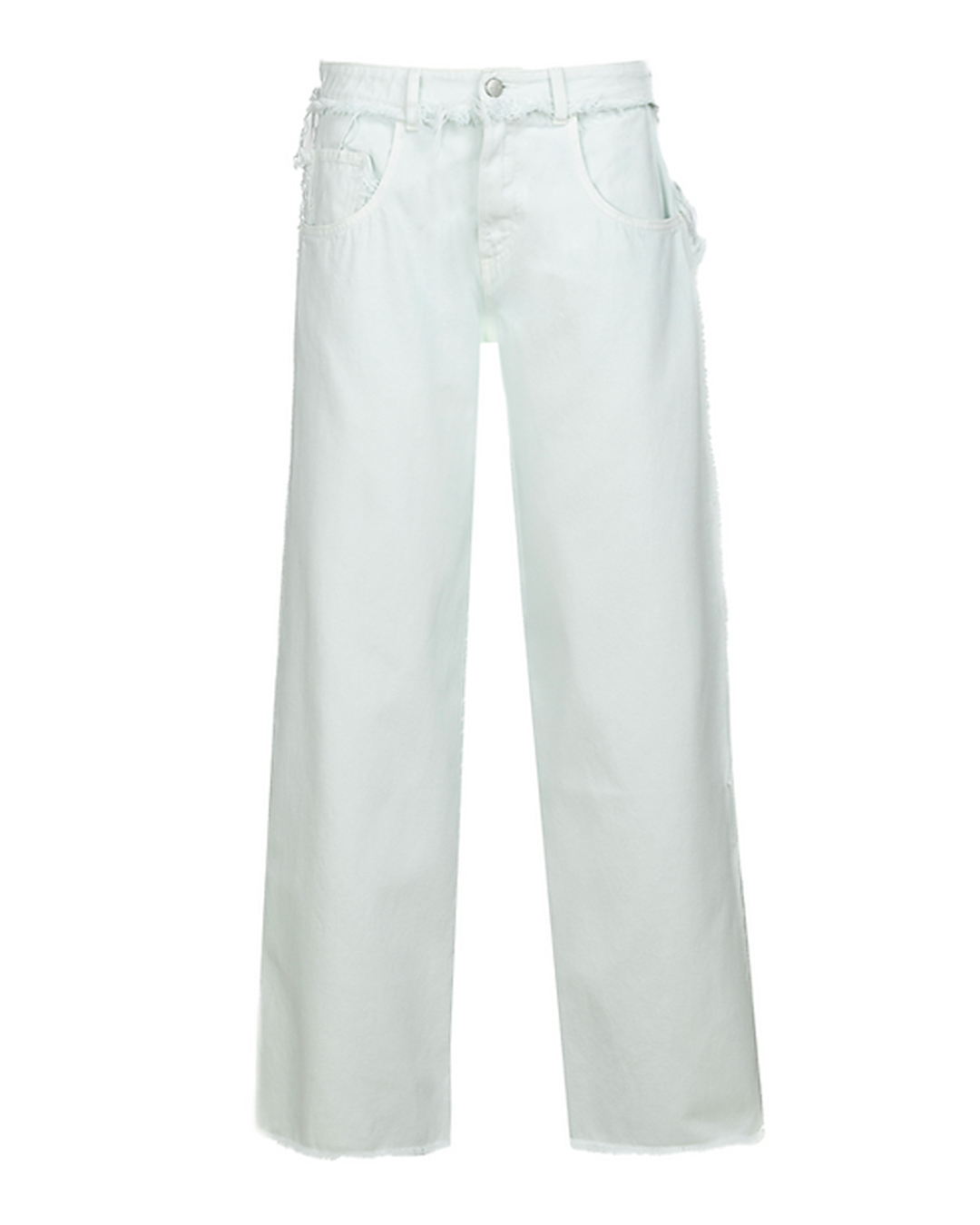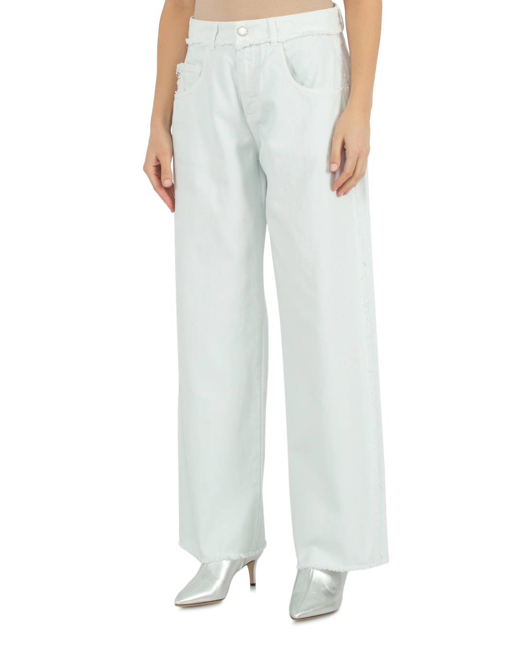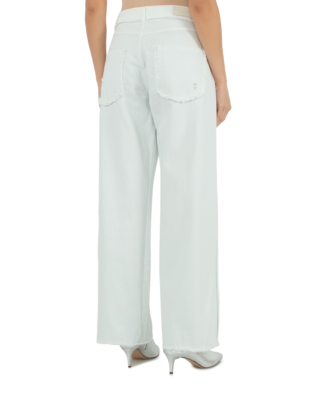 Широкие джинсы ICON DENIM из хлопкового денима с декоративными потертостями. Модель прямого силуэта с высокой посадкой и застежкой на молнию и пуговицу дополнена пятью карманами.