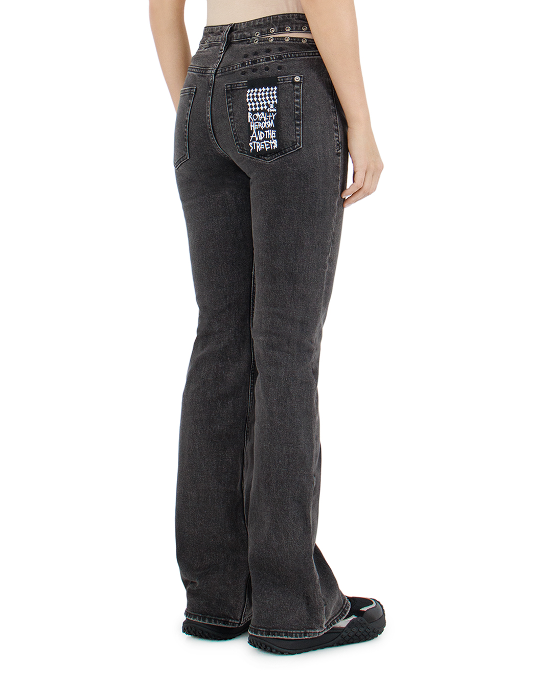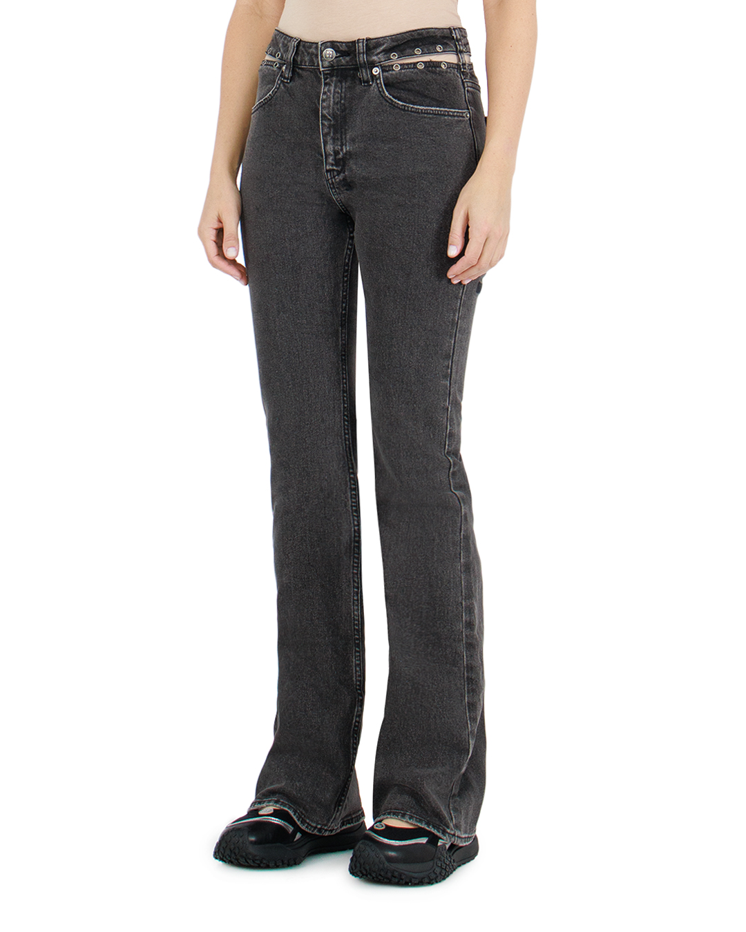 Джинсы KSUBI из плотного хлопкового денима. Модель зауженного силуэта с расклешенными от колена штанинами. Изделие с высокой посадкой на талии и застежкой на молнию и пуговицу. Пояс декорирован небольшими люверсами и разрезами. Джинсы с классическими пятью карманами и шлевками для ремня.