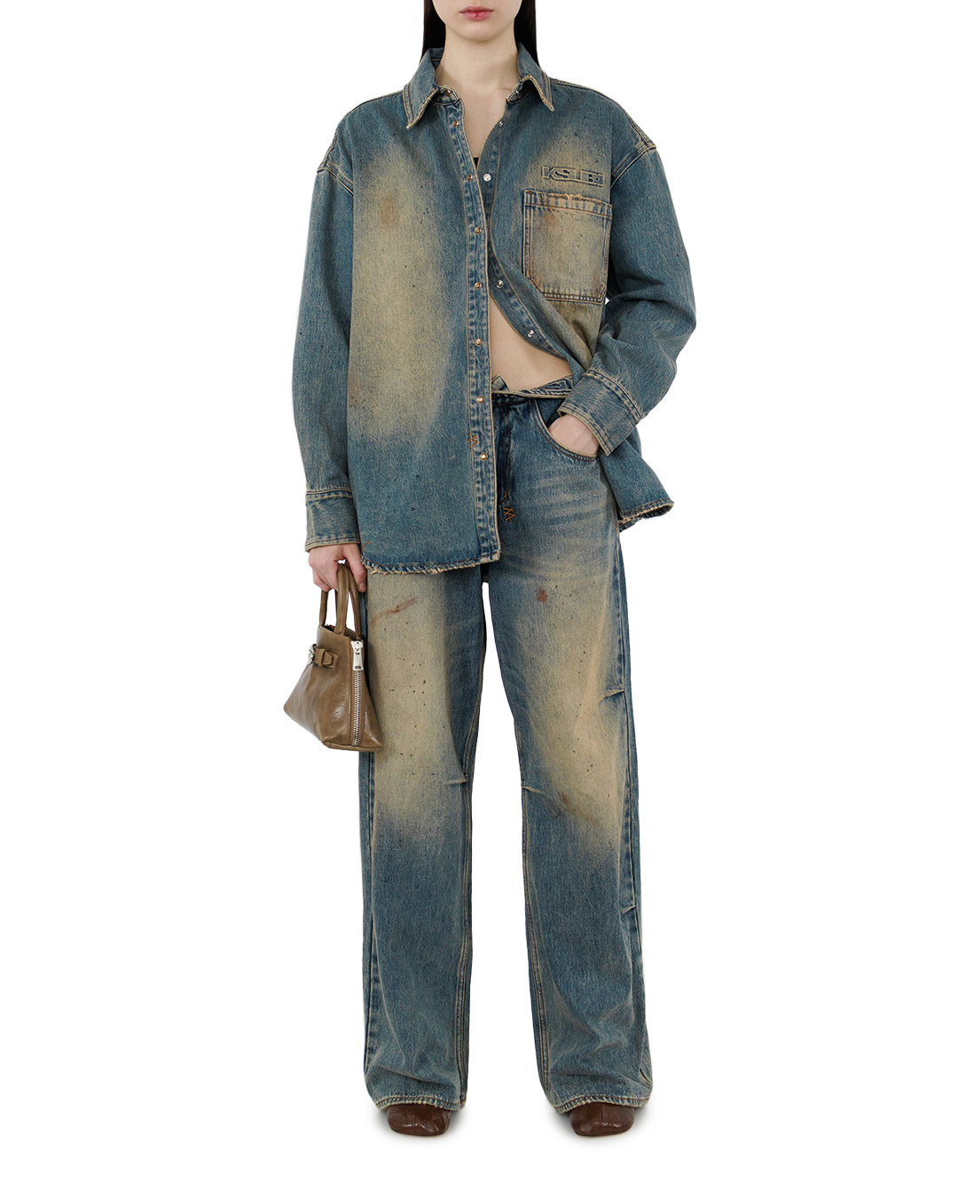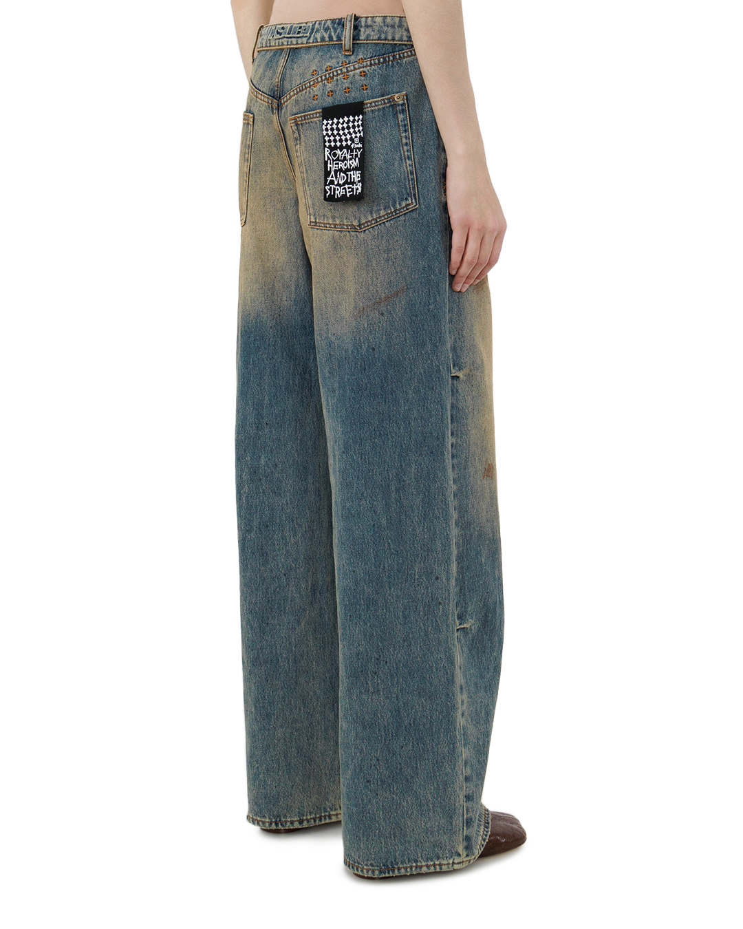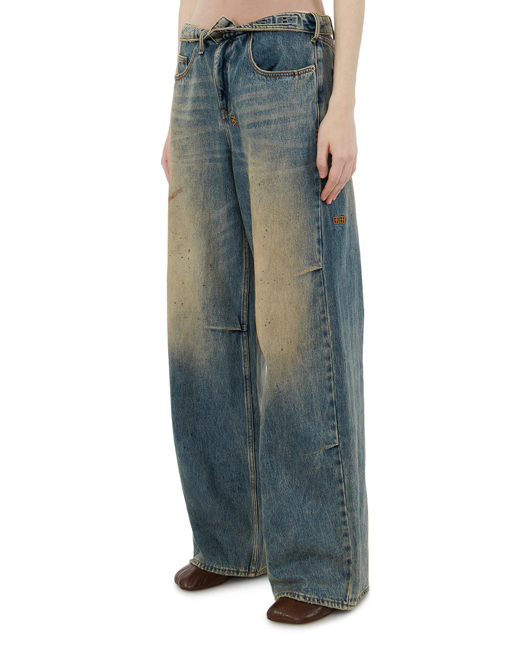 Эти джинсы представляют собой воплощение смелого, винтажного стиля с элементами современного тренда. Изготовленные из прочного денима, они привлекают внимание своим эффектом искусственного состаривания и уникальным оттенком. Широкие штанины создают расслабленный, стильный силуэт, добавляя свободы движений и комфорта. Высокая посадка подчёркивает линию талии, придавая фигуре элегантность и утончённость. Детали отделки придают джинсам уникальный характер: аккуратная строчка вдоль карманов и пояс с завязкой добавляют изюминку ручной работы. Легкие потёртости и цветовые переходы создают эффект естественной винтажности, добавляя глубину и текстуру. Эти джинсы станут центральным элементом непринуждённого и модного образа, отлично сочетаясь как с базовыми футболками, так и с жакетами, подчеркивая вашу индивидуальность и чувство стиля.