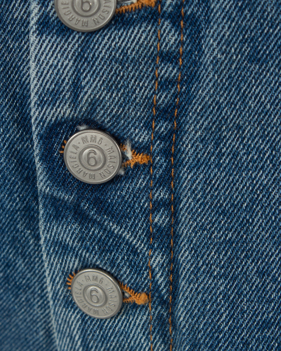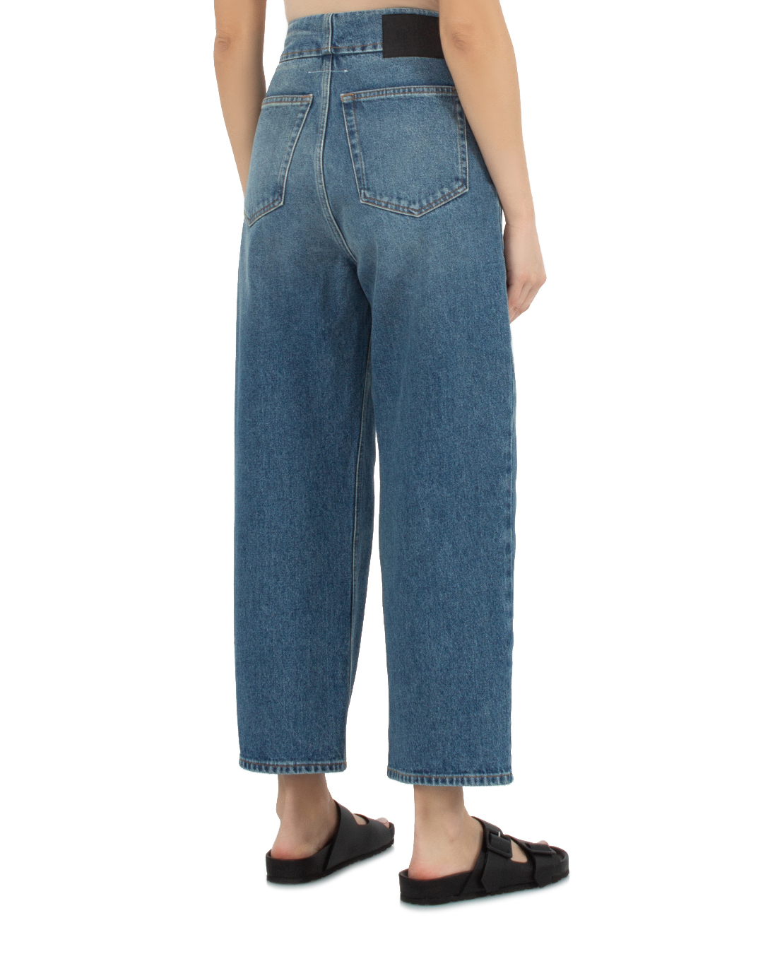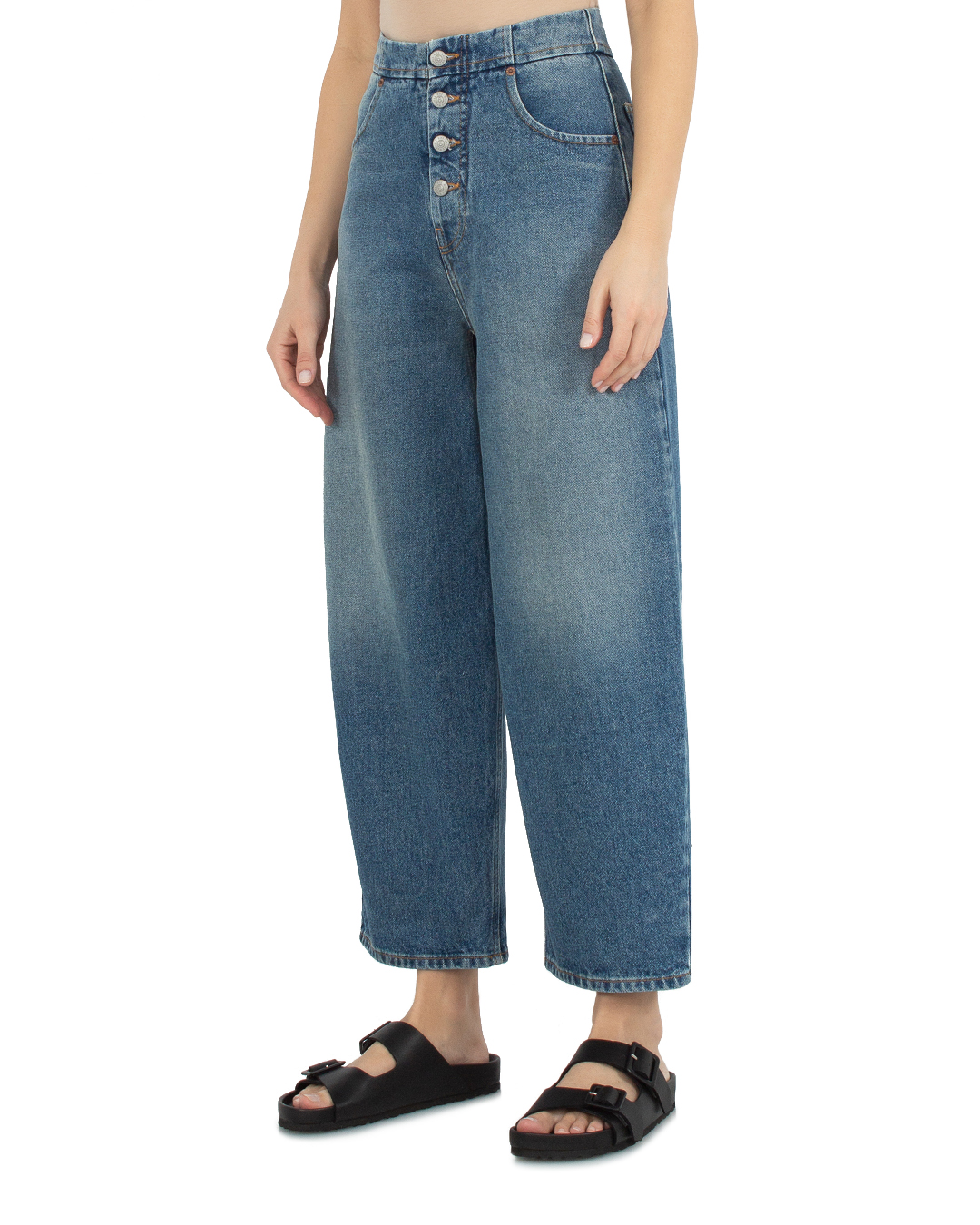 Джинсы MM6 Maison Margiela из плотного хлопкового денима. Модель прямого укороченного силуэта с широкими брючинами и высокой комфортной посадкой на талии. Джинсы с застежкой на пуговицы.