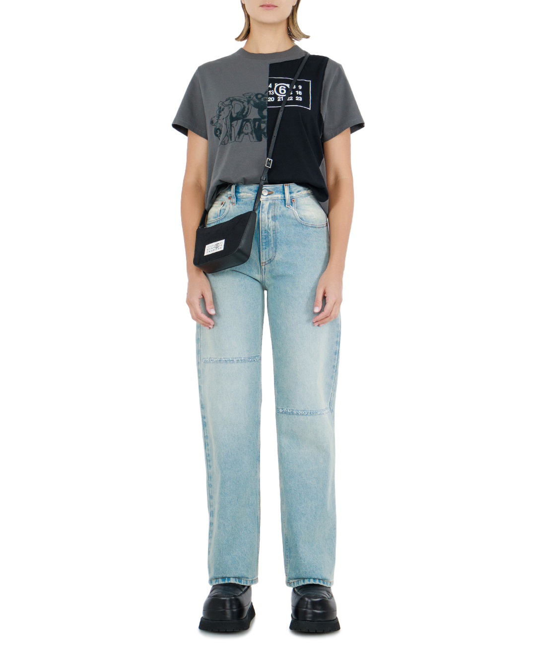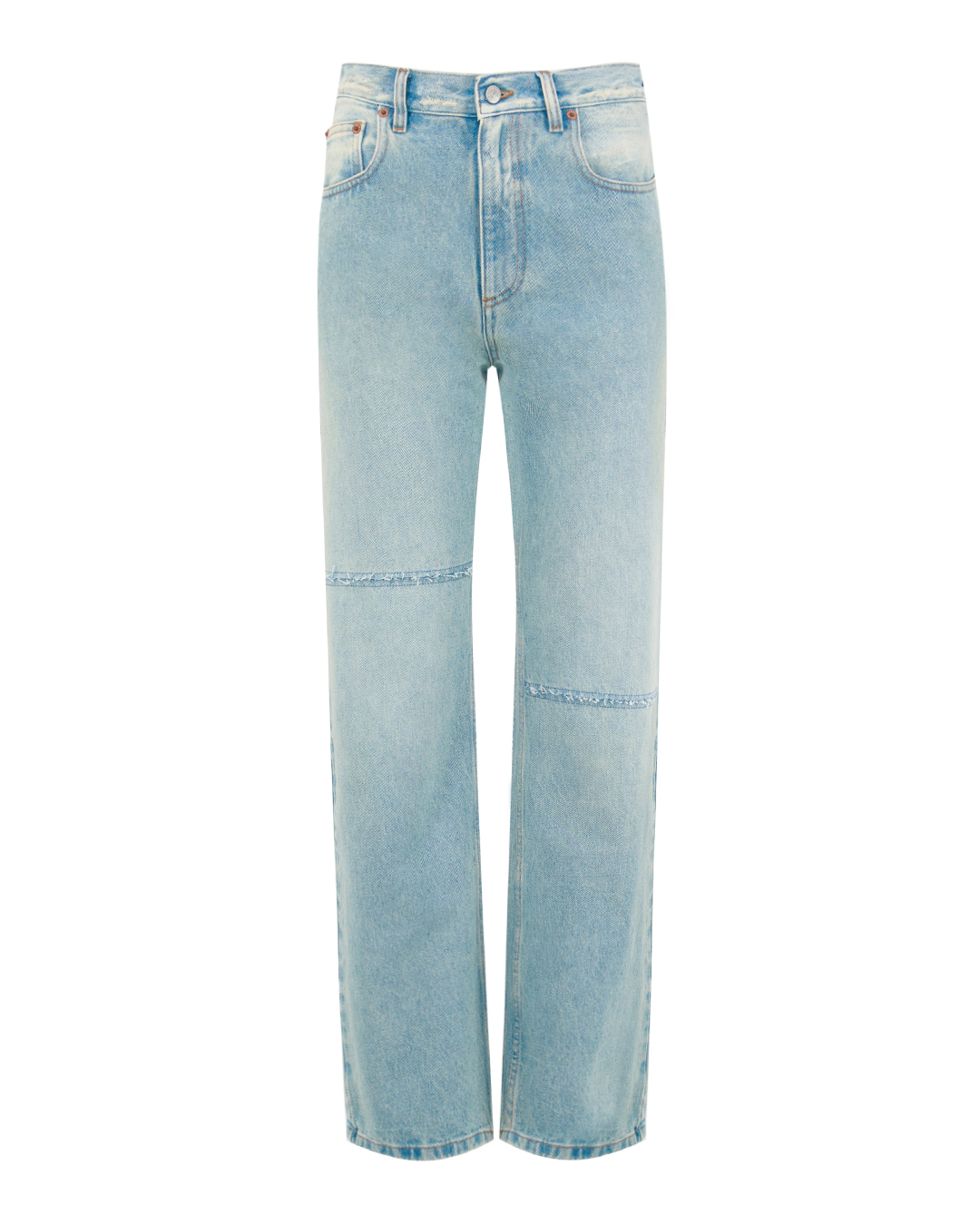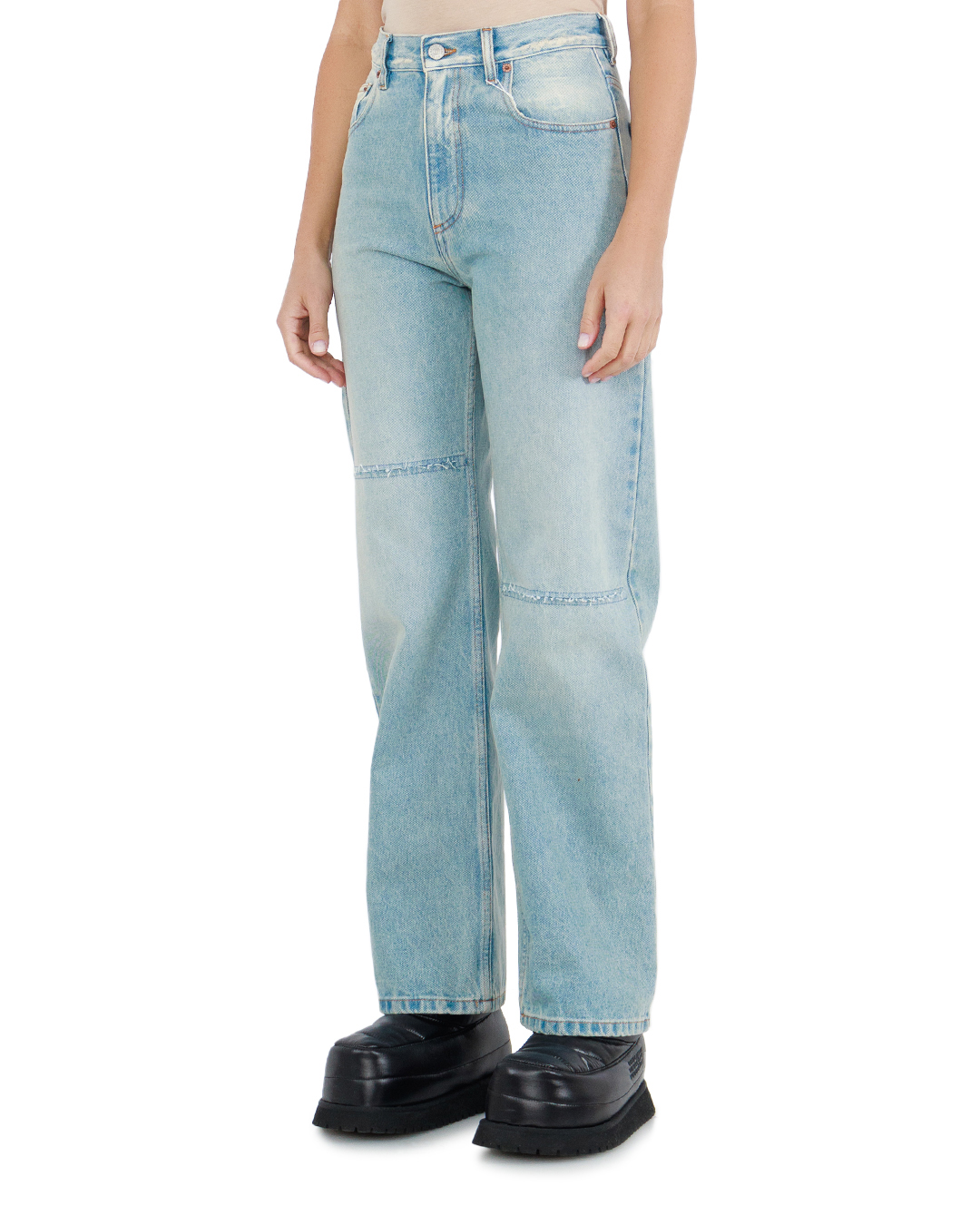 Джинсы свободного кроя с высокой посадкой и пятью карманами изготовили из хлопка с искусственными потертостями и разрезами. Пояс с шлевками для ремня. Модель застегивается на молнию и пуговицу.