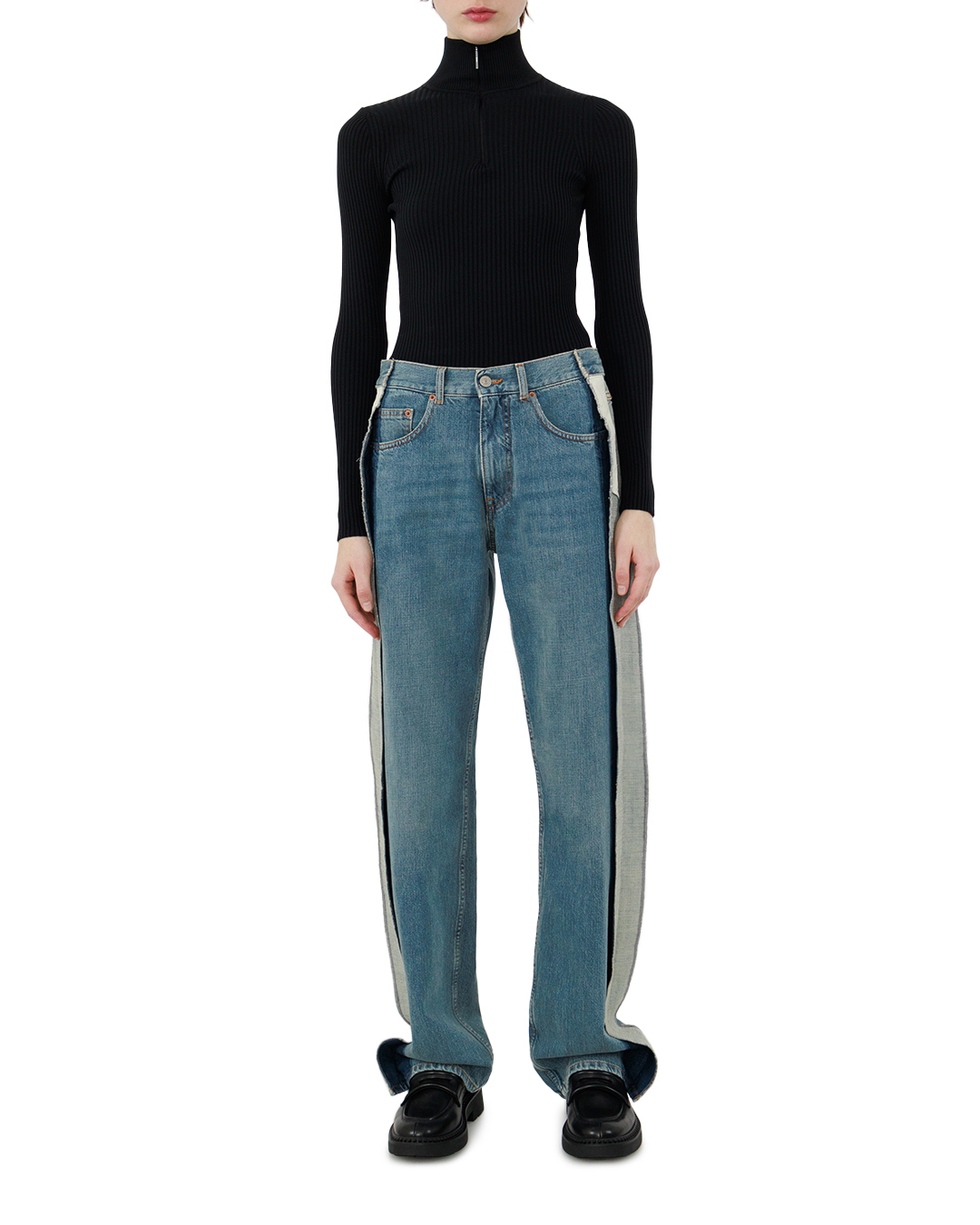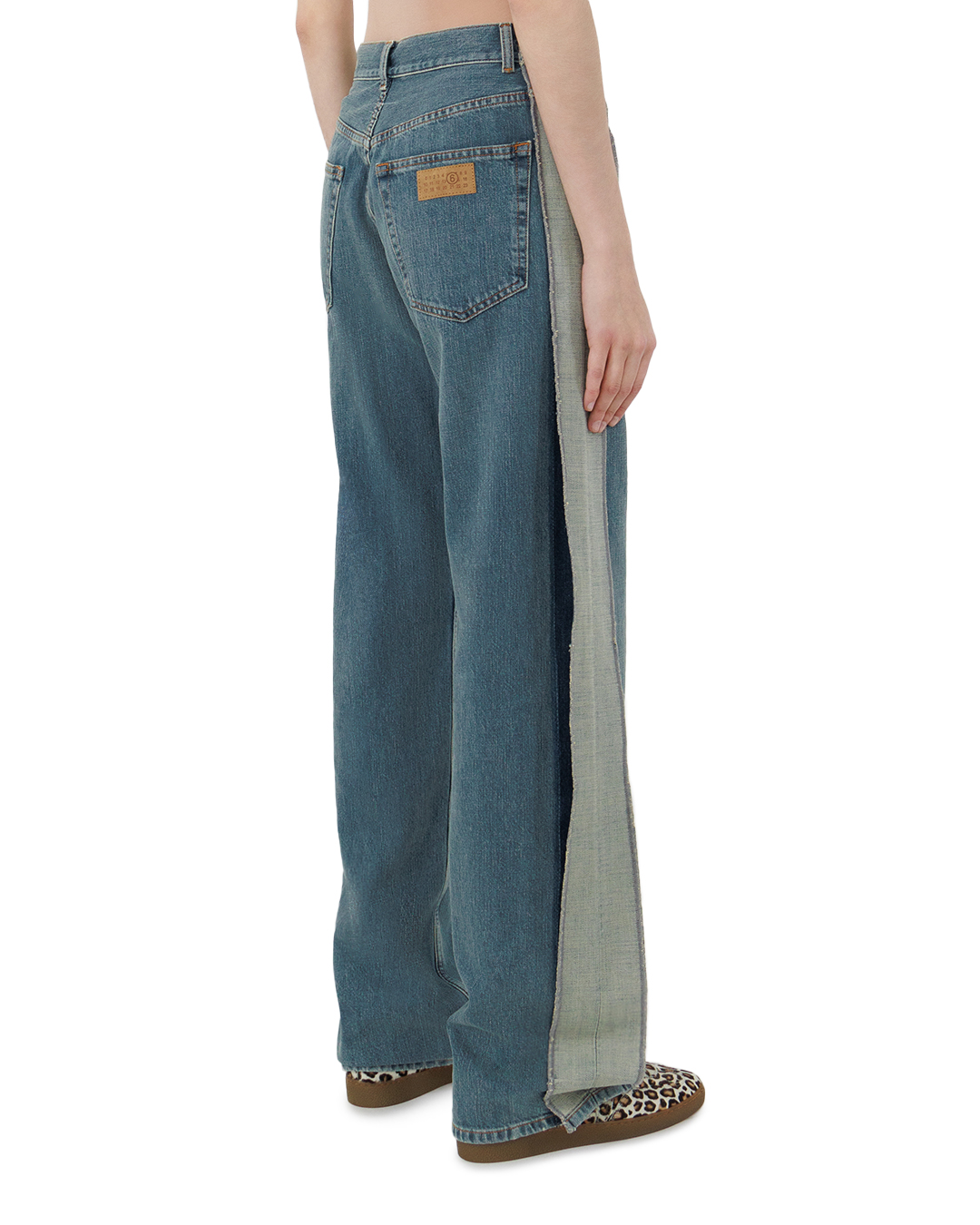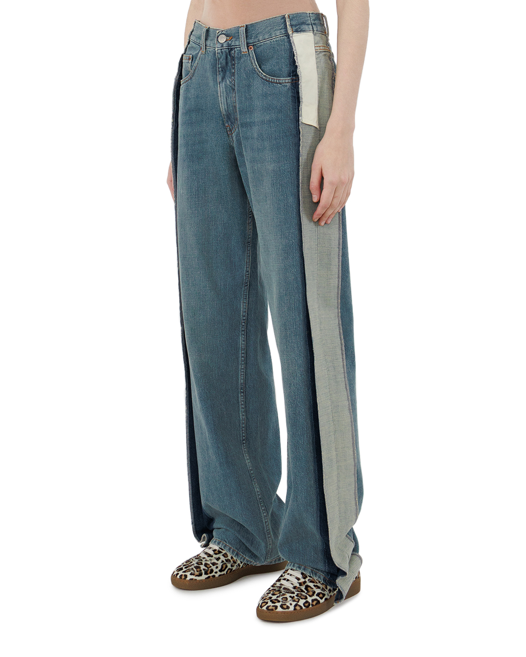 Эти джинсы — яркий пример инновационного подхода к классическому дениму. Выполненные из высококачественного материала, они демонстрируют искусное сочетание разных оттенков синего, что добавляет глубину и визуальный интерес. Главный акцент на дизайне — широкие штанины, которые создают эффект драматического объема и свободы движения. Боковые вставки светлого оттенка образуют контраст, подчеркивающий современность и стиль, и визуально удлиняют силуэт. Классическая посадка и функциональные элементы, такие как передние и задние карманы, сохраняют узнаваемую эстетику джинсов, обеспечивая практичность и комфорт. Пояс с пуговицей и молнией дополняет удобство застегивания, оставаясь верным традициям джинсового кроя. Легкие потертости в области бедер добавляют изделию характерный винтажный вид, оставляя ощущение естественной изношенности, что усиливает индивидуальность изделия. Эти джинсы — идеальное воплощение негабаритного тренда и незаменимый элемент гардероба для тех, кто ценит стиль, комфорт и современные тенденции в моде.