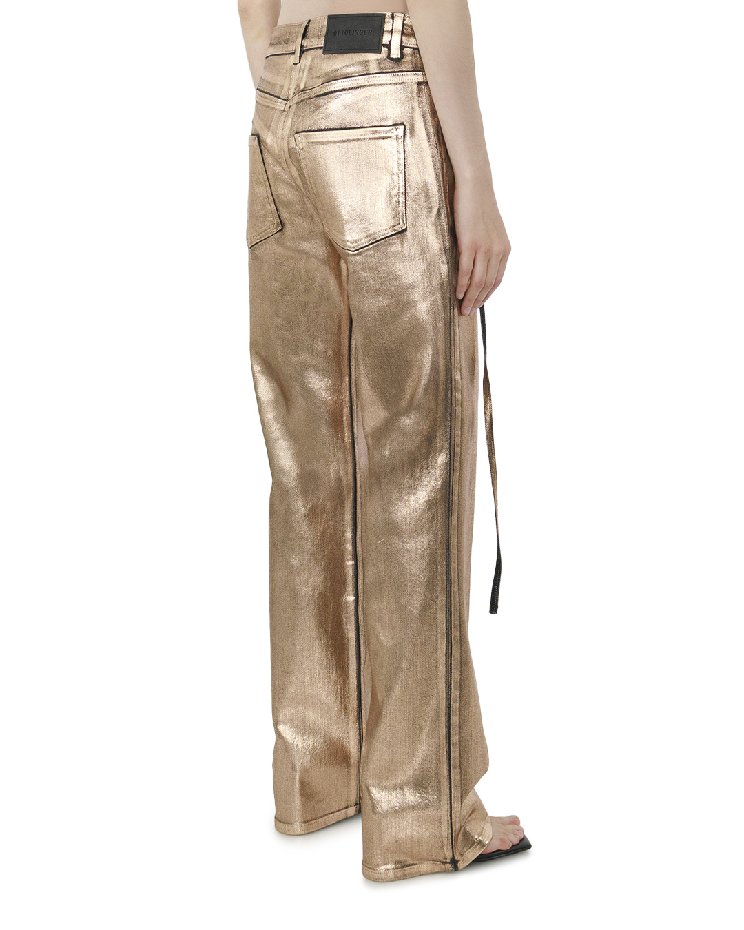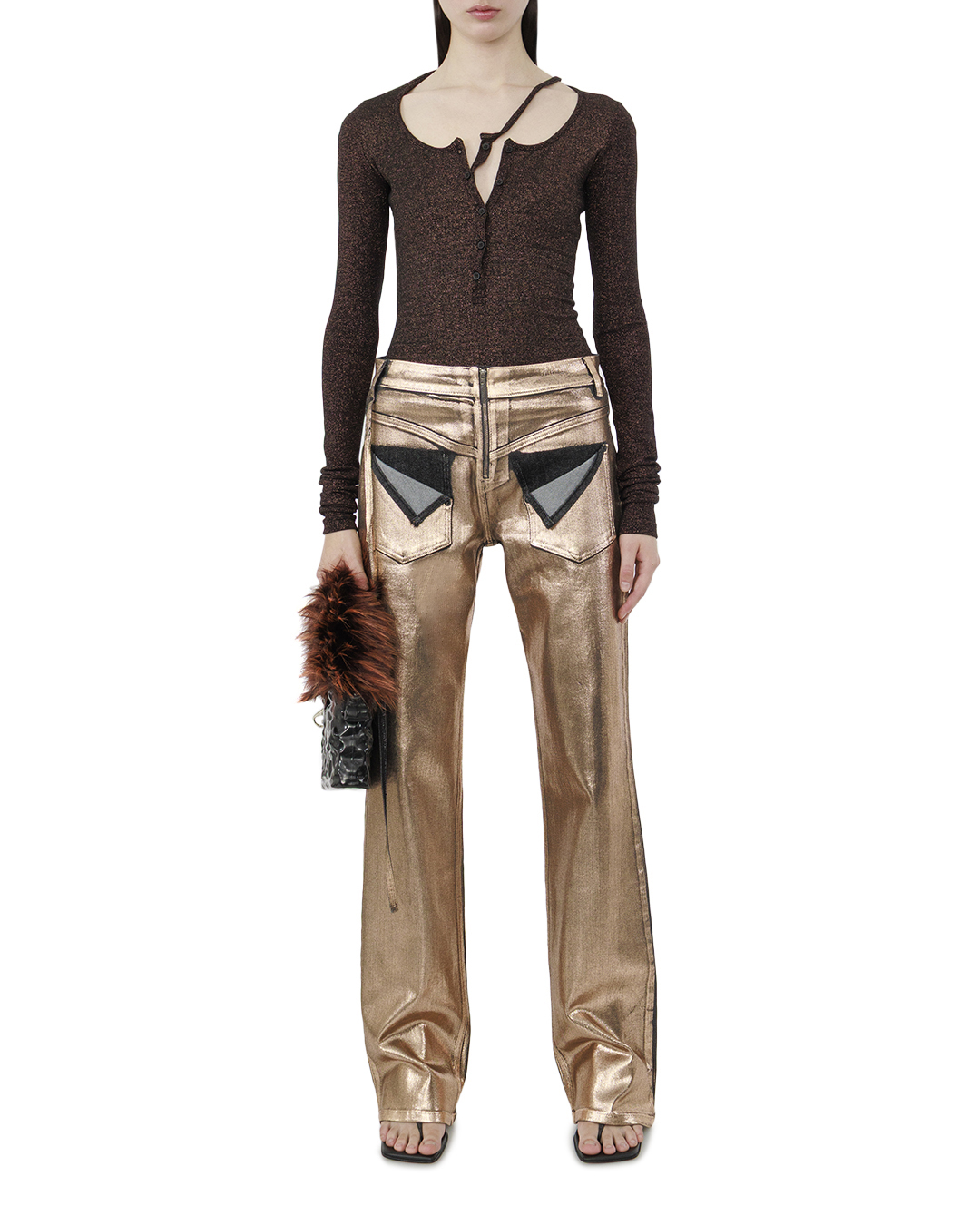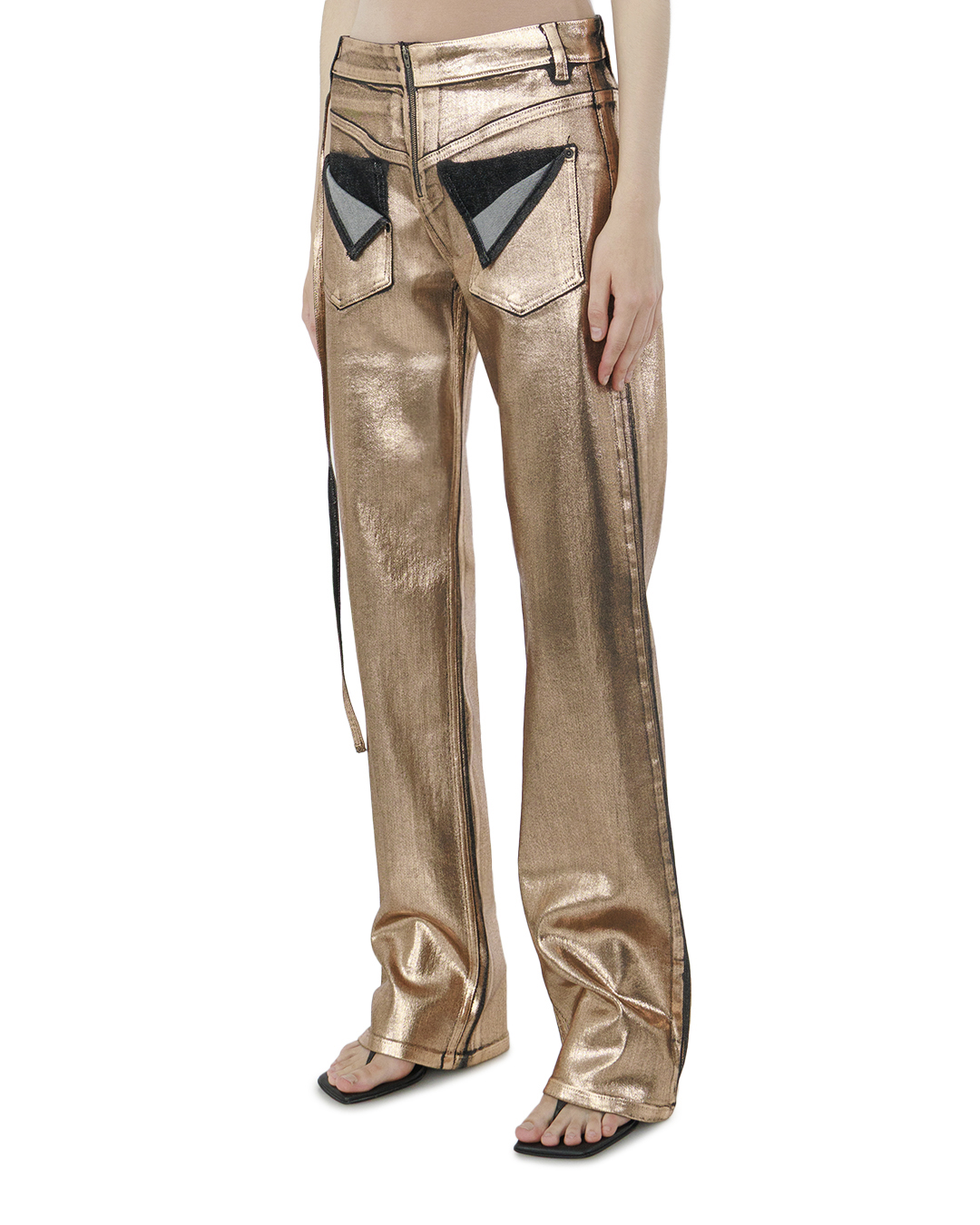Эти джинсы — яркий пример смелой модной интерпретации и современного глама. Изготовленные из прочной ткани с металлизированным покрытием, они мгновенно привлекают внимание и создают уникальный стильный образ. Классический крой с прямыми штанинами сохраняет комфорт и универсальность, позволяя джинсам быть подходящими для различных случаев — от повседневного выхода до вечернего мероприятия. Металлизированный золотистый оттенок придает изделию роскошный вид, становясь центральным акцентом и выделяя владельца на фоне других. Креативные детали, такие как декоративные молнии и контрастные вставки на карманах, добавляют джинсам нотку авангарда и индивидуальности, создавая смелый и стильный акцент. Тщательно обработанные швы и качественная отделка гарантируют долговечность и износостойкость, подчеркивая высокое качество исполнения. Эти джинсы станут настоящим модным заявлением в вашем гардеробе, вдохновляя на создание запоминающихся образов с трендовым звучанием.