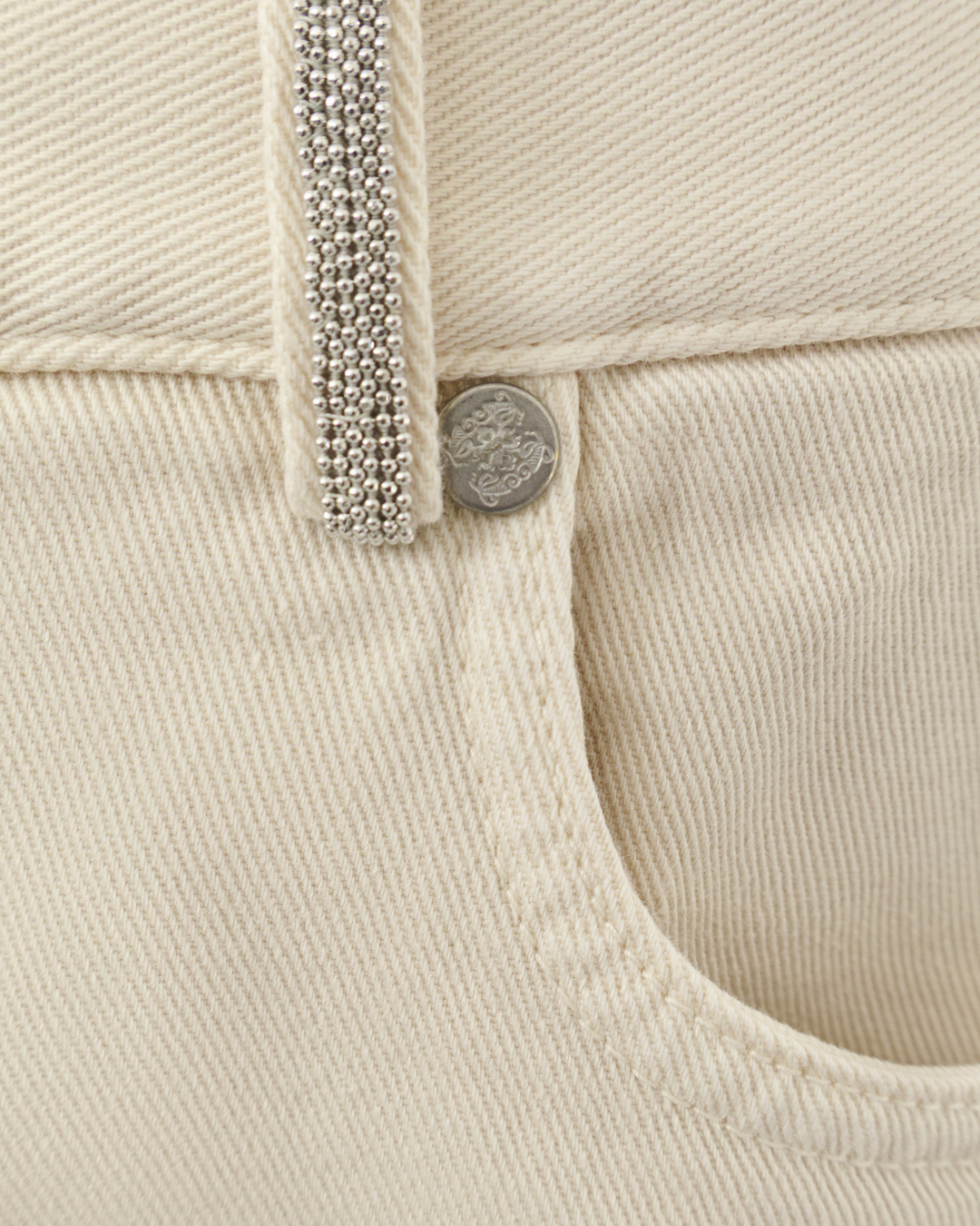 Эти джинсы представляют собой изысканное сочетание современной эстетики и комфортного дизайна. Выполненные в актуальном светлом оттенке, они вносят свежесть и лёгкость в любой гардероб, делая образ стильным и актуальным. Свободный крой со слегка зауженными штанинами обеспечивает расслабленную посадку и лёгкость движений. Высокая линия талии визуально удлиняет силуэт и подчёркивает женственные формы, придавая фигуре утончённость. Классическая фронтальная застёжка на металлическую пуговицу и молнию добавляет практичности, сохраняя при этом элегантную линию передней части. Прострочка выполнена в тон джинсам, создавая аккуратный и гармоничный вид. Функциональные боковые и задние карманы обеспечивают удобство, а усиленные заклёпки добавляют долговечность и детализированность. Отсутствие яркой декорации сохраняет минималистический стиль, позволяя акцентировать внимание на безупречном крое и качестве ткани. Эти джинсы — идеальный выбор для повседневного гардероба, предлагающий множество возможностей для сочетания и позволяющий создавать как повседневные, так и более элегантные образы.