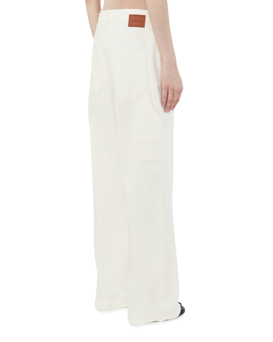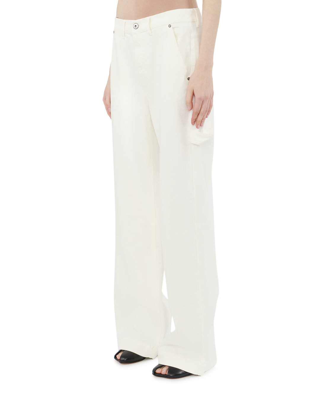Эти белоснежные джинсы — воплощение утончённой лаконичности и современного шика. Свободный крой с лёгким расширением к низу создаёт эффектный силуэт, который одновременно расслаблен и собран. Высокая посадка деликатно подчёркивает линию талии, визуально вытягивая фигуру и придавая образу элегантность. Ткань выглядит благородно: чистый белый оттенок с едва уловимой текстурой денима придаёт изделию свежесть и лёгкость. Детали отделки выполнены с безупречной тщательностью — прострочка по швам ровная, аккуратная, без излишнего акцента, что подчёркивает минималистичный характер модели. Карманы оформлены сдержанно, без вычурных элементов: контуры чёткие, посадка ровная, что сохраняет общую гармонию дизайна. Пояс усилен дополнительной строчкой, которая не только украшает, но и обеспечивает надёжность конструкции, надёжно фиксируя посадку на теле. Классическая застёжка на пуговицу сочетает практичность с эстетикой, а петли для ремня добавляют функциональности без ущерба для лаконичности. Особенный шарм модели придаёт небольшой декоративный элемент сбоку — он вносит лёгкую нотку игривости, не нарушая общей сдержанности образа. Нижний край штанин обработан аккуратно, без подгиба, что подчёркивает минимализм и делает джинсы универсальными для разных стилистических решений. Эти джинсы легко станут центральным элементом гардероба: они одинаково хорошо смотрятся как с лаконичными топами, так и с объёмными свитерами, позволяя создавать стильные, сбалансированные образы для любого случая. Чистота линий, безупречная отделка и благородство оттенка делают эту модель настоящим украшением гардероба.